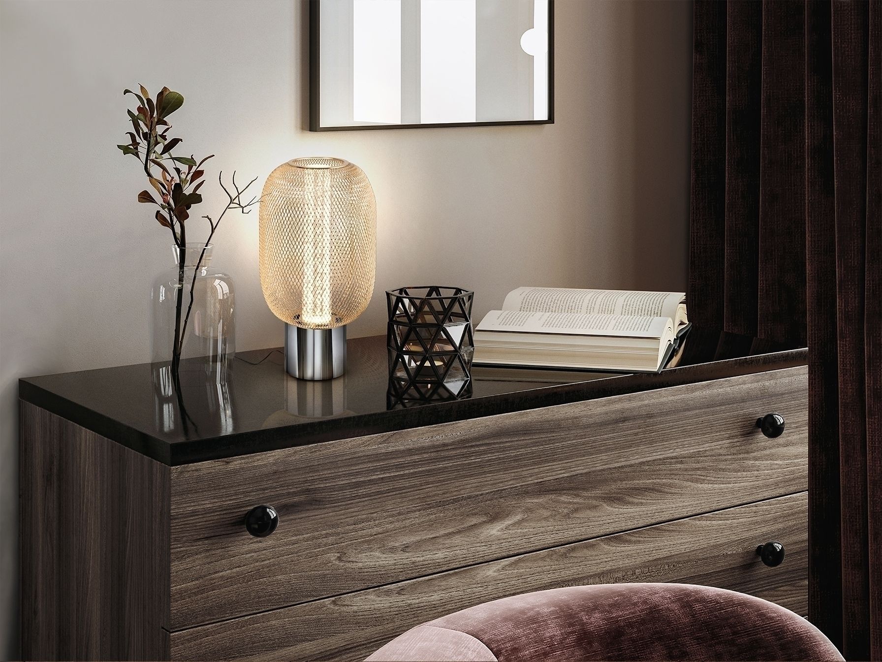 Настольная лампа на 1 лампу из хромированного металла. Двойной абажур с внутренним прозрачным акриловым цилиндром с пузырьками и внешним овалом из металлической сетки яркого золота. Светодиод 5 Вт, 450 лм, 3000 К. DIMMABLE.