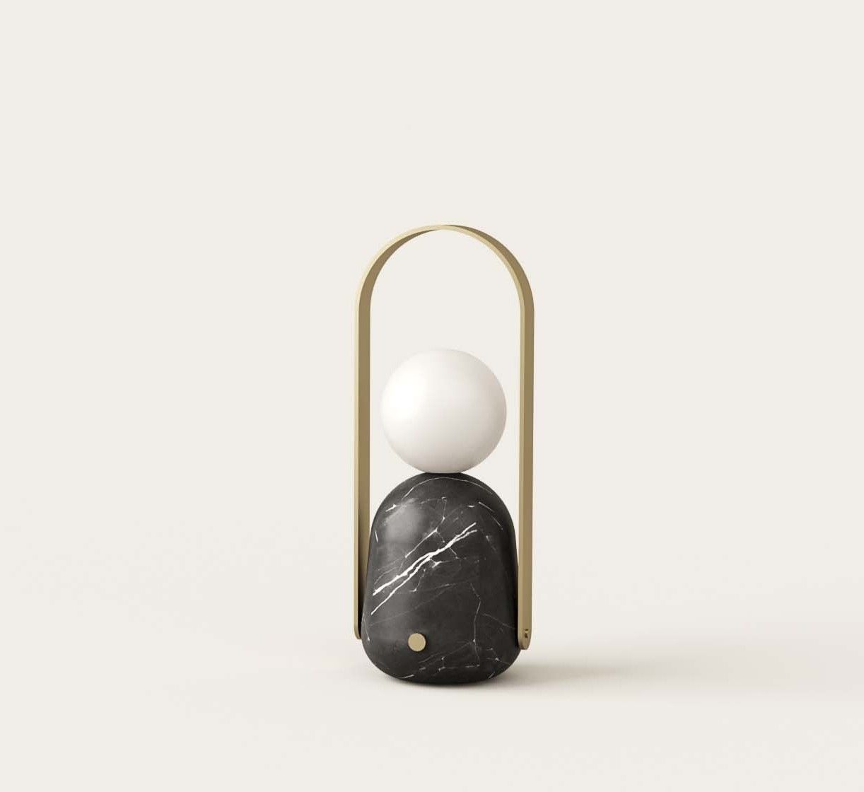 Настольная лампа, выполненная из стали и мрамора в матовой черной и латунной отделке с плафоном из опалового стекла. Беспроводное зарядное устройство в комплекте.