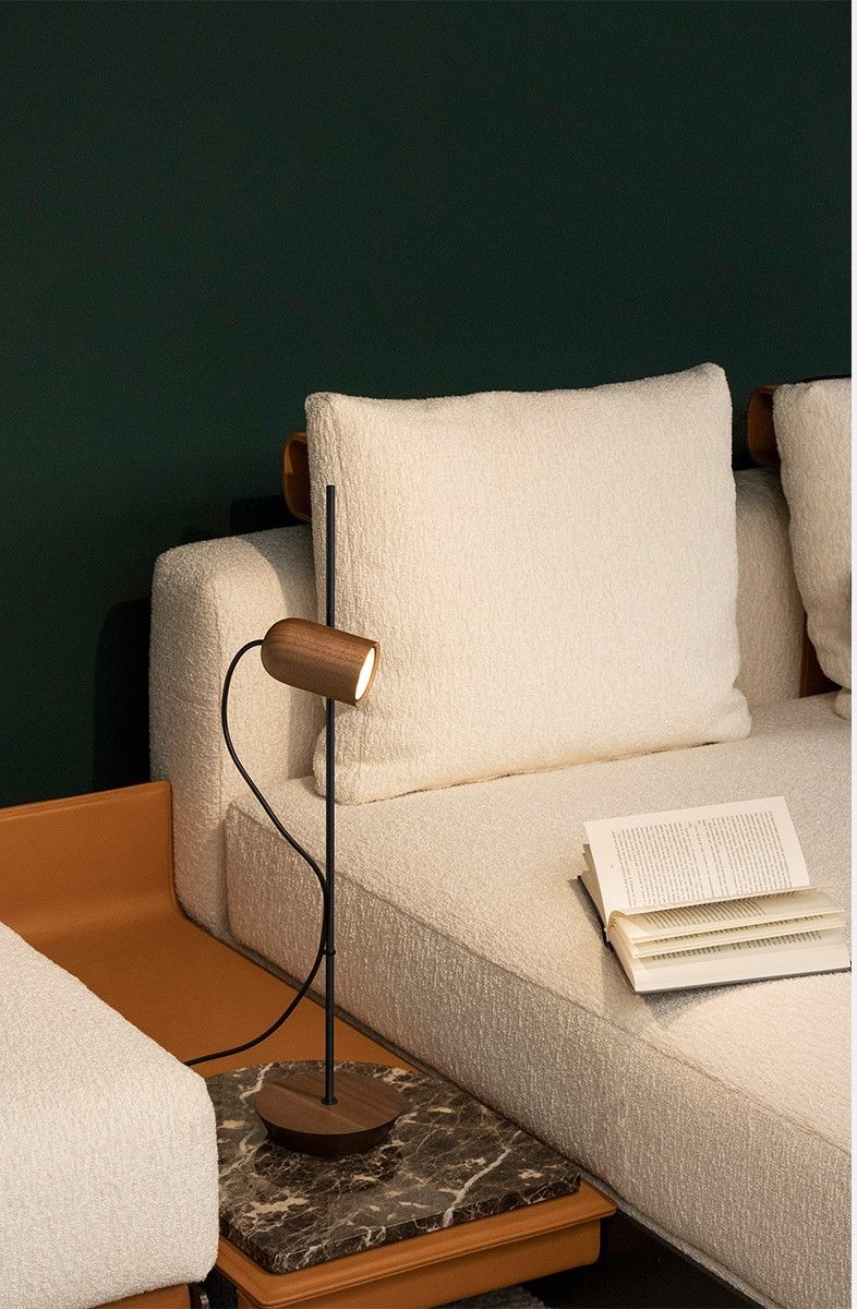 Этот дизайн сочетает в себе металлический корпус с латунной или графитовой отделкой, точечный светильник и основание из дерева грецкого ореха, дуба или черного ясеня - материала, подчеркивающего естественность и теплоту света. Лампа воплощает в себе оригинальную идею на основе магнита, которая позволяет легко фокусировать и направлять свет.