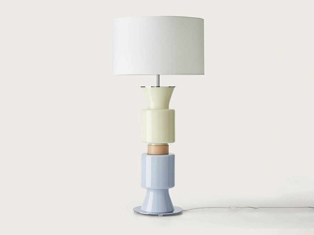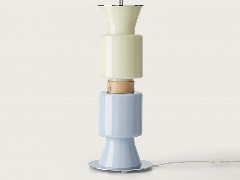 Дизайнерское основание настольной лампы со стальной конструкцией в золотом, хромированном, черном или белом исполнении с двумя элементами из цветного стекла и декоративным элементом из натуральной кожи. Вы можете добавить к нему абажур.