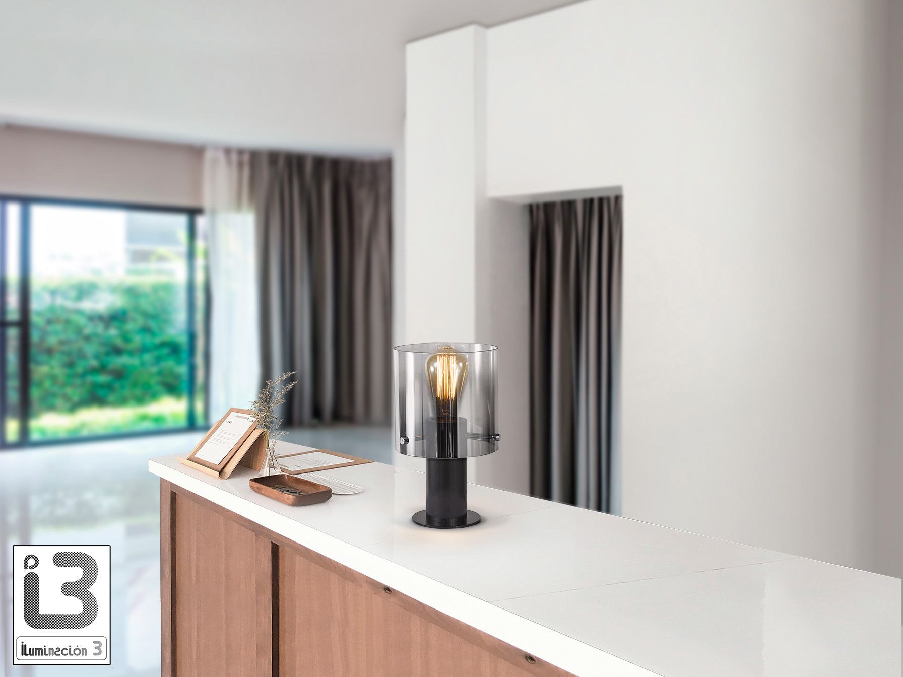 Настольная лампа из металла, покрытого матовым чёрным лаком. Абажур из дымчатого стекла. Цоколь E27.