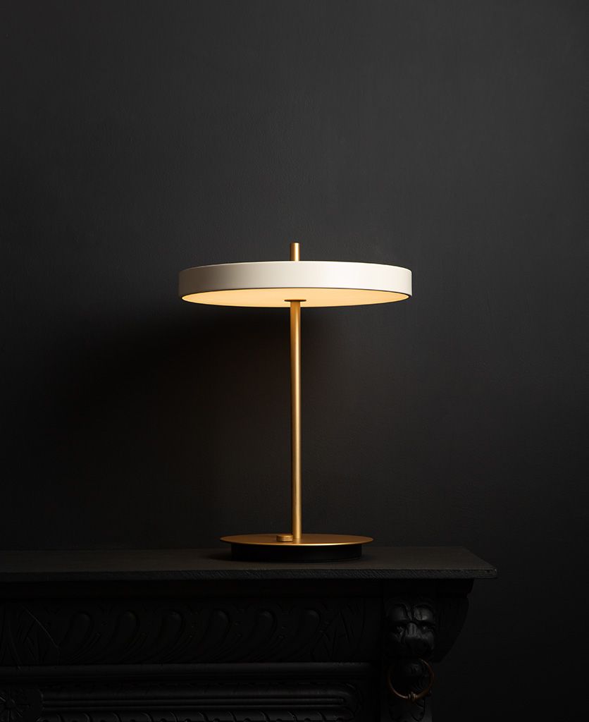 Элегантный настольный светильник Asteria новинка 2019 г. Вертикальный латунный стержень визуально балансирует верхний и нижний диск делая акцент на чистой  и завершенной форме светильника.