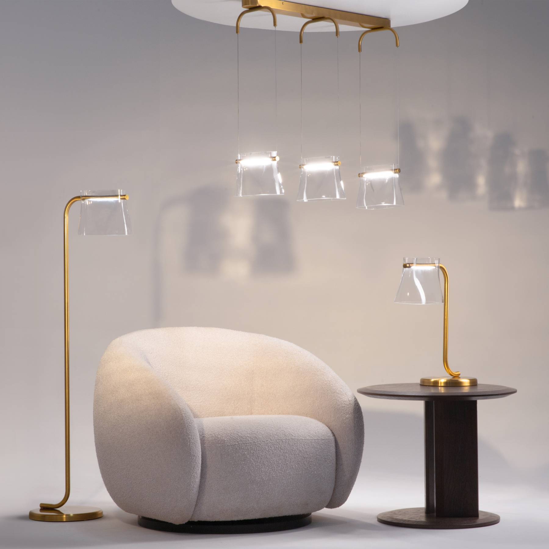 Цвет металлической арматуры — латунь с сатинированным финишем, плафоны — прозрачное стекло. Источник света: LED. Цветовая температура светильников 3000К, угол рассеивания — 120 градусов. Настенные бра и подвесные светильники оснащены регулируемым проводом длиной до 3 метров, что позволяет использовать их в помещениях с высокими потолками.