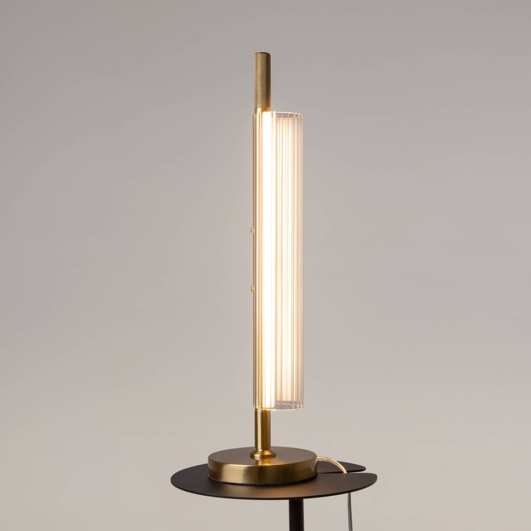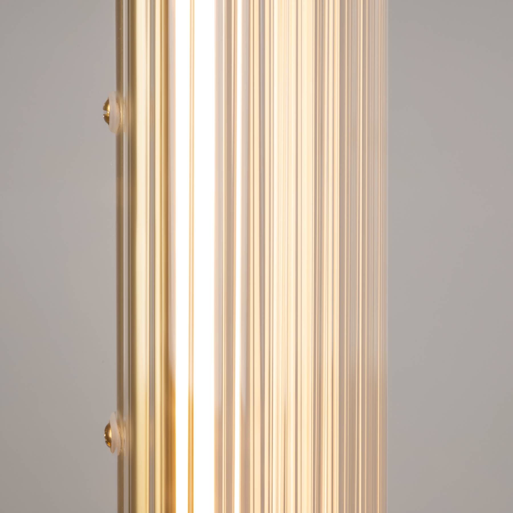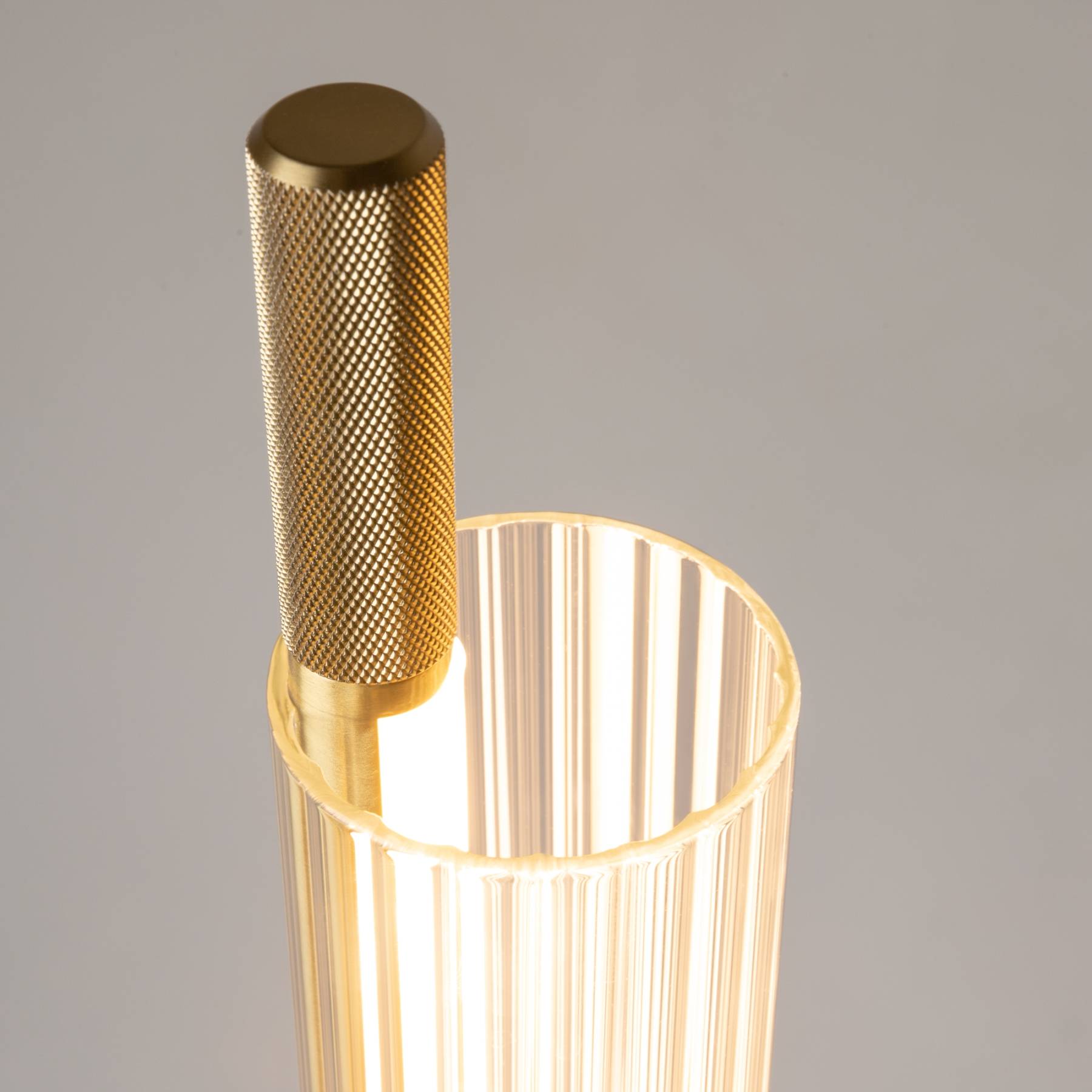 Арматура из металла, цвет - латунь с сатиновым финишем. Плафон из рифленого прозрачного стекла. LED-источник света. Теплая цветовая температура 3000К. Регулируемый по длине провод 3 метра у подвесного светильника. Подходит для помещений с высокими потолками. Торшер с push-кнопкой на проводе для удобного включения и выключения.
