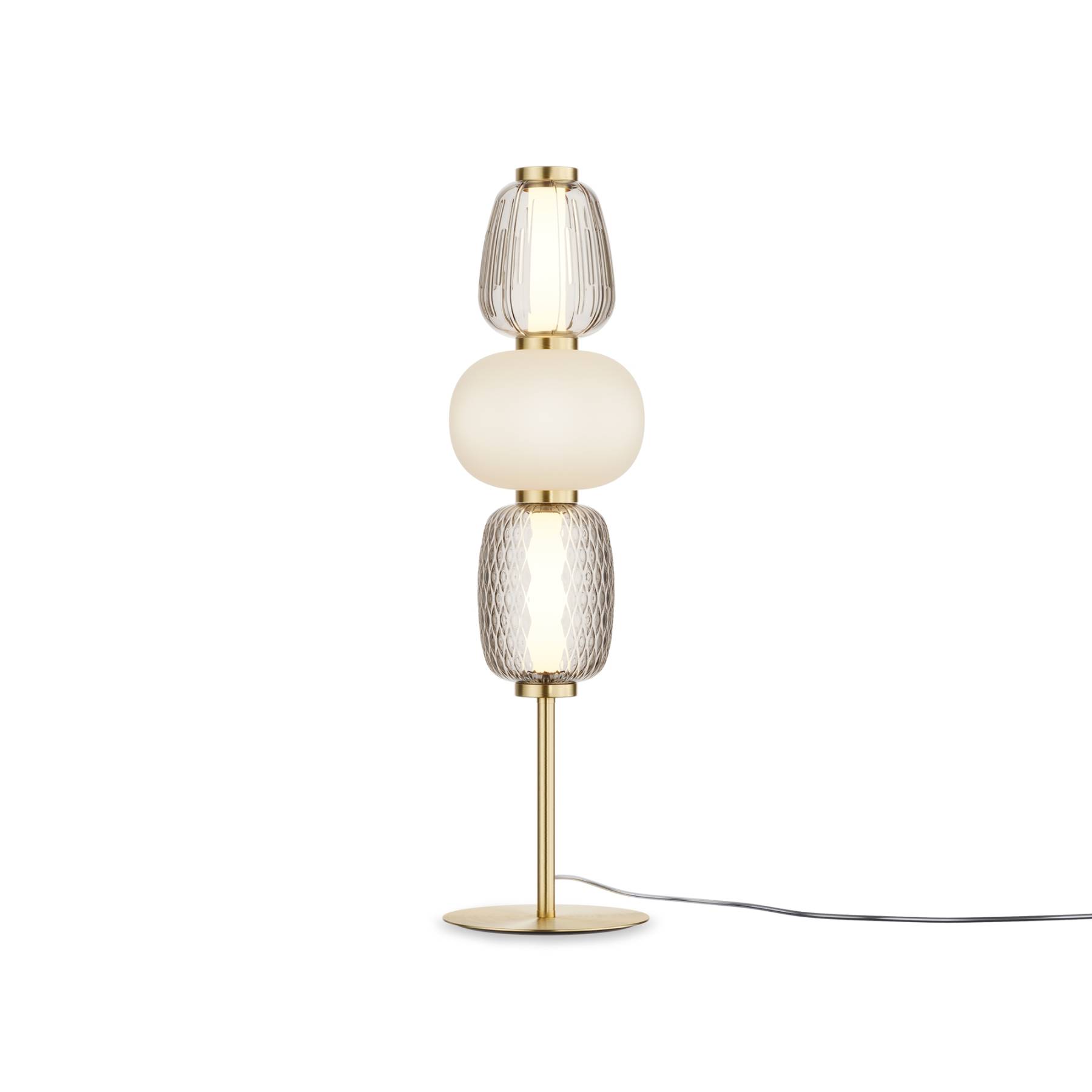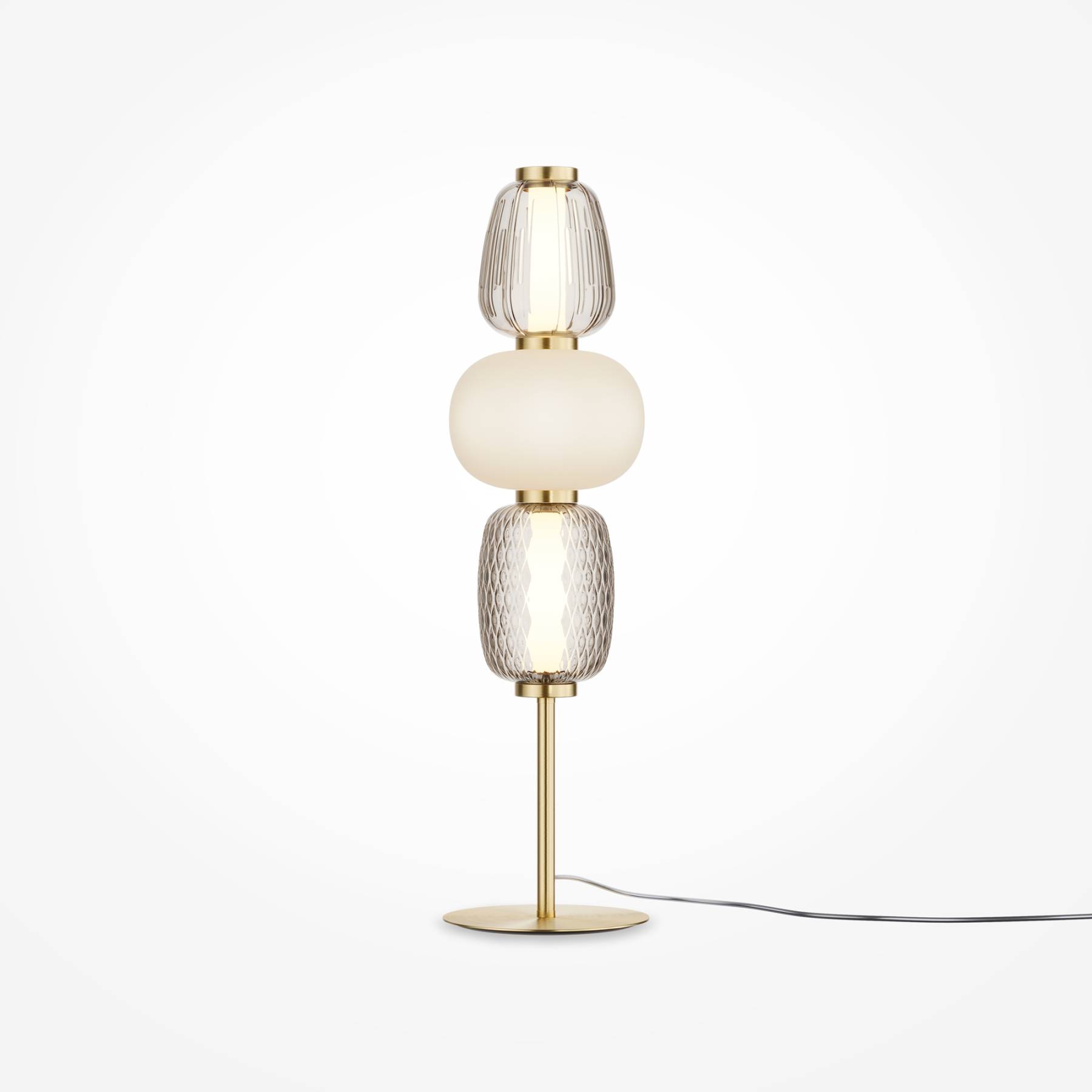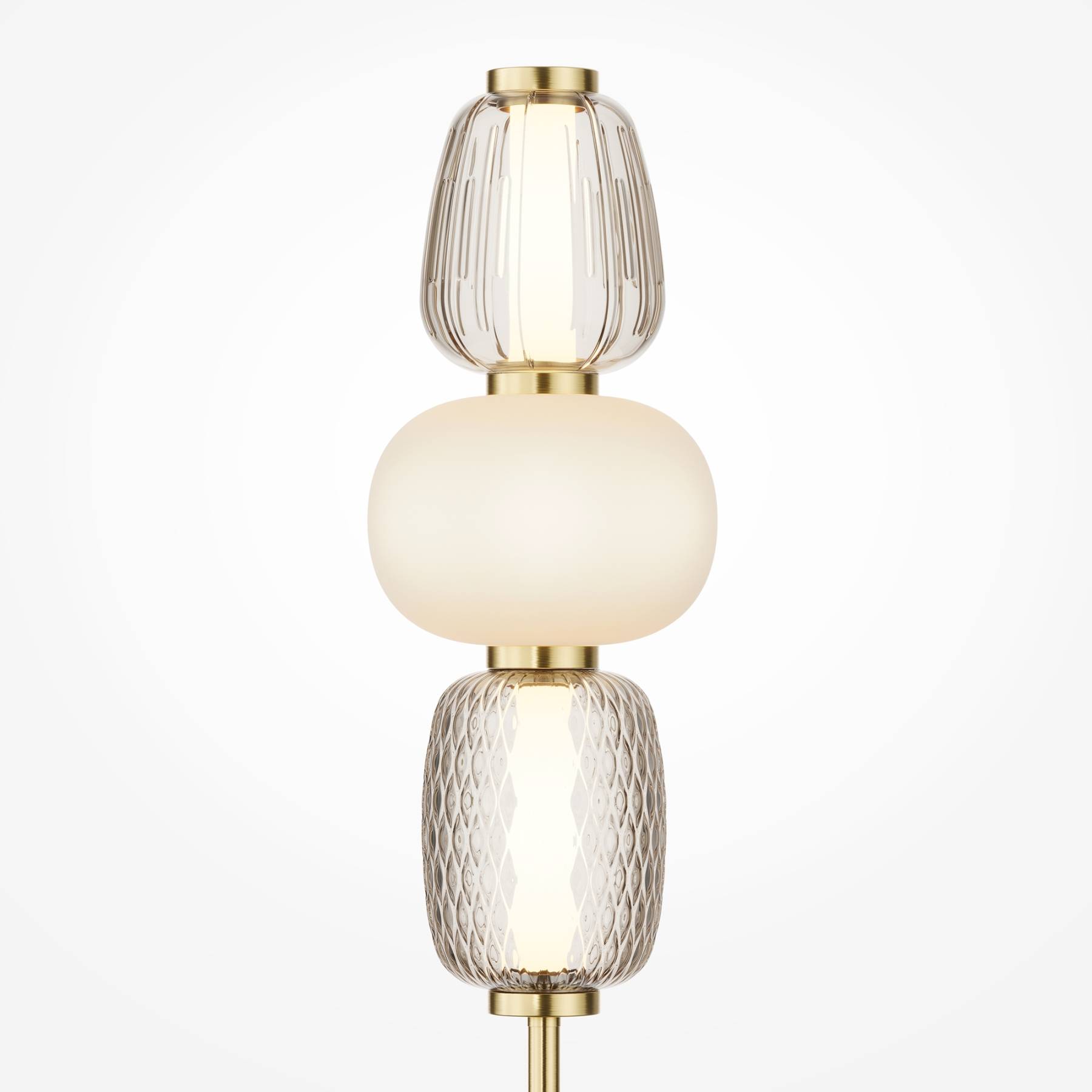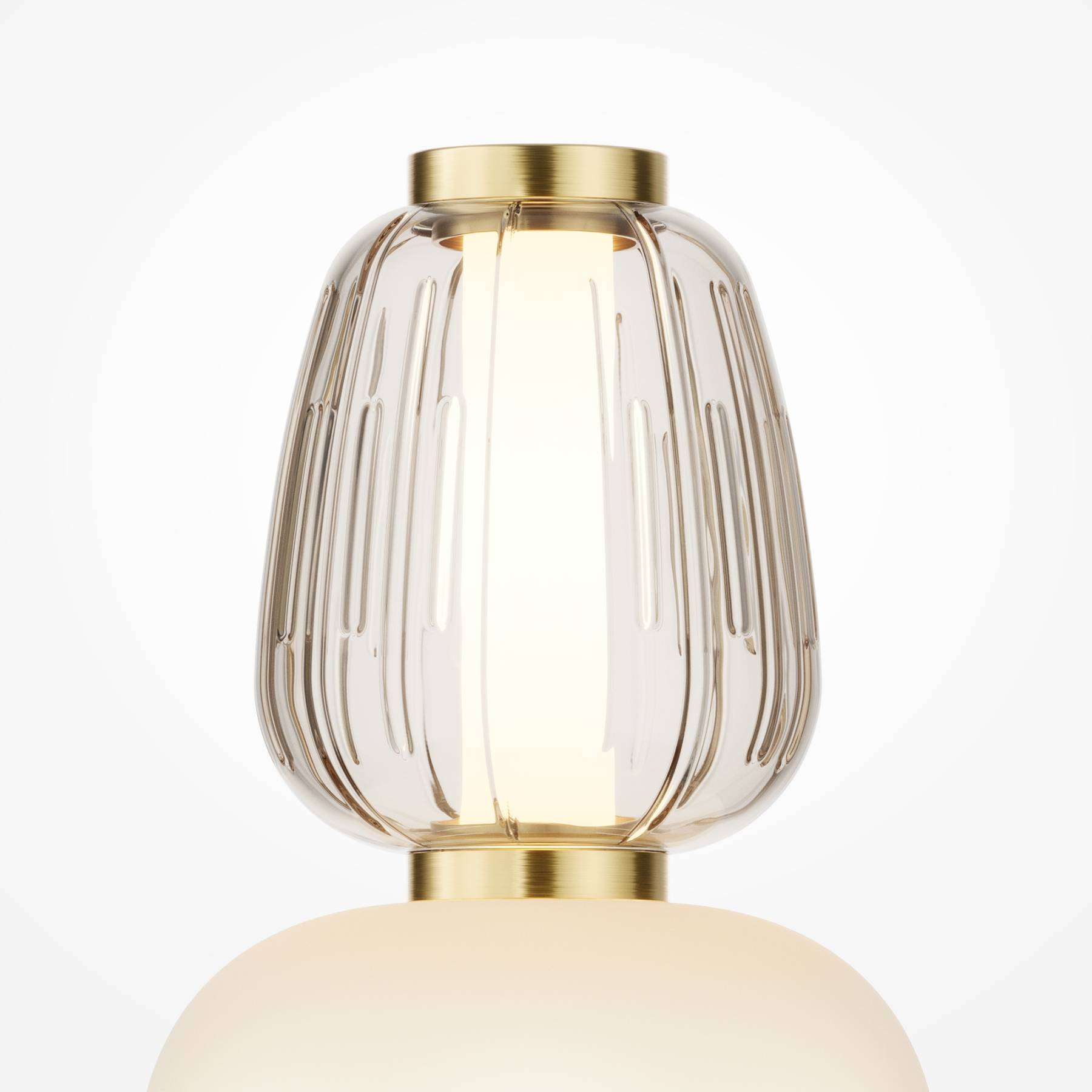 Металлическая арматура, цвет - золото, хром. Микс плафонов округлых и вытянутых форм из белого матового и прозрачного стекла с сетчатым и с линейным повторяющимся рельефным рисунком. Регулируемая высота подвесных моделей, провод - 3 метра. LED-источник света, цветовая температура 3000К.