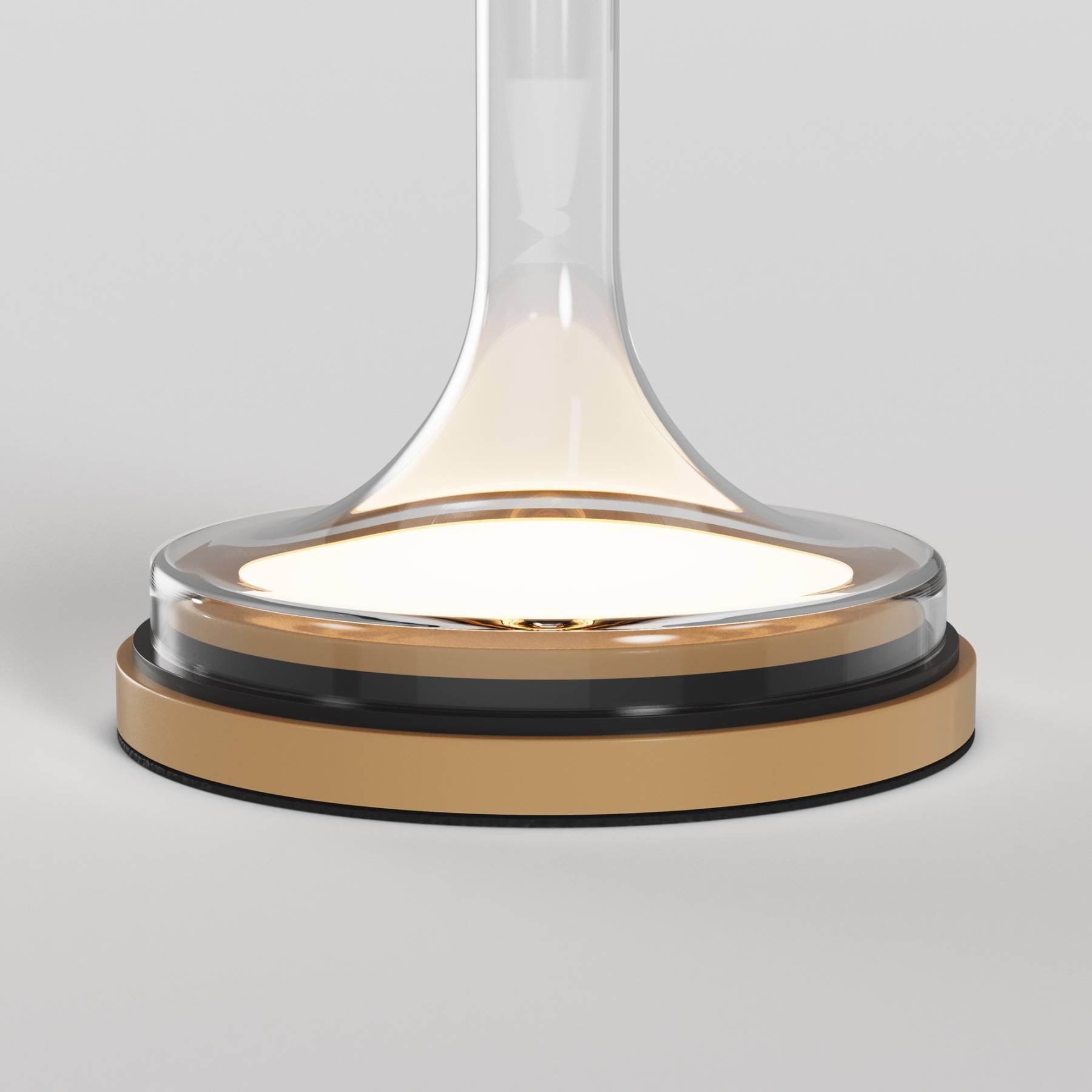 Материал арматуры - металл, плафонов — литое стекло с гальваническим покрытием и эффектом градиента. Три цветовых решения: черное основание и дымчатый абажур, золотое основание и золотой абажур, белое основание и белый абажур. LED-источник света с цветовой температурой 3000К и углом рассеивания 120° обеспечивает комфортное рассеянное освещение. Инновационный тач-сенсор на проводе настольной лампы позволяет диммировать световой поток. Уникальная конструкция создает эффект парения плафона, направляя свет вниз при отражении от стекла. Серия дополнена элегантными подвесами, расширяя возможности дизайна освещения.