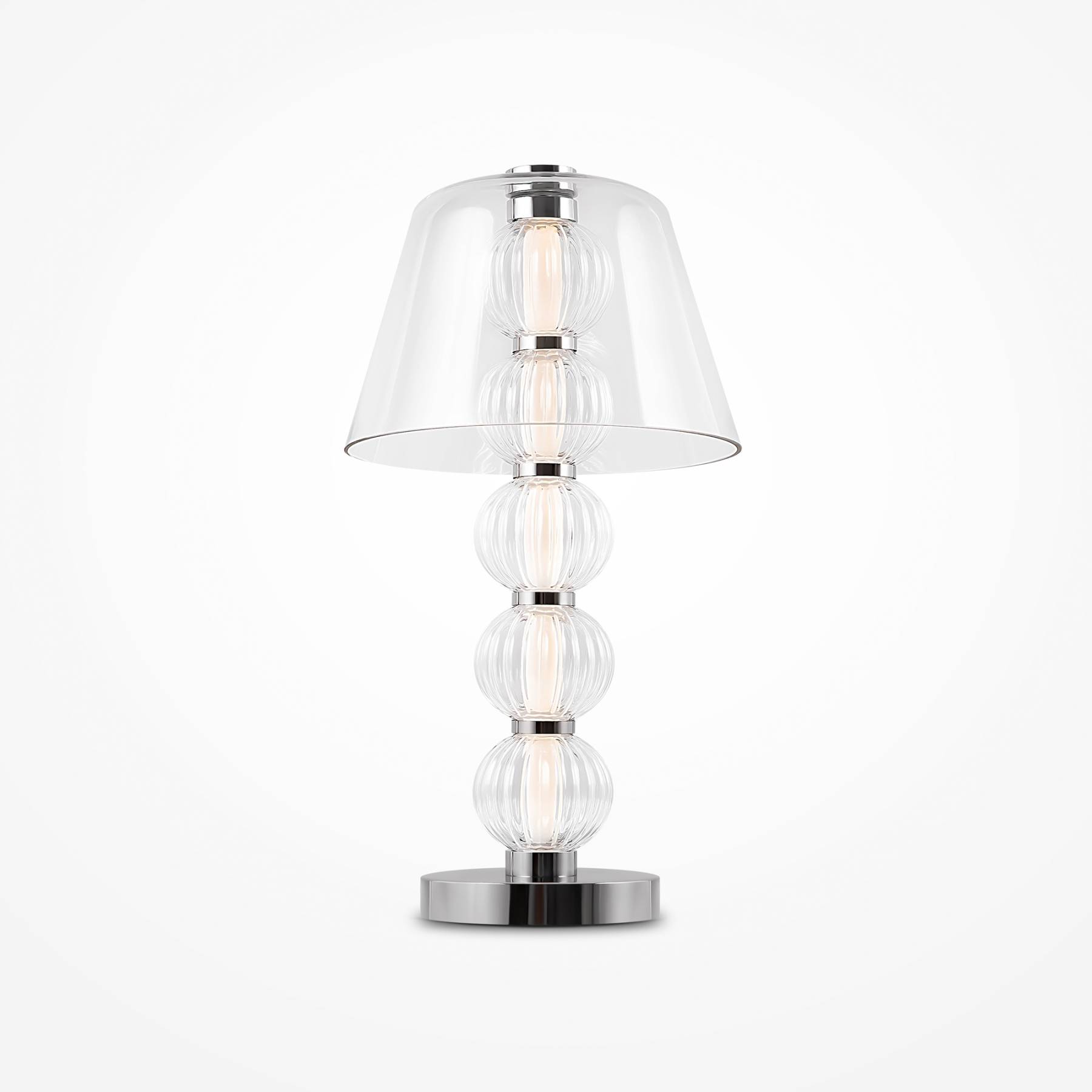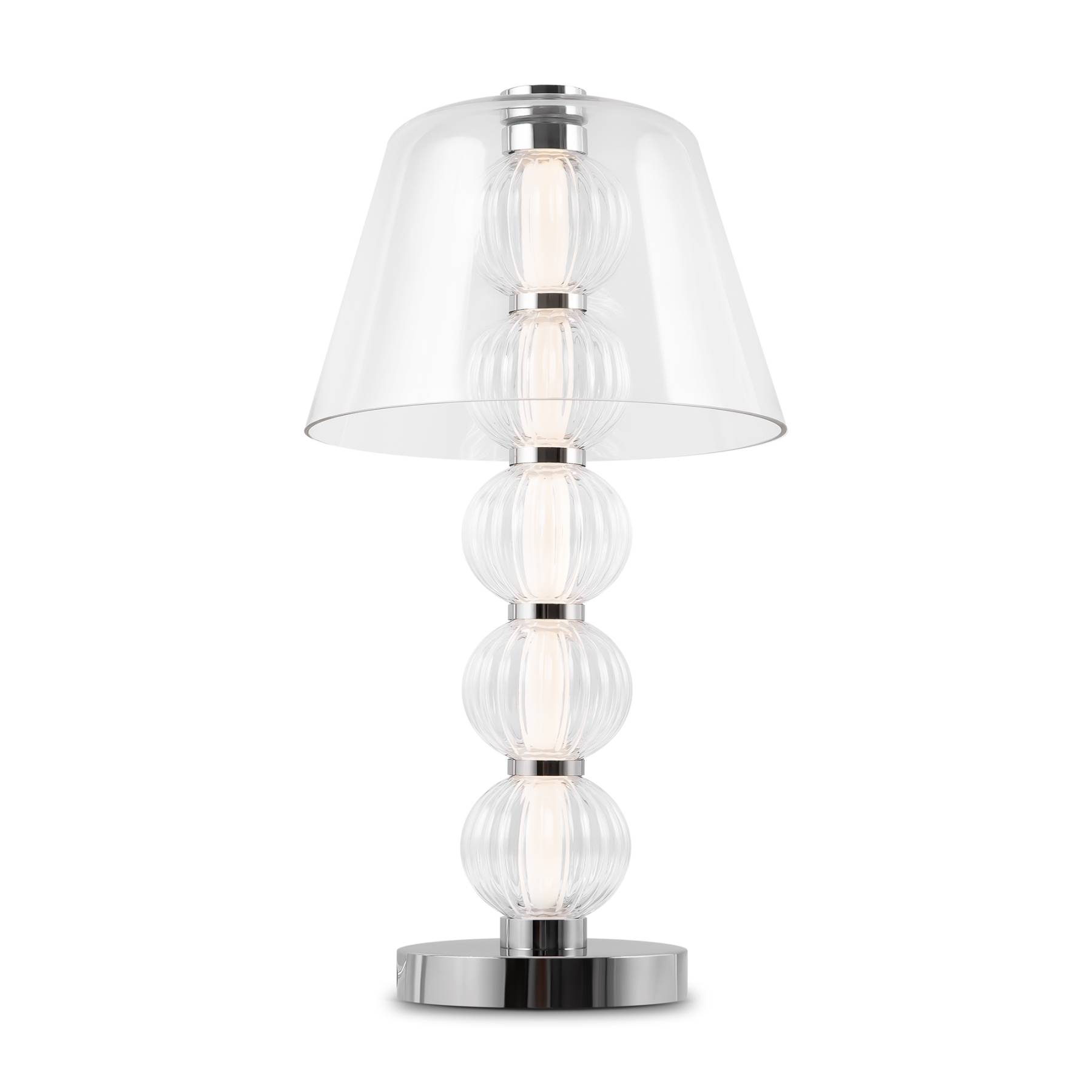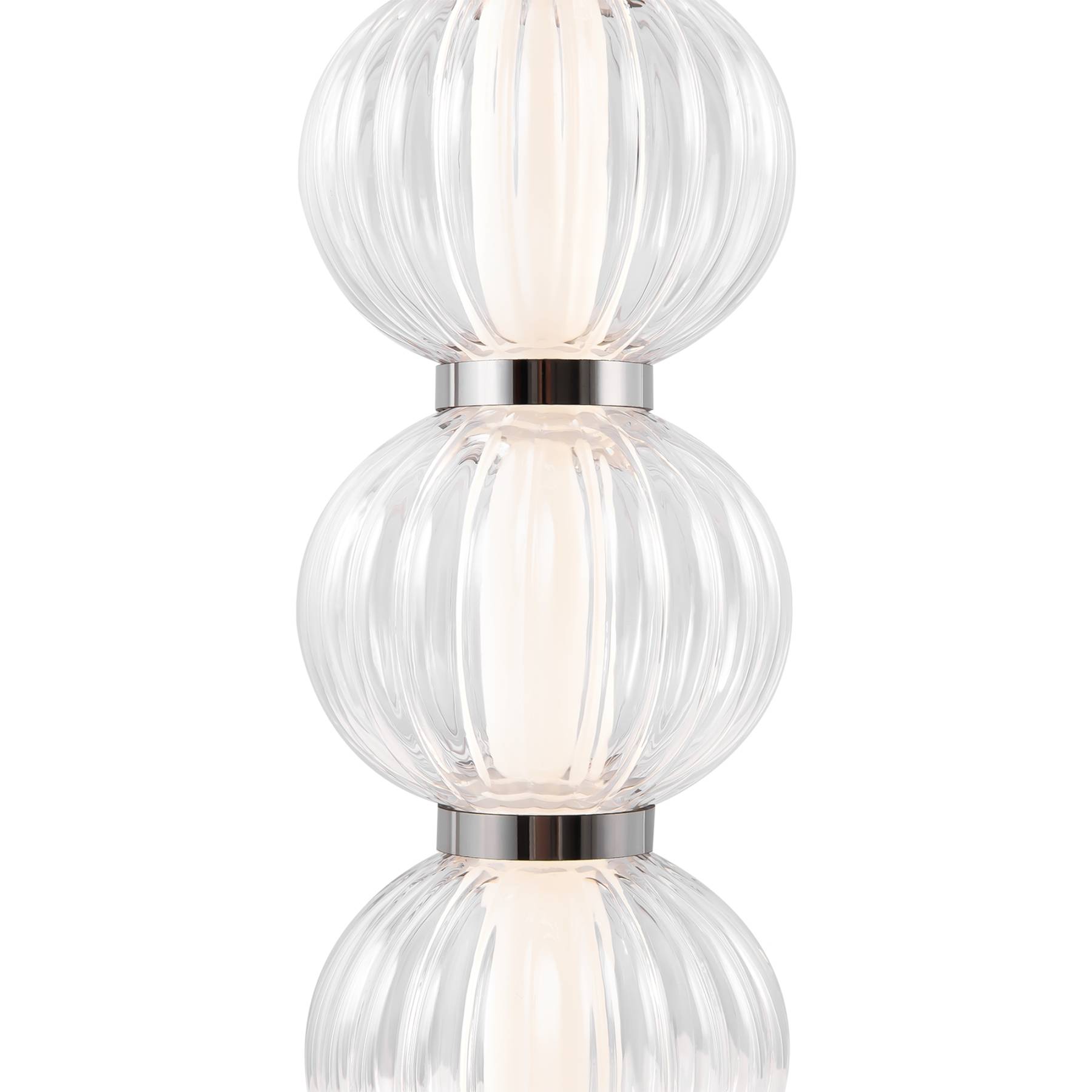Арматура из металла, цвет – хром. Акцентный декор в виде рельефных сфер из литого стекла. Источник света – светодиодная лента – скрыта под акриловым рассеивателем. Регулируемая высота подвесных светильников.