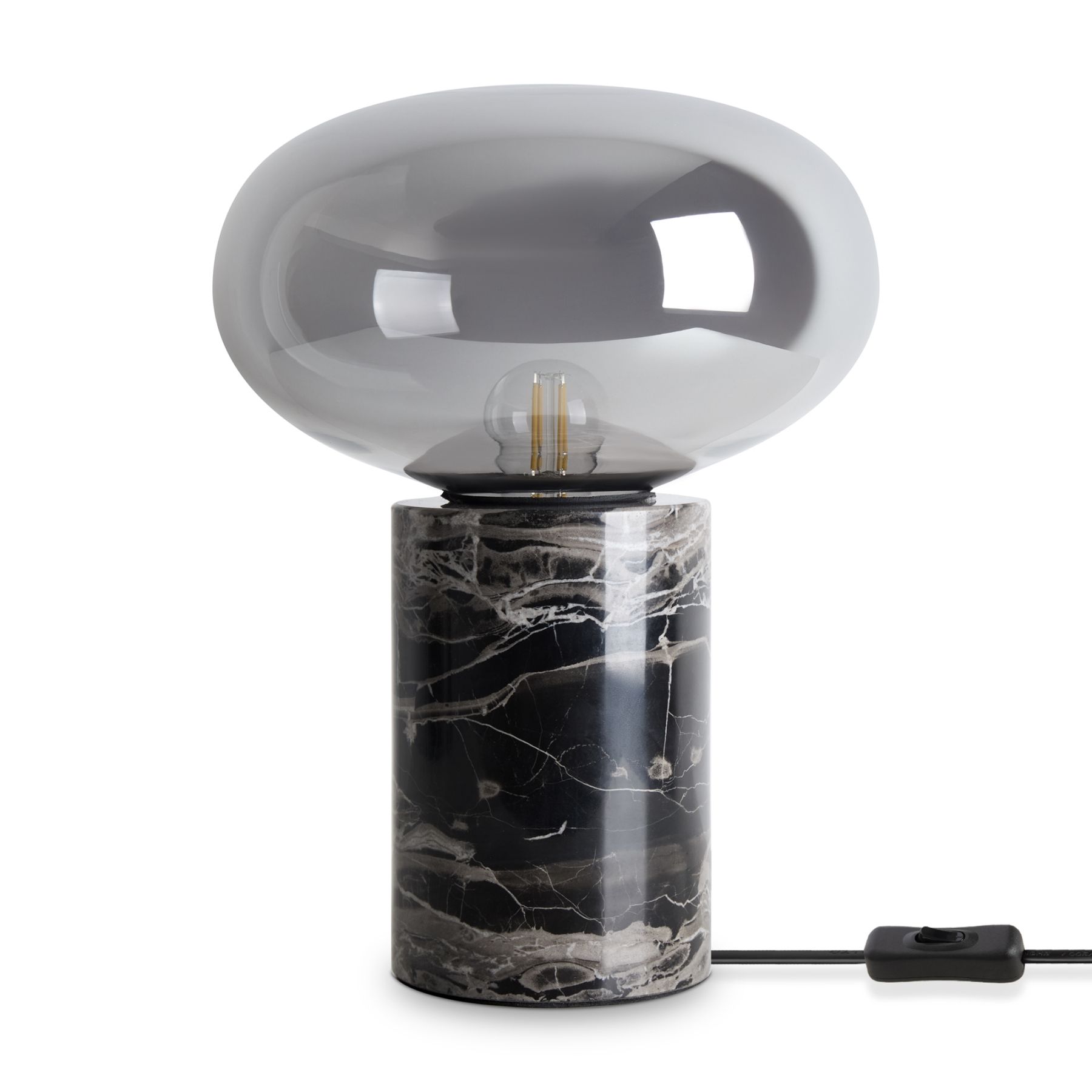 Материал основания мрамор натуральный, цвет — черный со светло-серыми прожилками. Плафон из гальванизированного серого стекла. Компактный размер настольной лампы из мрамора и стелка идеально впишется в интерьеры в современном и midcentury стиле.