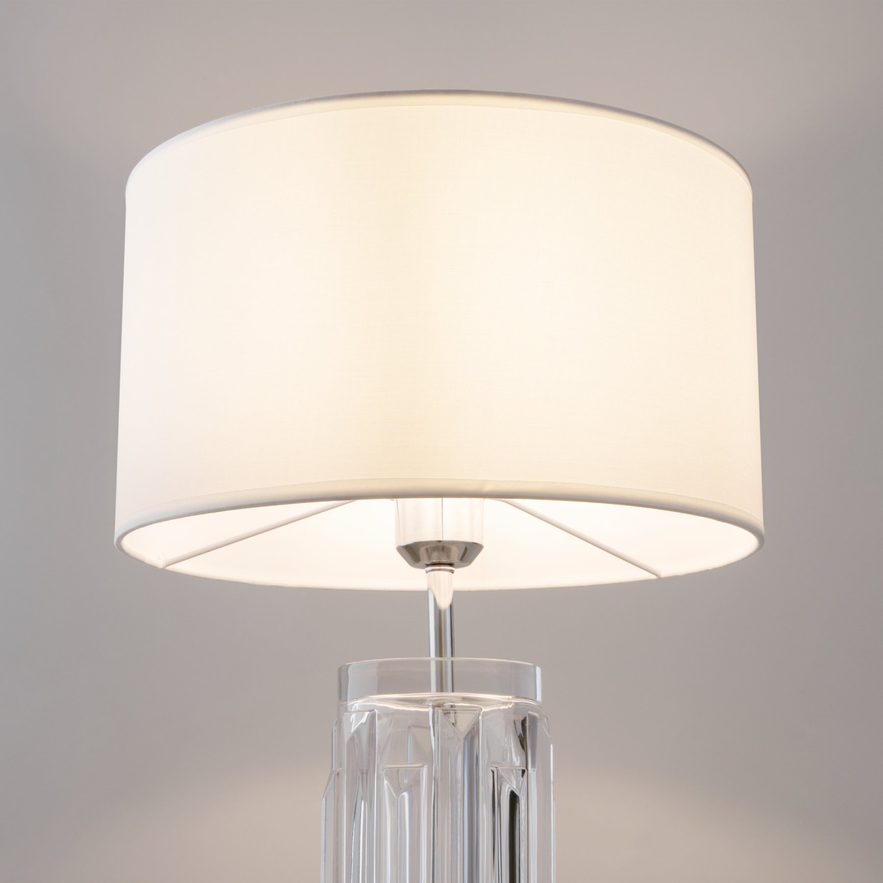 Металлическое основание - дополнено скульптурным литым стеклом в трех оттенках: прозрачном, дымчатом и пудрово-розовом. Хлопковый абажур белого цвета. Цоколь Е27.