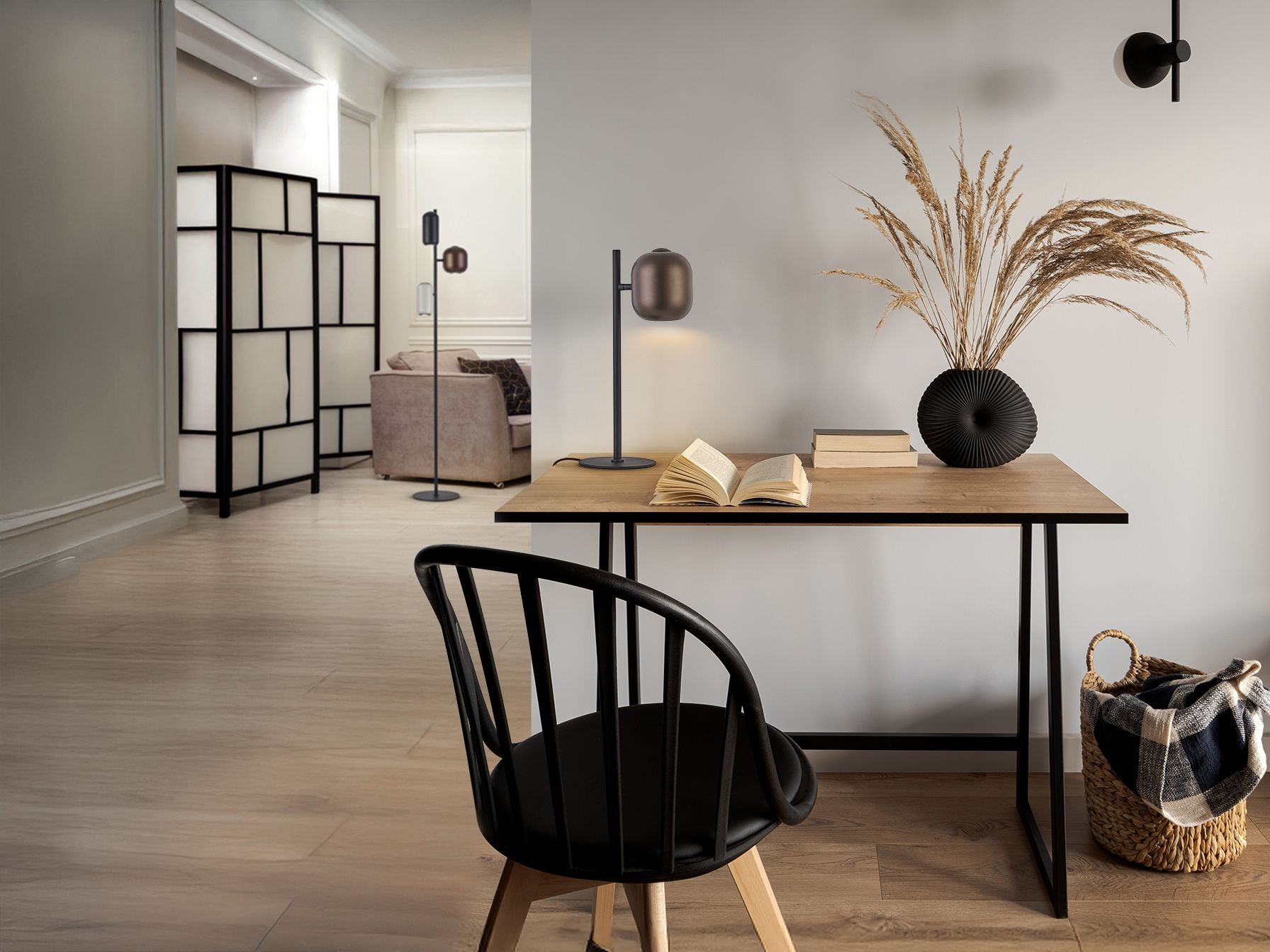 Настольная лампа из металла матово-черного цвета. Абажур металлический темно-коричневого цвета. Патрон GU10.