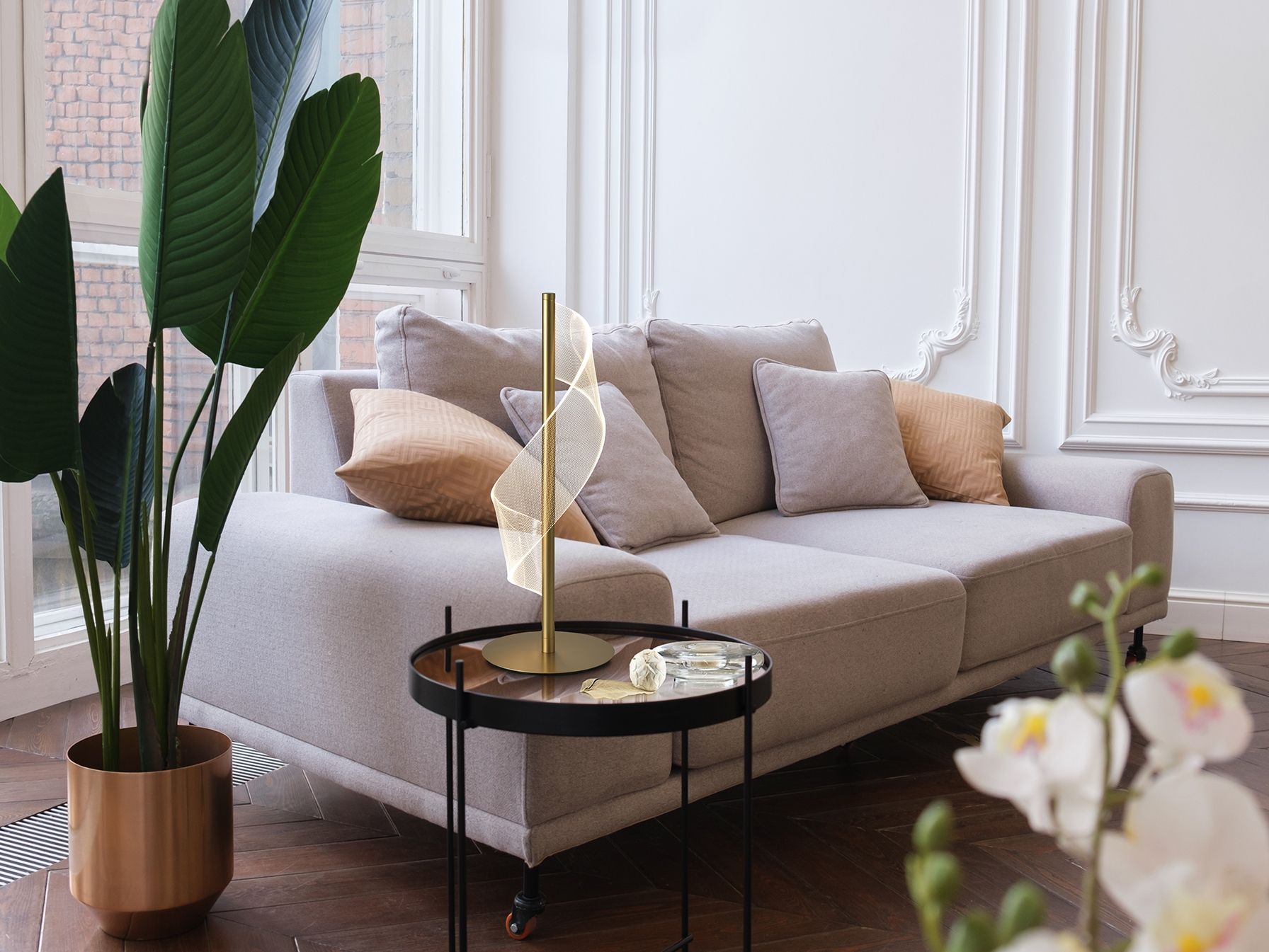 Настольная лампа из металла и алюминия, матовое золото. Рассеиватель из литого метакрилата с микропечатью. Светодиод 8,5 Вт, 470 лм, 3000 К.