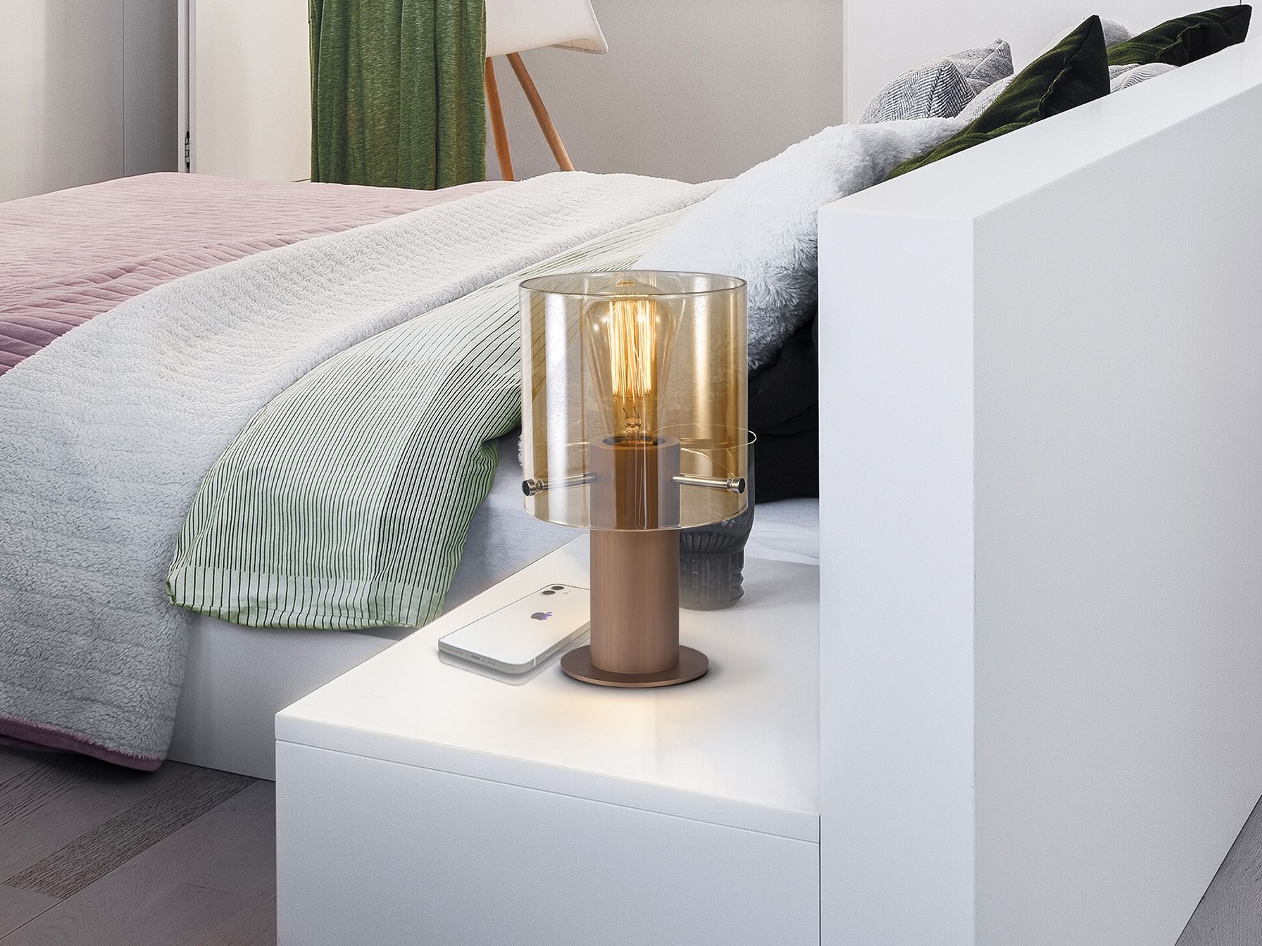 Настольная лампа из металла с покрытием из сатинированной меди. Абажур из янтарного стекла. Текстильный провод. Патрон E27.