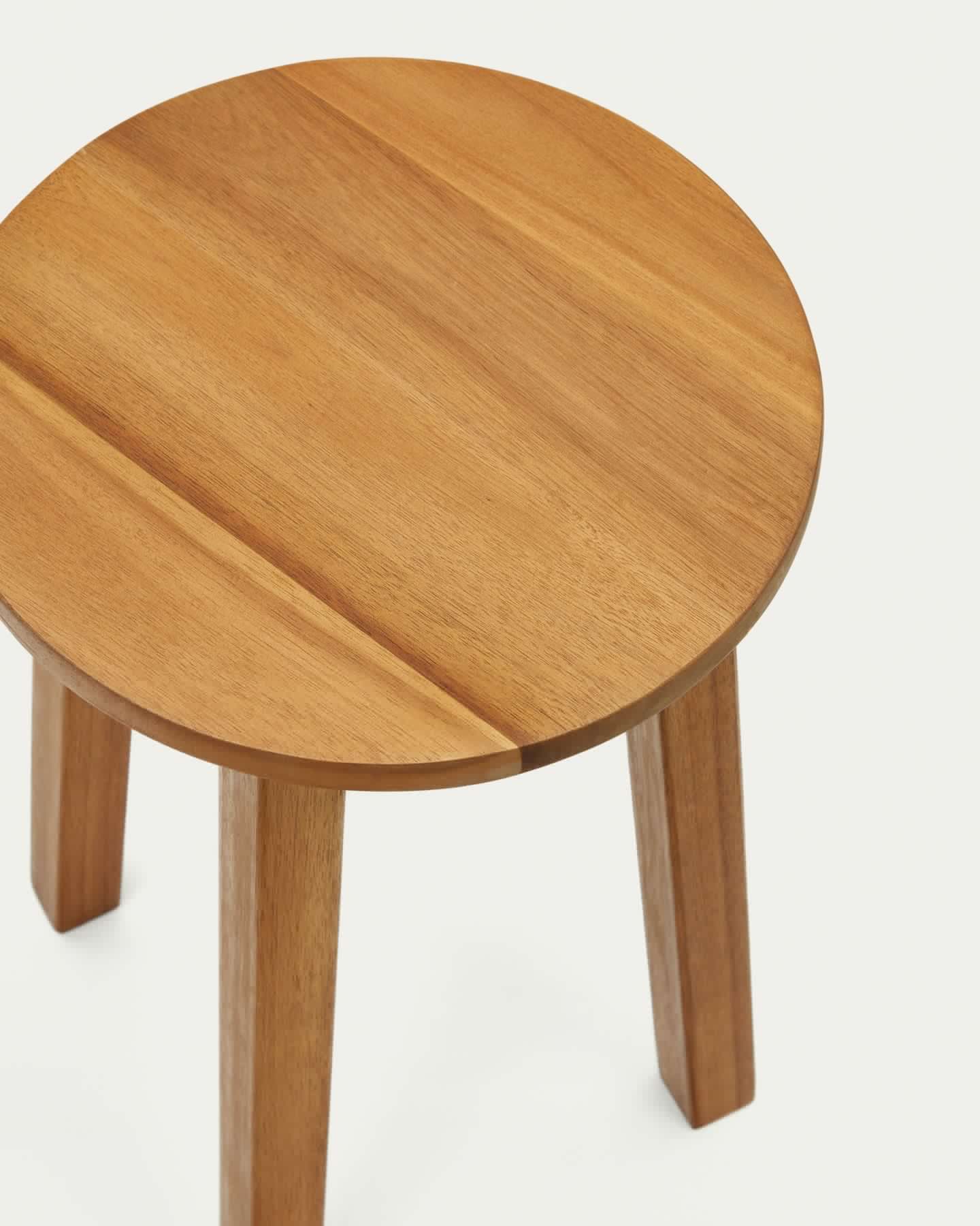 Табурет круглый, полностью сделан из массива акации. Дерево сверху покрыто прозрачным лаком, который защищает от негативных атмосферных воздействий.