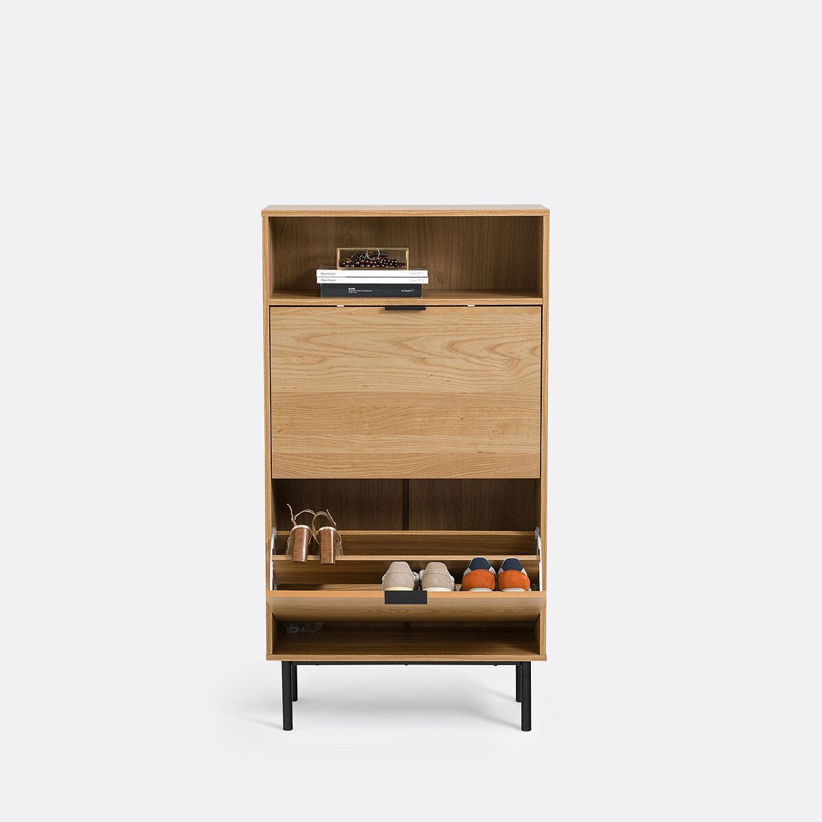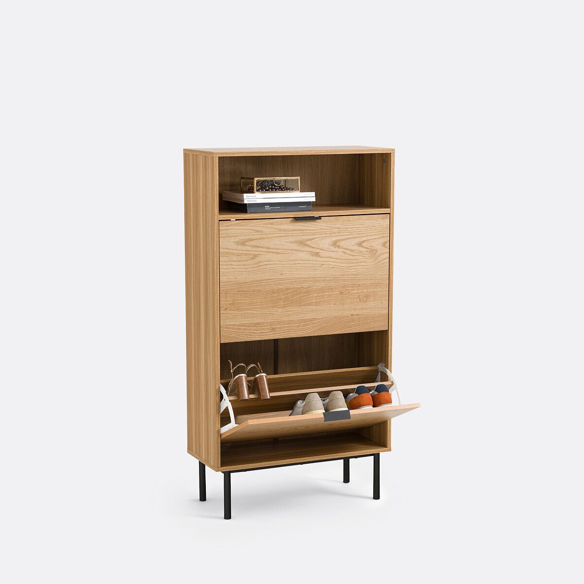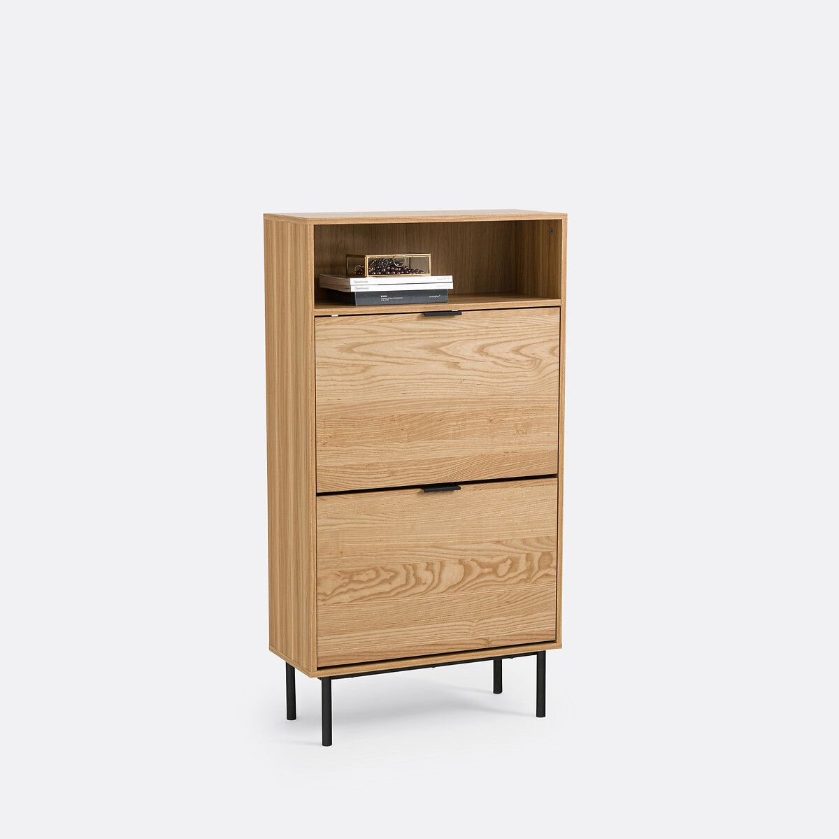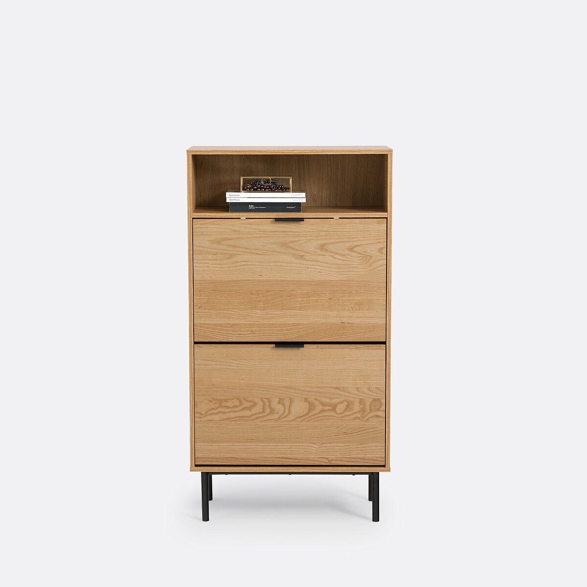 — Одна открытая ниша сверху и две откидные дверцы из МДФ со шпоном ясеня