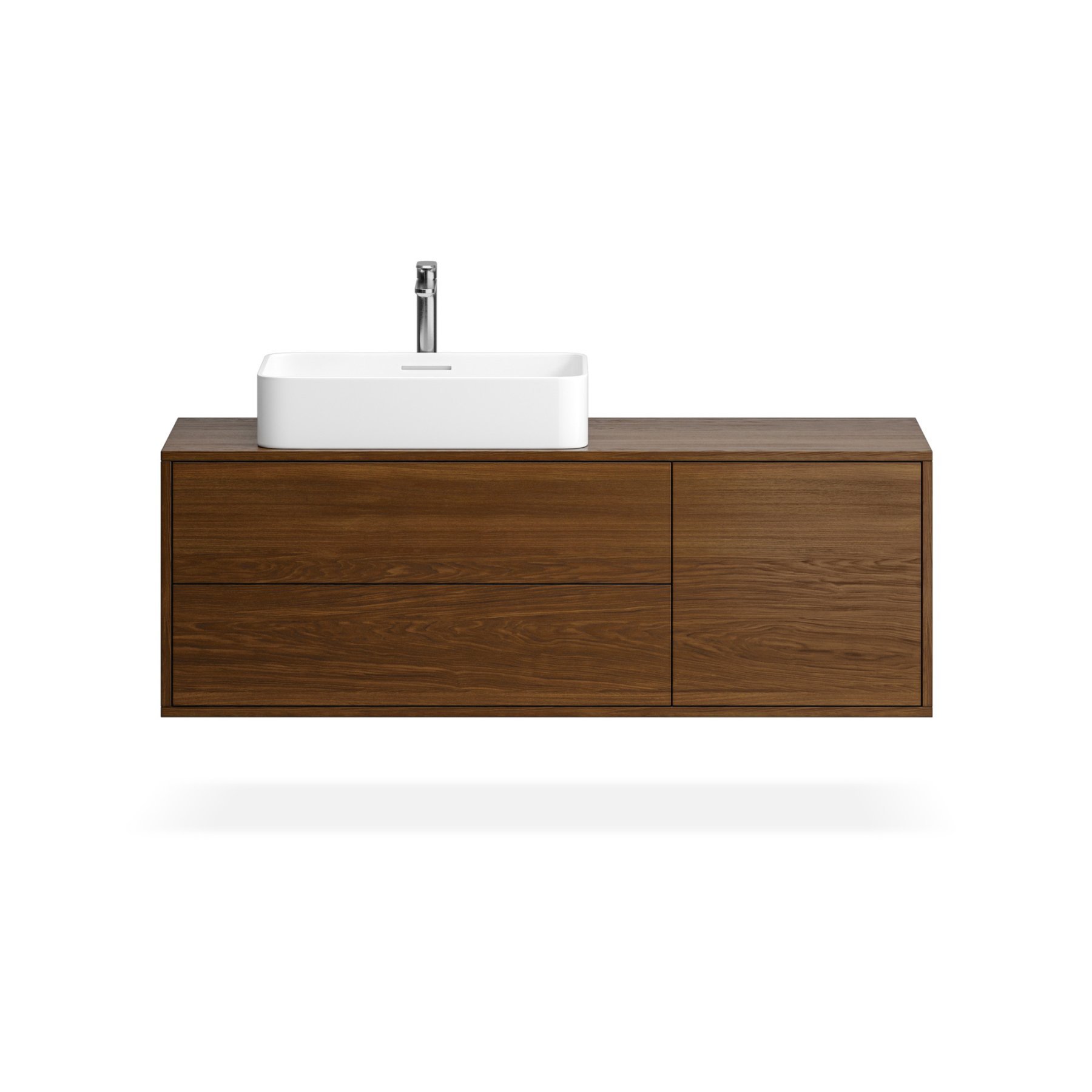 Компактные модели подвесных тумб с двумя выдвижными ящиками и секцией с полками гармонично сочетаются с линейкой накладных раковин большинства производителей.