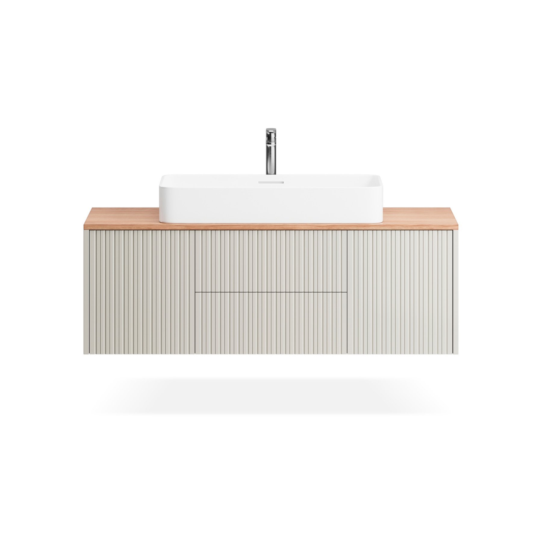 Компактные модели подвесных тумб из трёх секций с выдвижными ящиками и полками гармонично сочетаются с линейкой накладных раковин большинства производителей.