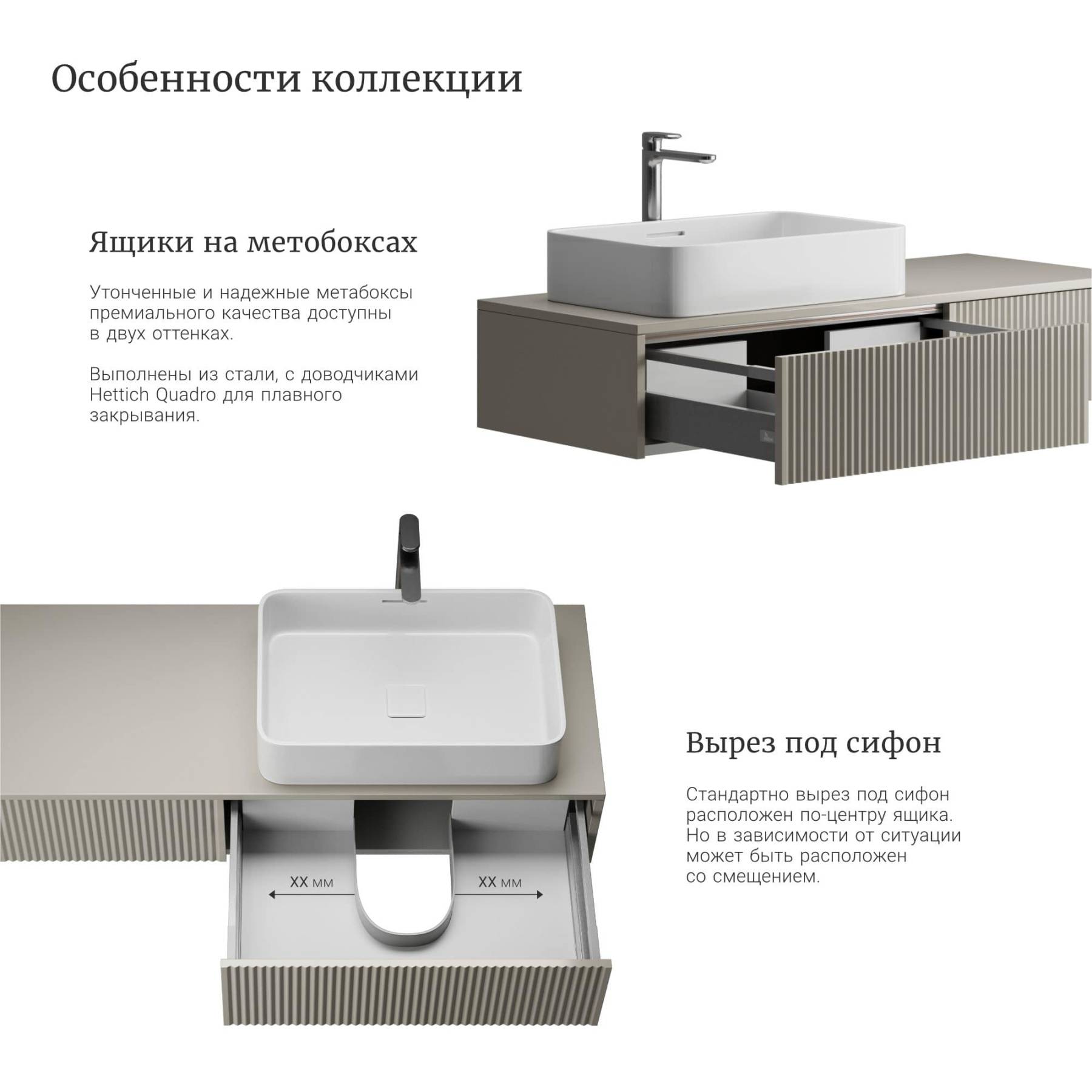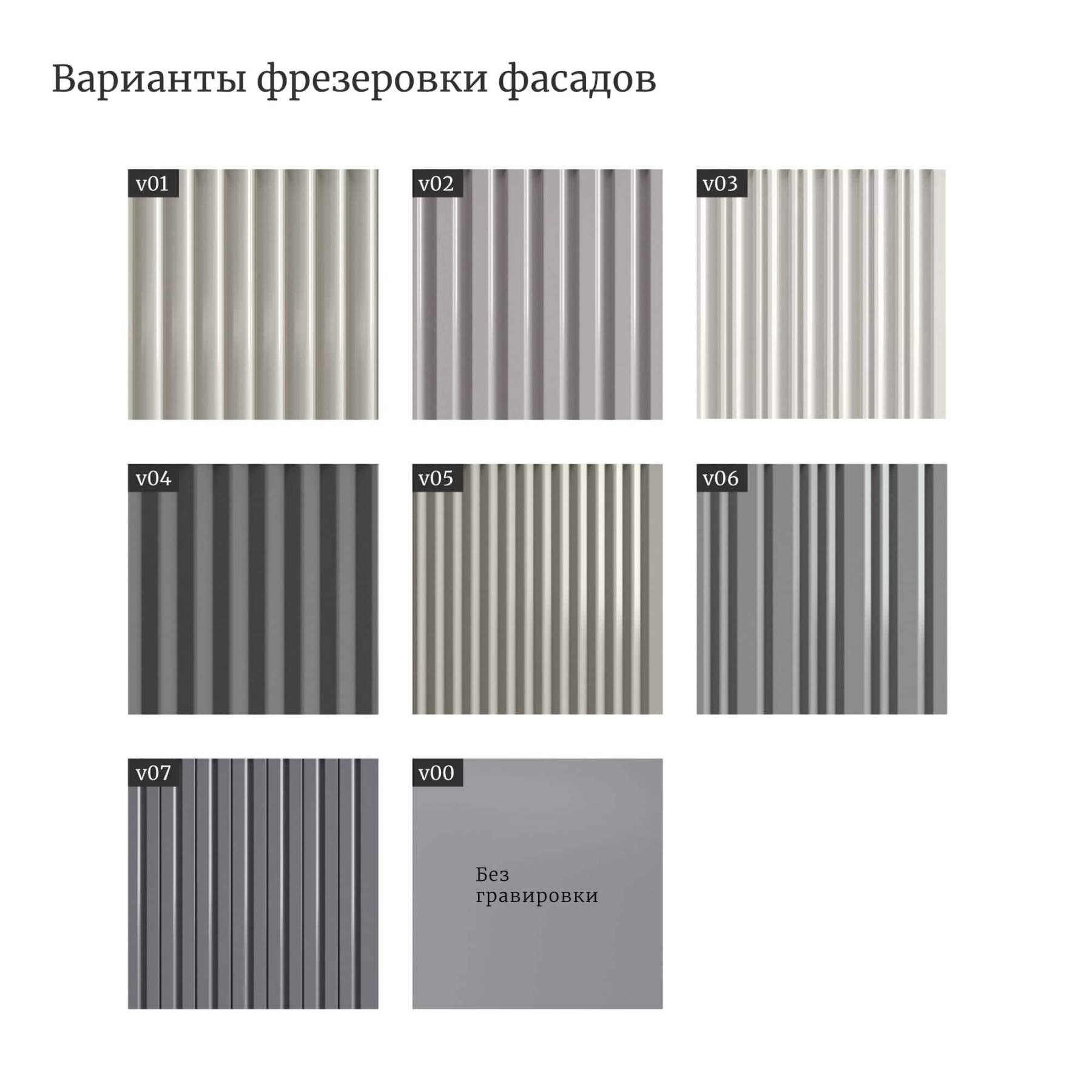 Компактные модели подвесных тумб с одним или двумя выдвижными ящиками гармонично сочетаются с линейкой накладных раковин большинства производителей. Особенность коллекции Vertical – 7 узоров вертикальной фрезеровки на фасадах, каждая из которых задает совершенно разный ритм и интересную игру теней. Особенности коллекции: По запросу выполним отверстия в столешнице под вашу раковину или смеситель, сместим вырез под сифон в ящике. Выполнена из влагостойкого МДФ, все поверхности дополнительно защищены от попадания влаги. Ящики на метабоксах, поддержка столешницы усиленной алюминиевой конструкцией и традиционно качественная немецкая фурнитура Hettich. Ящики дополнены скрытыми направляющими с доводчиками Hettich Quadro, оснащены механизмом Push to open Silent. В каталоге представлены четыре варианта комбинаций отделок для подвесных тумб и четыре варианта для изделий на цоколе. Выбирайте оттенок эмали, отделку корпуса, тонировку, ручки, а также узор фрезеровки. В коллекцию входят 30 стандартных моделей тумб с возможностью изменения размеров и внутреннего наполнения.