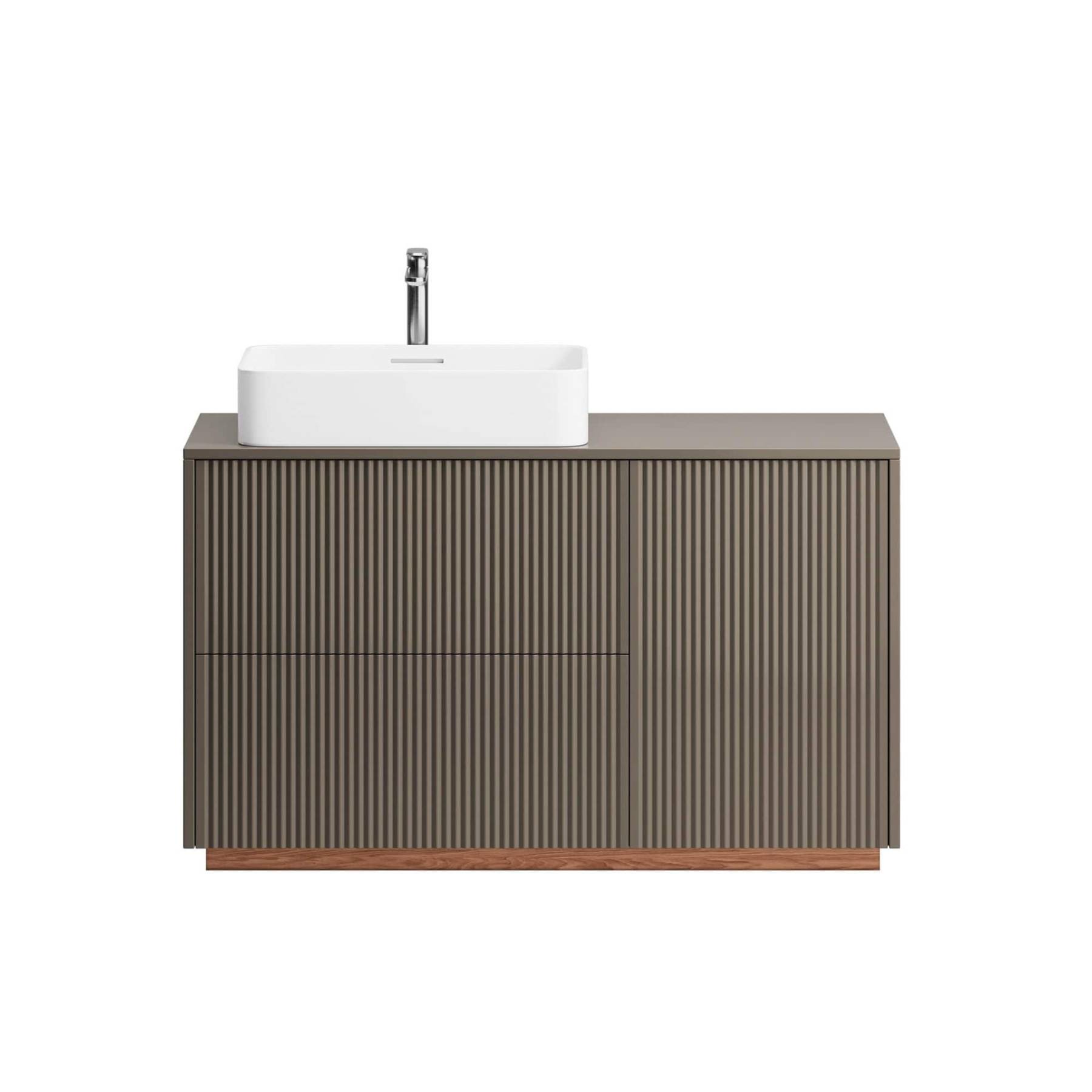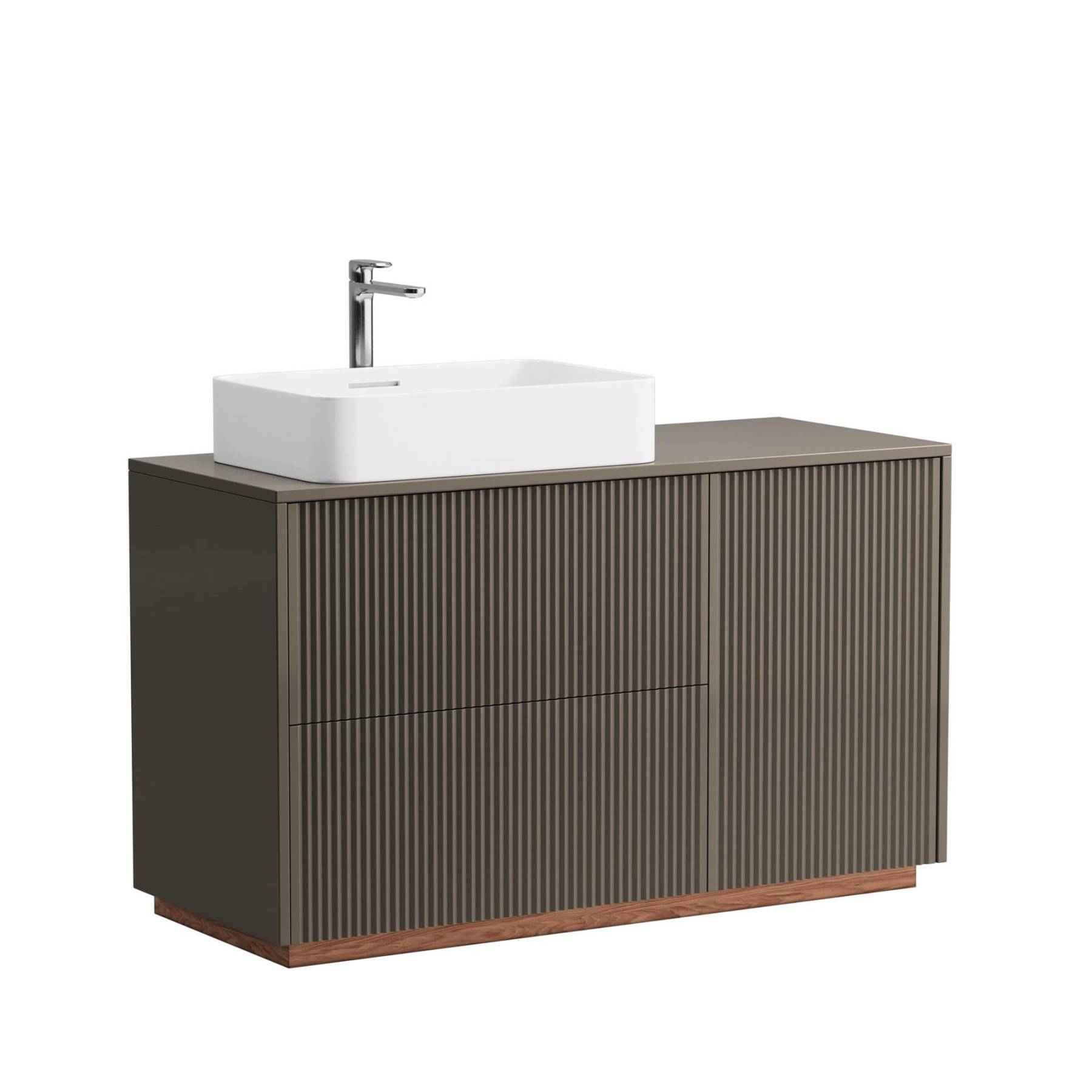 Компактные модели подвесных тумб с одним или двумя выдвижными ящиками гармонично сочетаются с линейкой накладных раковин большинства производителей. Особенность коллекции Vertical – 7 узоров вертикальной фрезеровки на фасадах, каждая из которых задает совершенно разный ритм и интересную игру теней. Особенности коллекции: По запросу выполним отверстия в столешнице под вашу раковину или смеситель, сместим вырез под сифон в ящике. Выполнена из влагостойкого МДФ, все поверхности дополнительно защищены от попадания влаги. Ящики на метабоксах, поддержка столешницы усиленной алюминиевой конструкцией и традиционно качественная немецкая фурнитура Hettich. Ящики дополнены скрытыми направляющими с доводчиками Hettich Quadro, оснащены механизмом Push to open Silent. В каталоге представлены четыре варианта комбинаций отделок для подвесных тумб и четыре варианта для изделий на цоколе. Выбирайте оттенок эмали, отделку корпуса, тонировку, ручки, а также узор фрезеровки. В коллекцию входят 30 стандартных моделей тумб с возможностью изменения размеров и внутреннего наполнения.