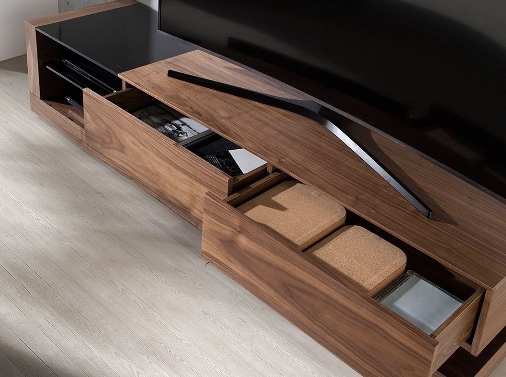 Тумба под телевизор из МДФ, облицованная ореховым шпоном, и тонированное в черный цвет стекло, с двумя ящиками с функцией плавного закрывания и открытым пространством для хранения вещей. Детали и ножки из полированной стали.