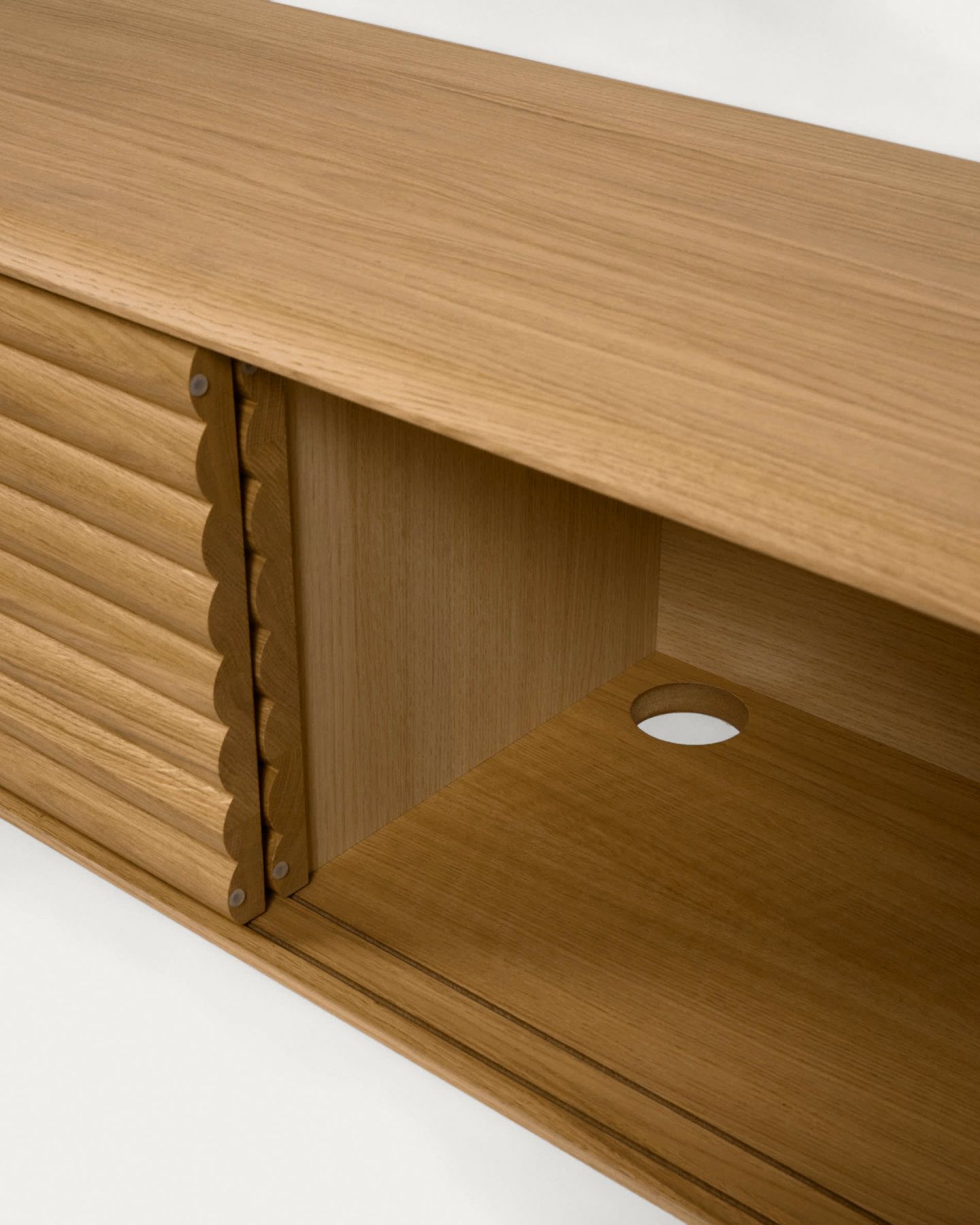Тумба под TV Lenon из древесины дуба 200 x 55 cm от фабрики La Forma – необычная фактура и максимум места для порядка в доме. Тумба под TV Lenon моментально убеждает в том, что создана для теплых домашних интерьеров с преобладанием деревянной мебели. Особенность этой модели в том, что она имеет фактурные фасады, которые меняют расположение древесного рисунка. Такой дизайнерский прием превращает прямоугольную конструкцию в эффектный предмет интерьера со «своим лицом». Тумба состоит из каркаса, двух раздвижных дверей, опоры. Она полностью сделана из древесины со специальным покрытием для защиты от негативных воздействий при эксплуатации. Каркас выполнен из МДФ цвета дуба. Он поделен на две секции шириной по 96 см каждая. Секции закрываются раздвижными дверями. Двери выполнены из шпона дуба, имеют дугообразную фактуру. Опора из дуба поддерживает изделие по всему периметру. Она оснащена четырьмя ножками с диаметром 3 см. Их высота – 25 см. У каждой ножки есть пластиковый наконечник для регулировки высоты. Максимально допустимая нагрузка на изделие – 60 кг. Размеры: длина – 200 см, глубина – 35 см, высота – 57 см. Потребуется сборка. В коллекции Lenon представлены также комод и сервант с аналогичным дизайном.