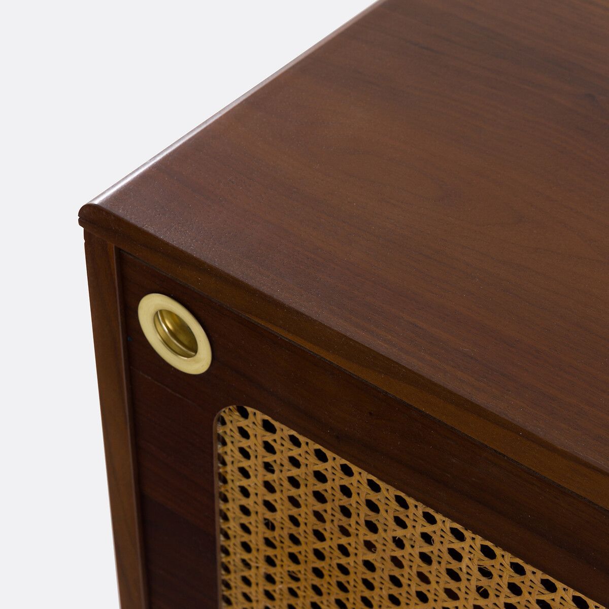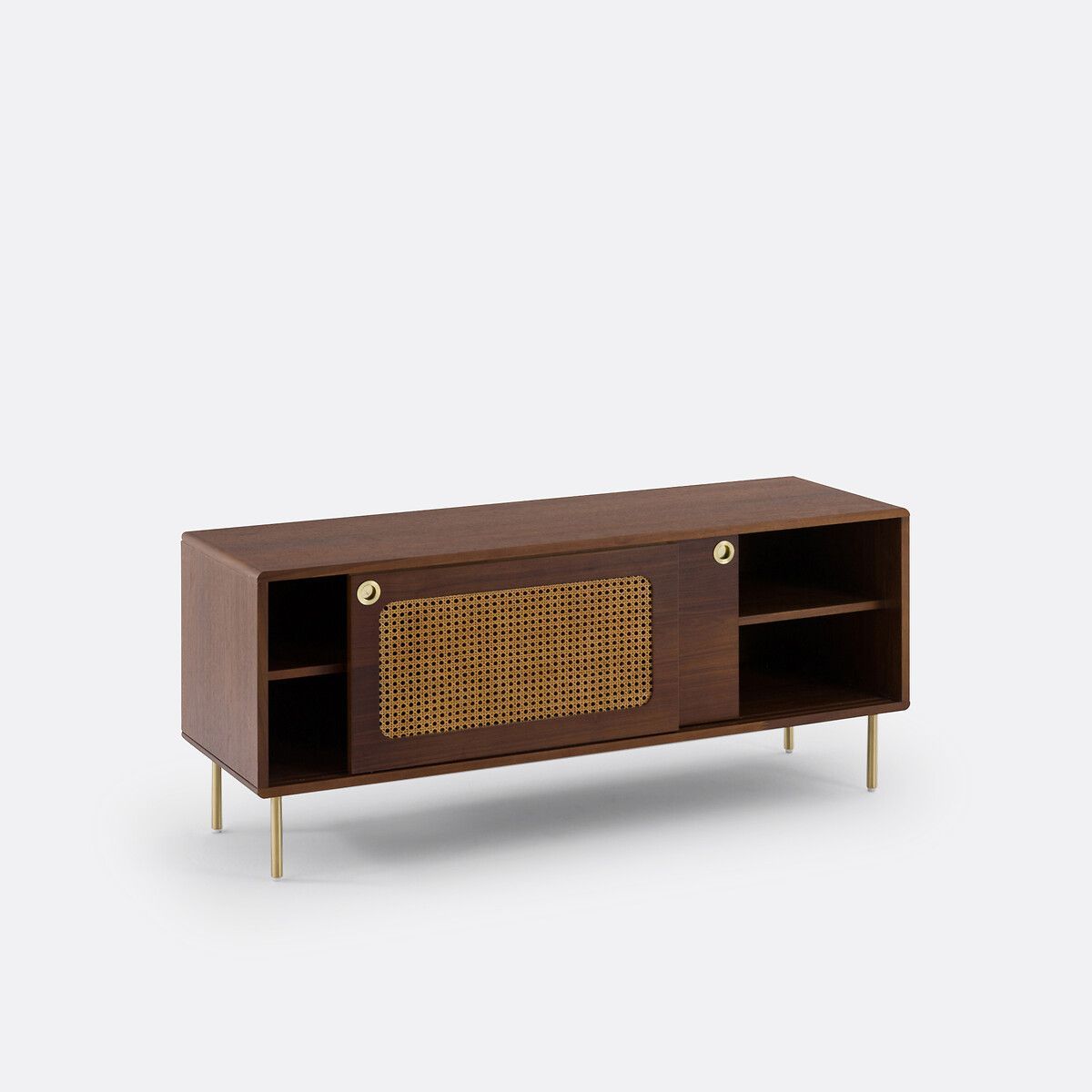 Имеет две раздвижные дверки, одна из которых выполнена из плетеного ротанга.