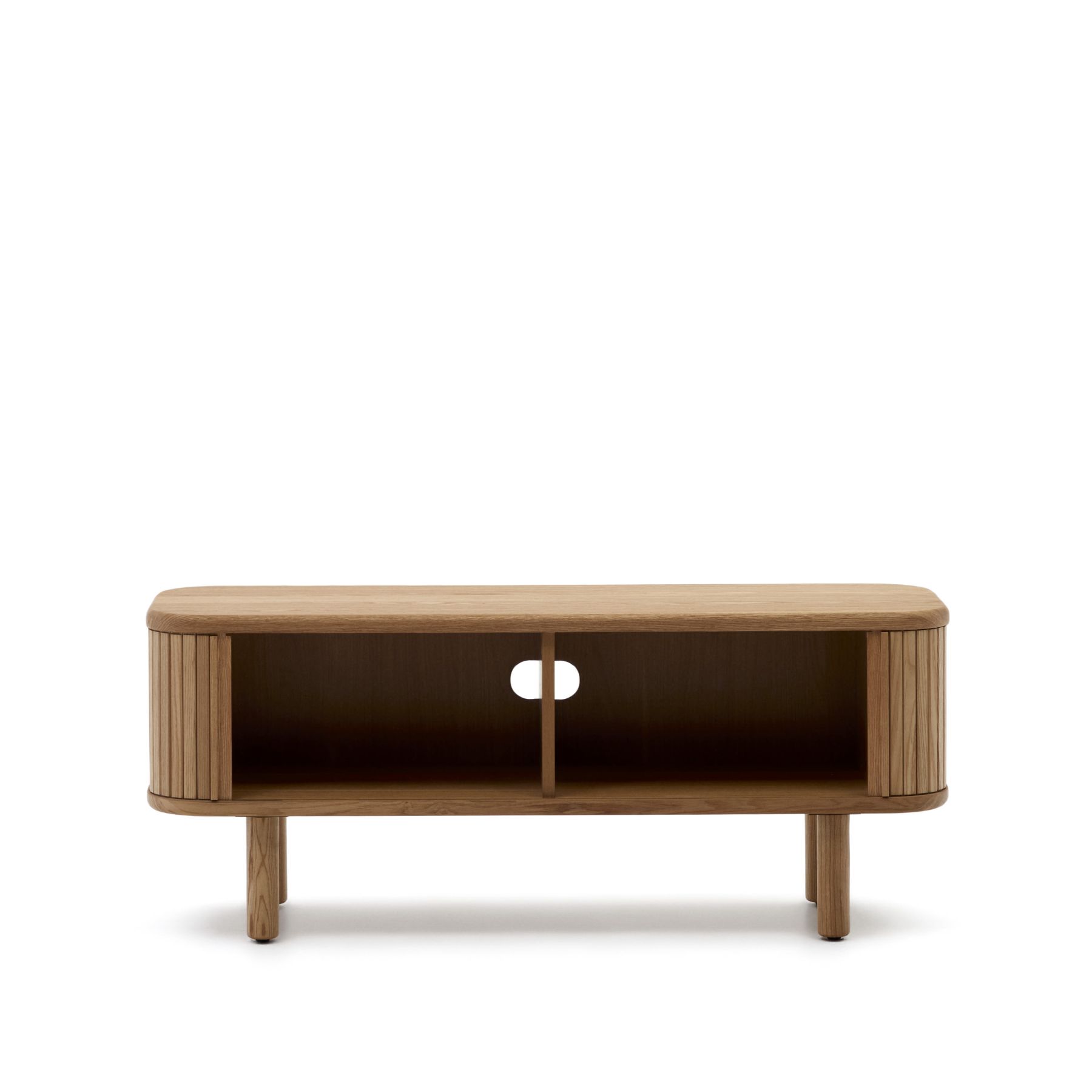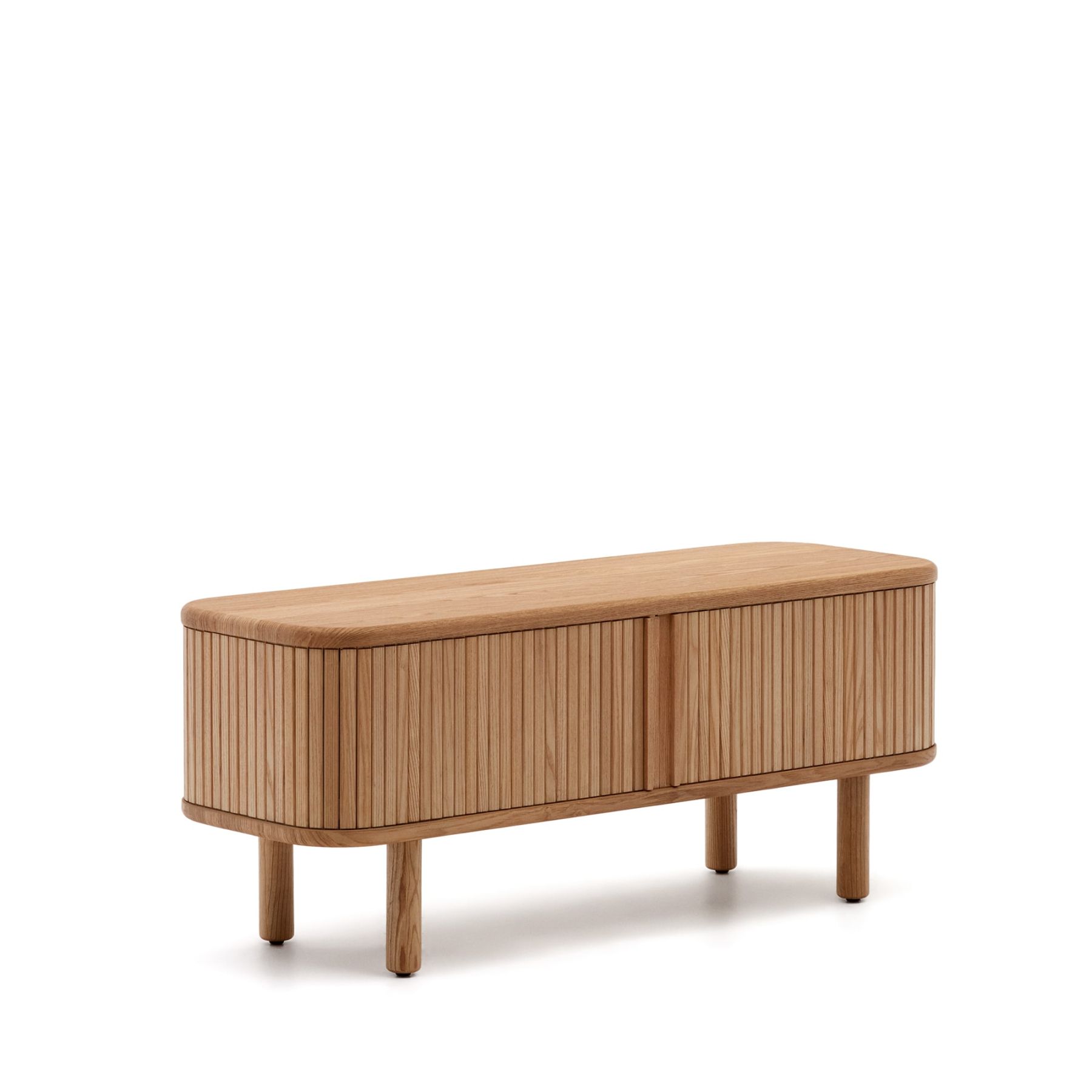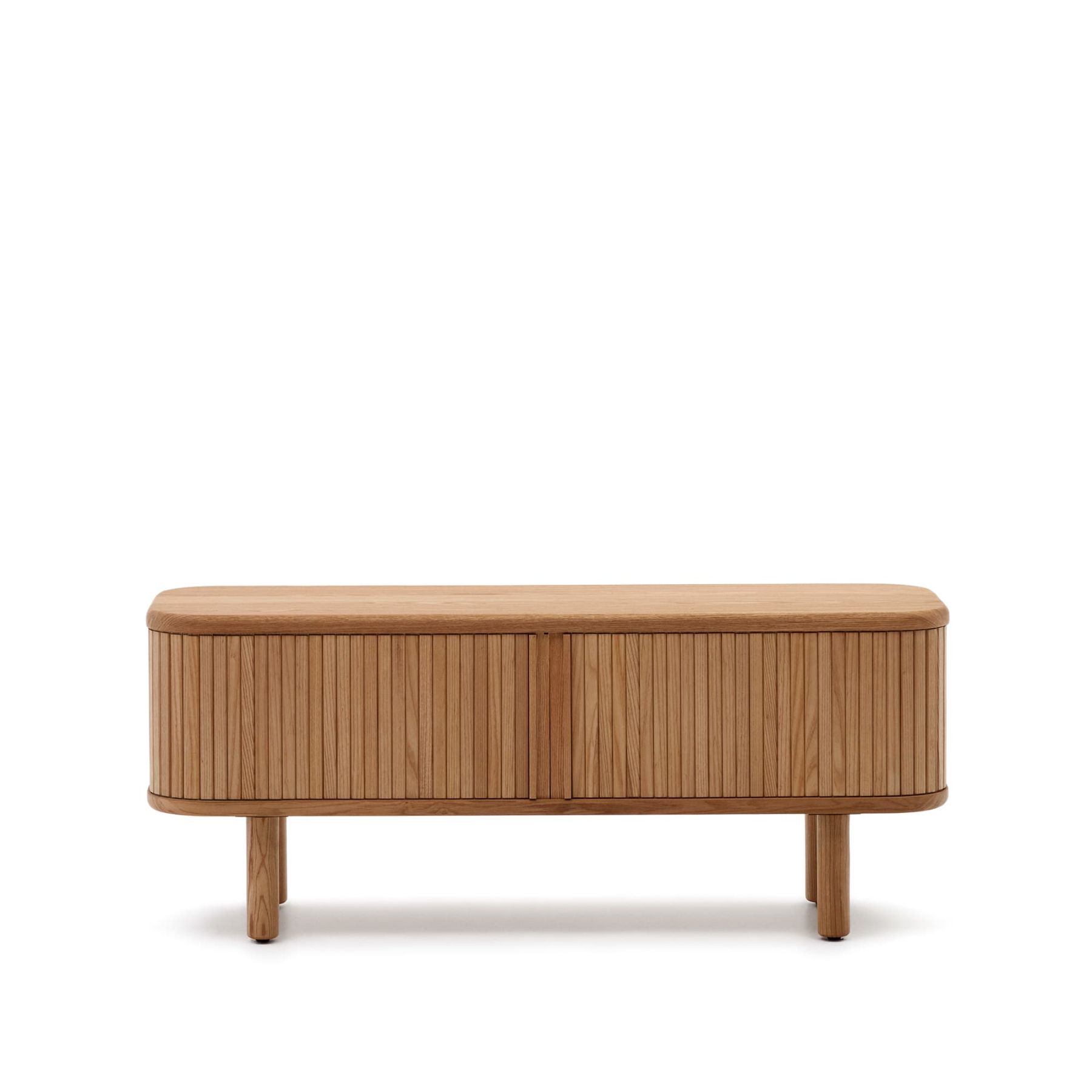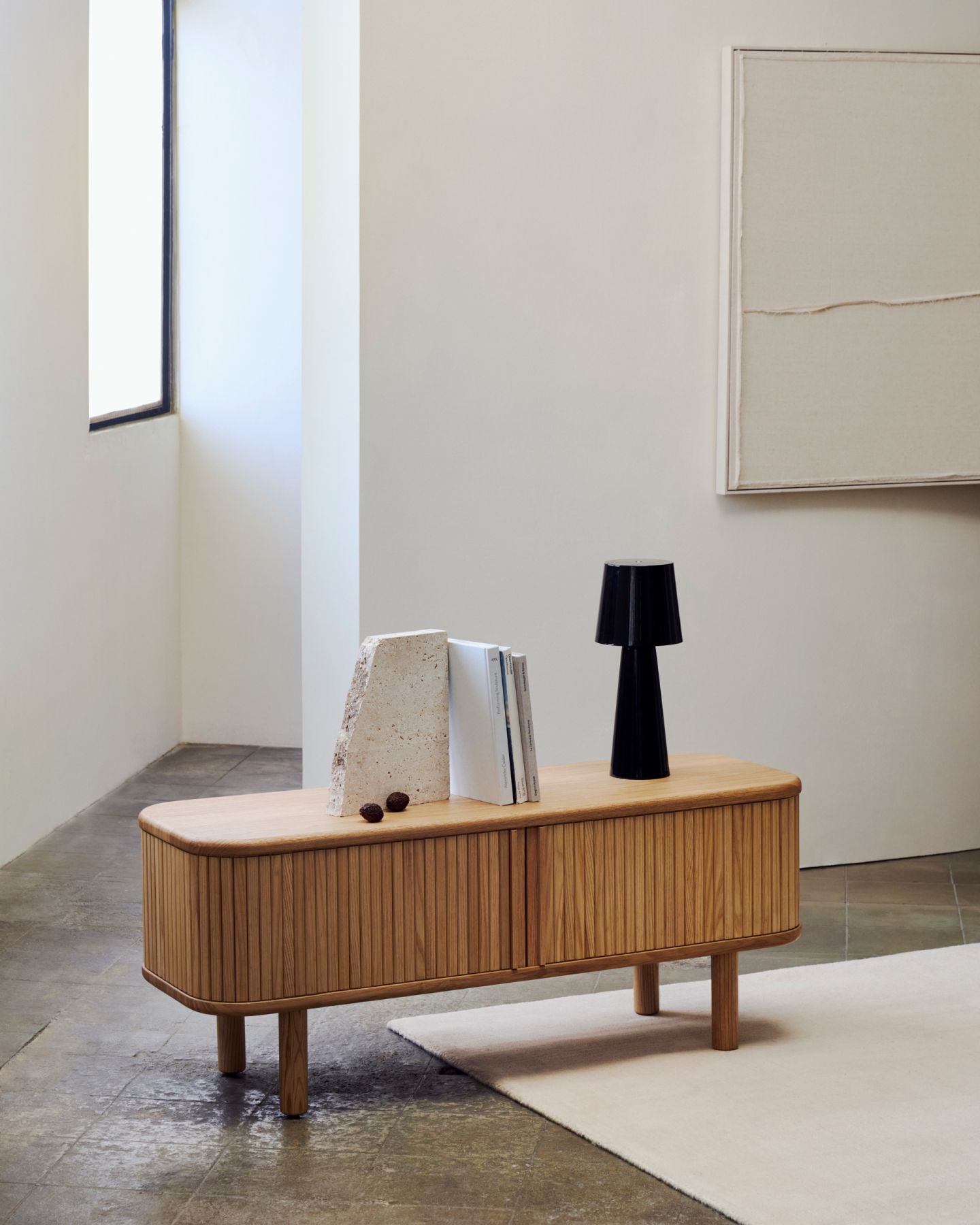 Команда Kave Home создала коллекцию Mailen современного дизайна с закругленными формами, выполненную из ясеневого шпона и раздвижными дверями с деревянными рейками, которые делают ее настоящим героем.