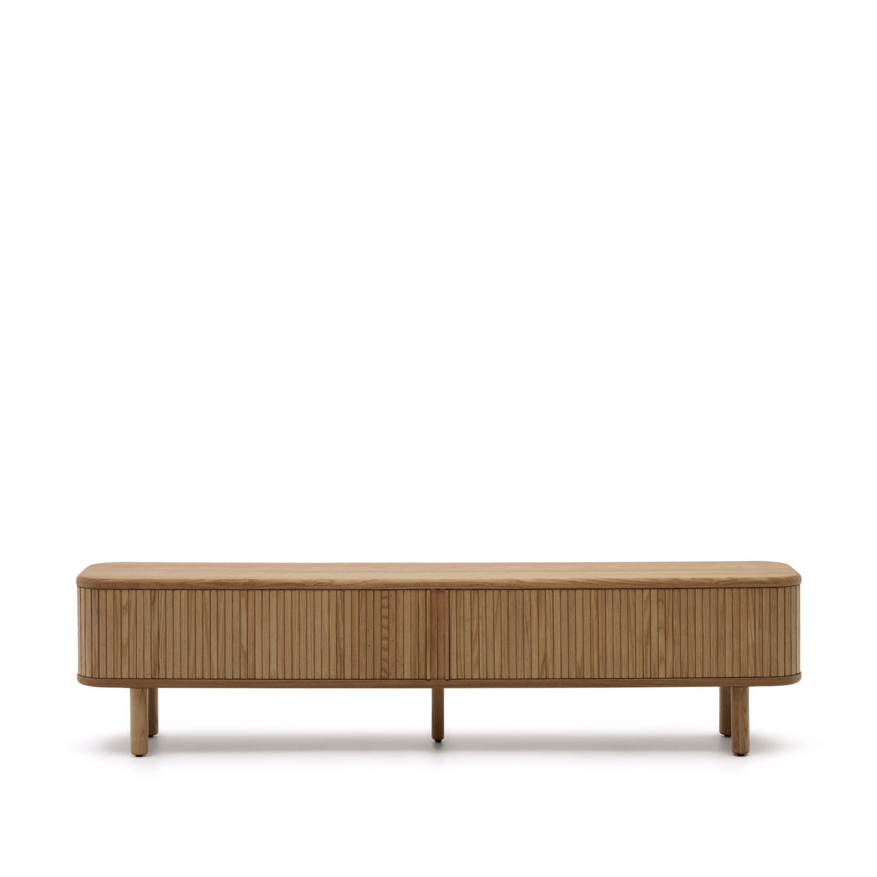Команда Kave Home создала коллекцию Mailen современного дизайна с закругленными формами, выполненную из ясеневого шпона и раздвижными дверями с деревянными рейками, которые делают ее настоящим героем.
