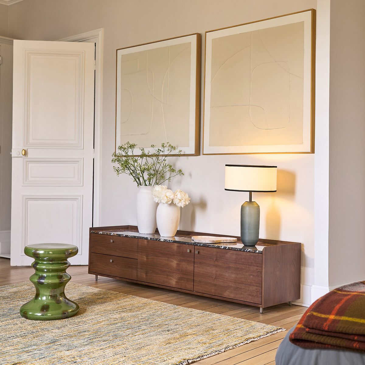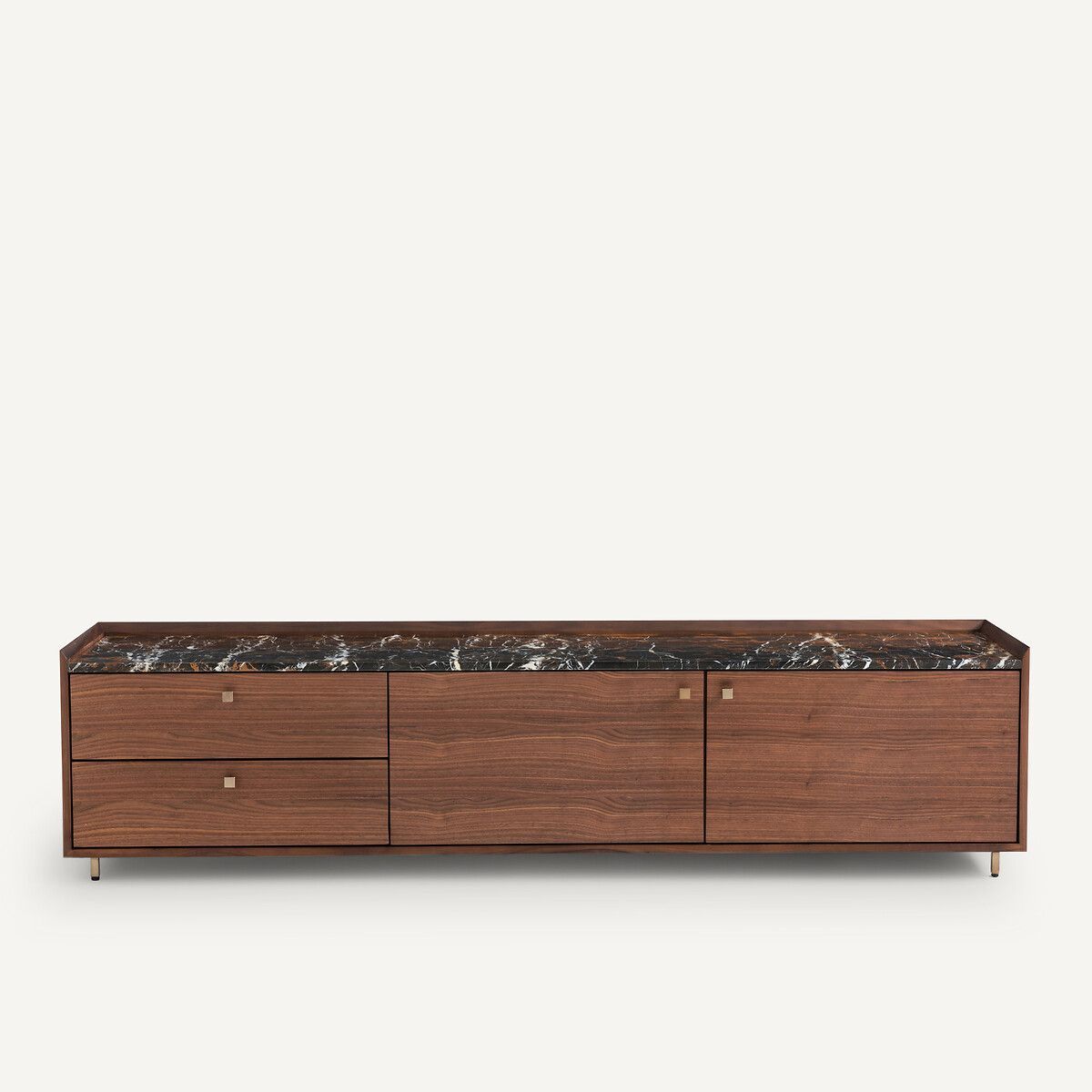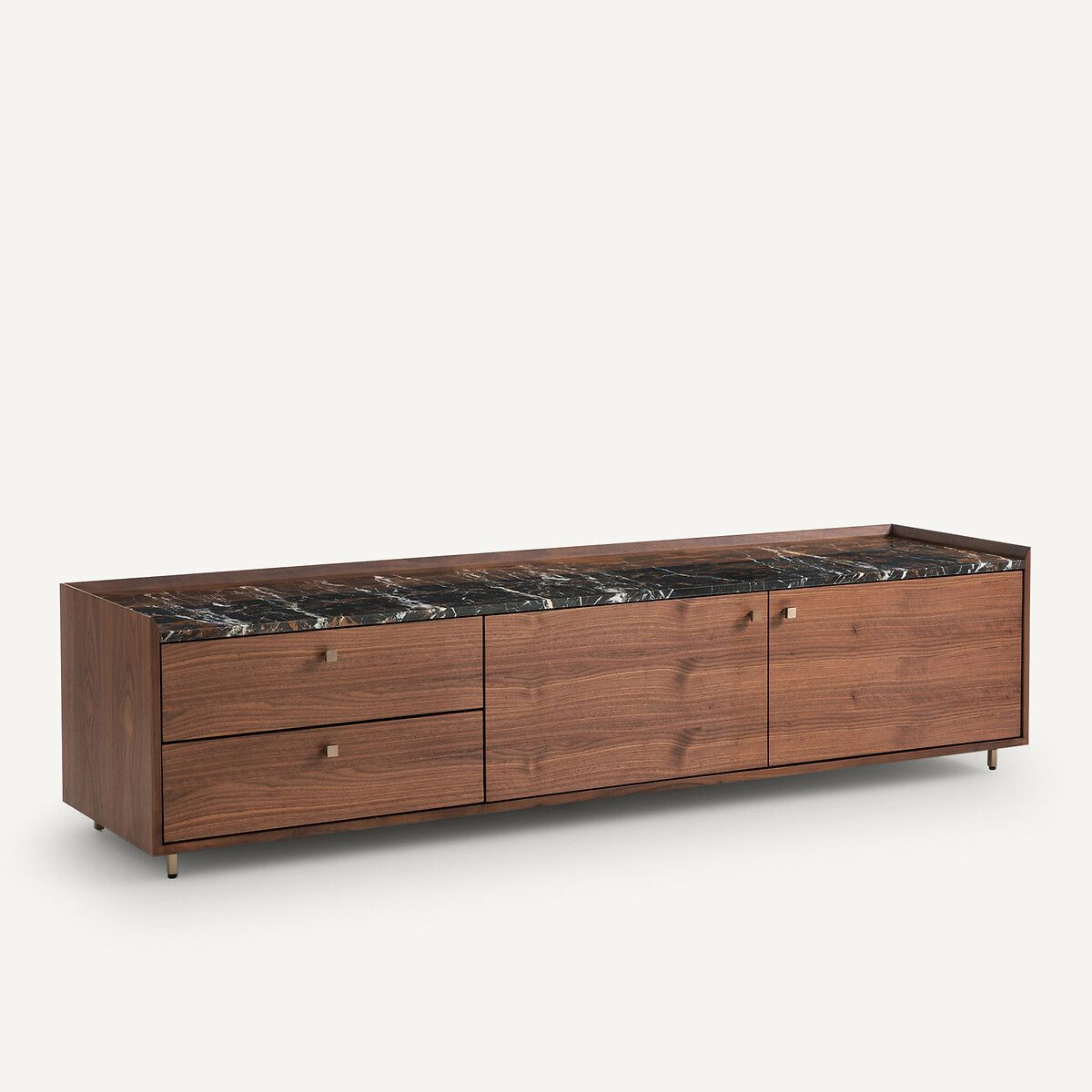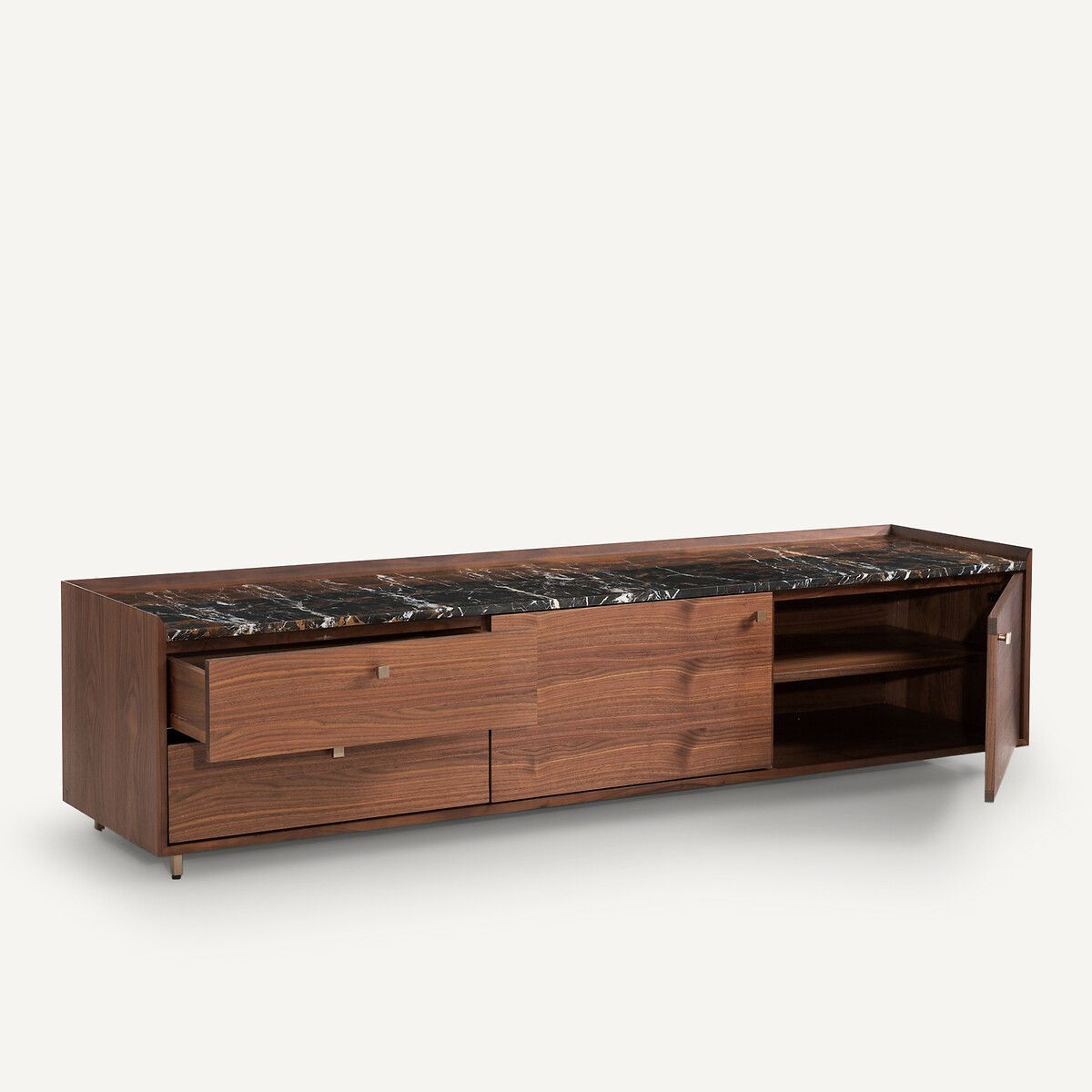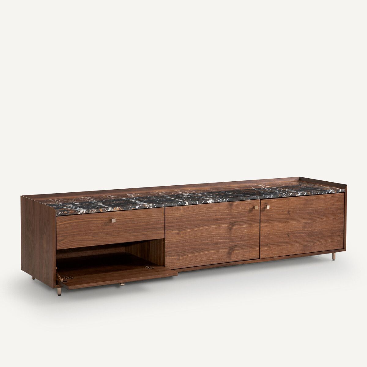 Мебель для ТВ Noham ставит в приоритет точные детали и качественную отделку. Дизайн с преобладанием благородных материалов: мрамор янтарного цвета и ореховое дерево.