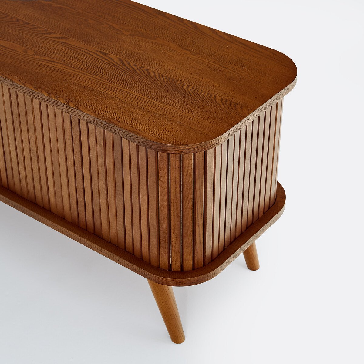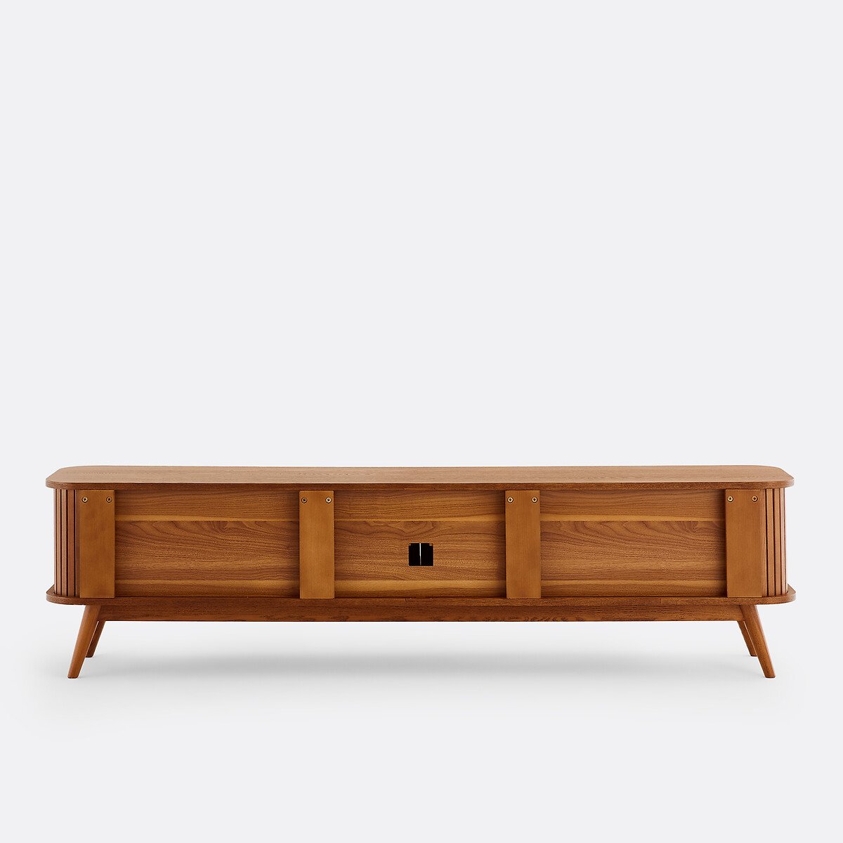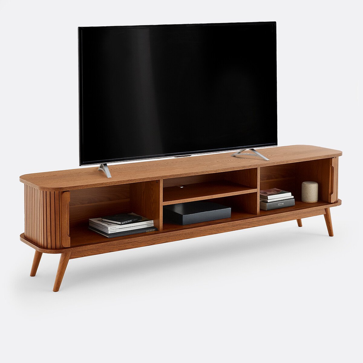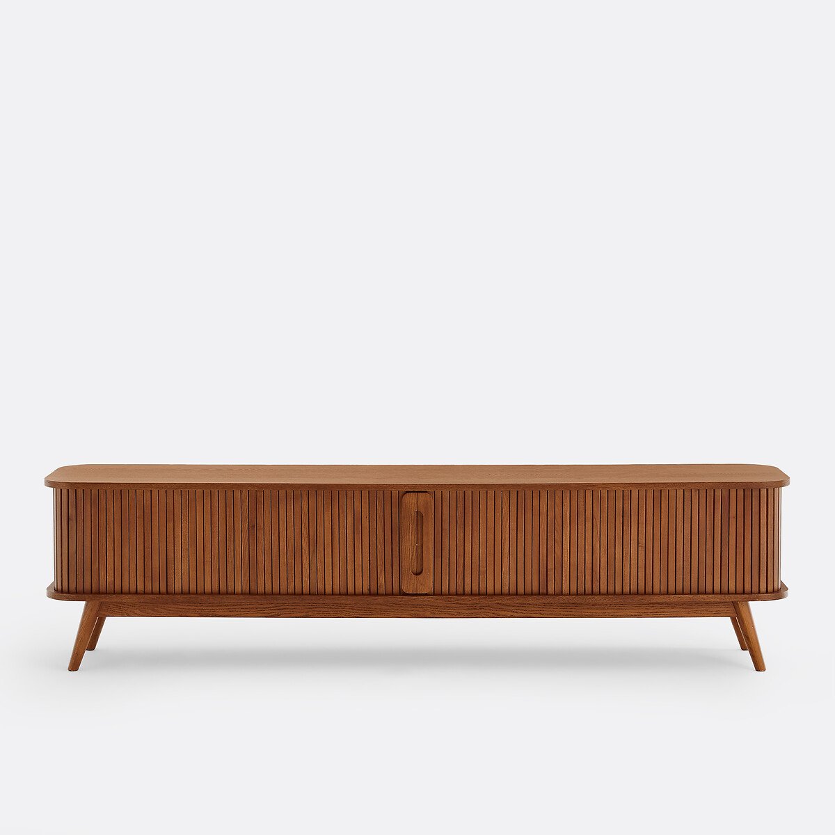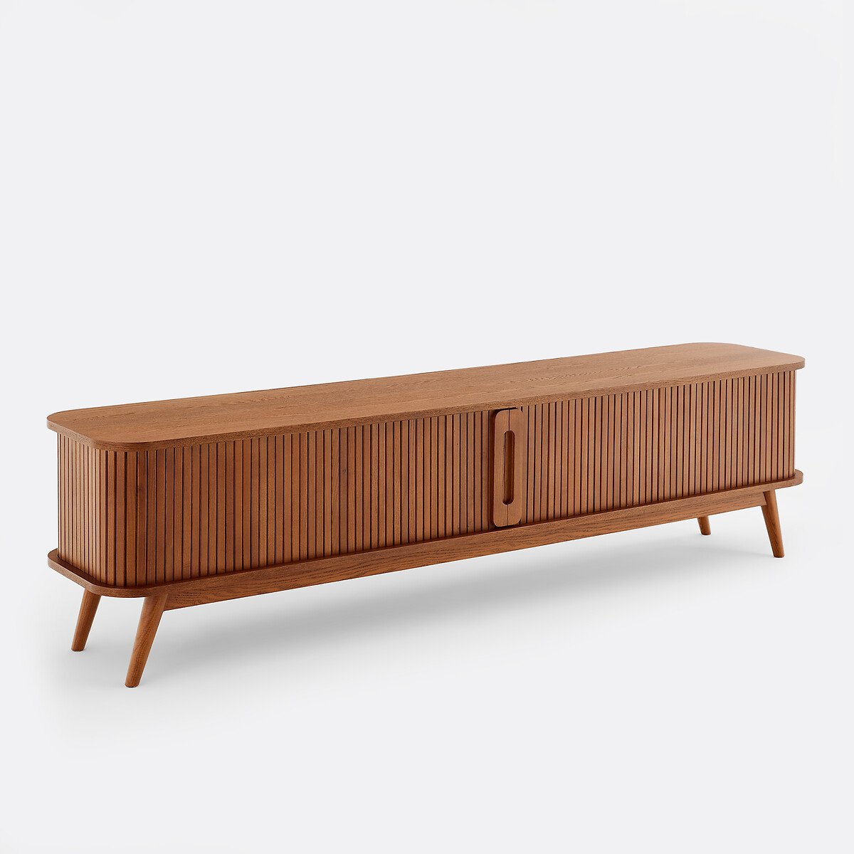 Эстетичная и функциональная тумба для TV в современном скандинавском стиле без сомнения впишется в ваш интерьер. Окраска под ореховое дерево (в ярком стиле 70-х) выглядит роскошно и современно.Творение наших дизайнеров из La Redoute Intérieurs.Описание • Каркас из МДФ, шпонированного ясенем, тонированным под орех, покрытие нитроцеллюлозным лаком • 2 раздвижные дверцы со шторками из массива ясеня, тонированного под орех, покрытие нитроцеллюлозным лаком • Ножки из массива ясеня с окраской под ореховое дерево, НЦ-лакировка • Внутренние размеры: четыре ниши, одна фиксированная полка в центральной нише • Отверстие для кабелей • Количество человек, рекомендованное для сборки: дваРазмерыОбщие размеры • Ширина: 200 см • Высота: 52 см • Глубина: 40 см • Вес: 39 кгВнутренние размеры • Большая ниша (справа и слева) : Ш55 x В32 x Д40 см • Средние ниши: Ш63 x В13 x Д40 см • Высота ящика: 32 см • Высота ножек: 20 см • Самостоятельная сборка (необходимо прикрутить ножки). • ДРЕВЕСИНА ИЗ УСТОЙЧИВО УПРАВЛЯЕМЫХ ЛЕСОВ. Наличие знака FSC® означает, что древесина, из которой изготовлено изделие, добыта с соблюдением международных стандартов: в процессе добычи не были нарушены права коренных народов, местных жителей и работников, и заготовка велась методом устойчивого лесопользования.Размеры и вес упаковкиОдна упаковка • Ш208 x В47 x Д49 см, 51 кг