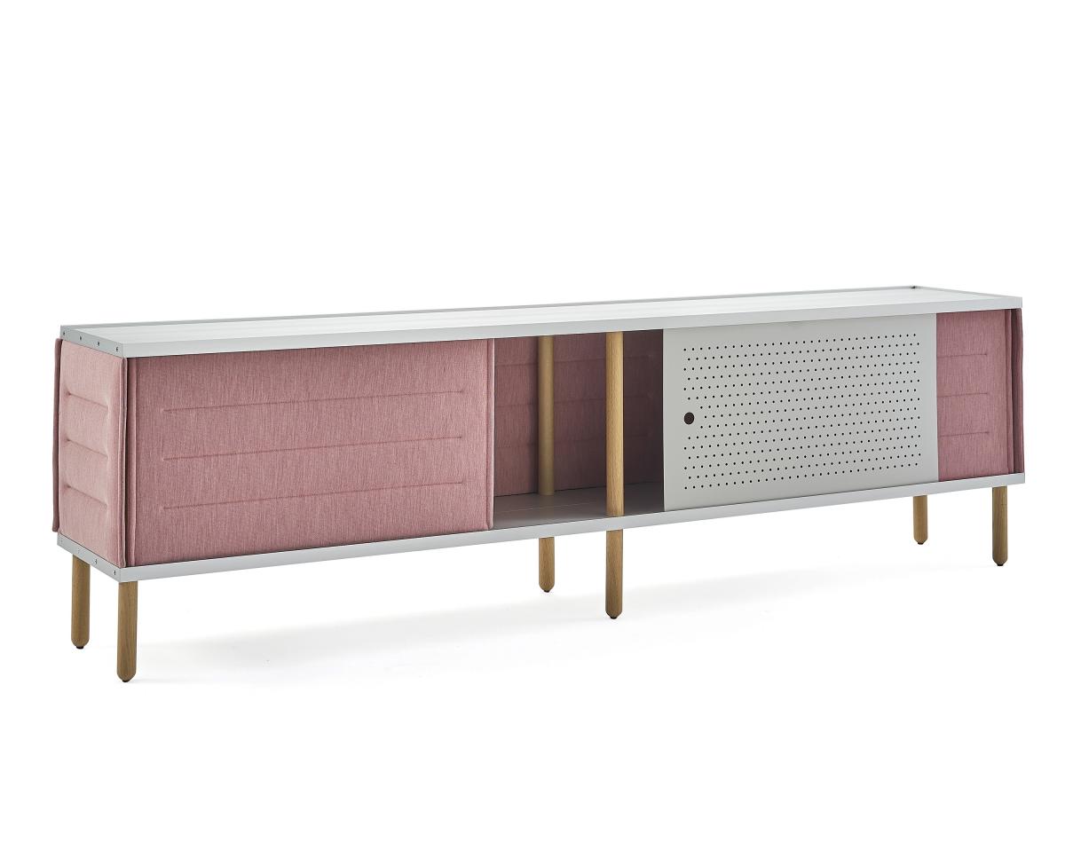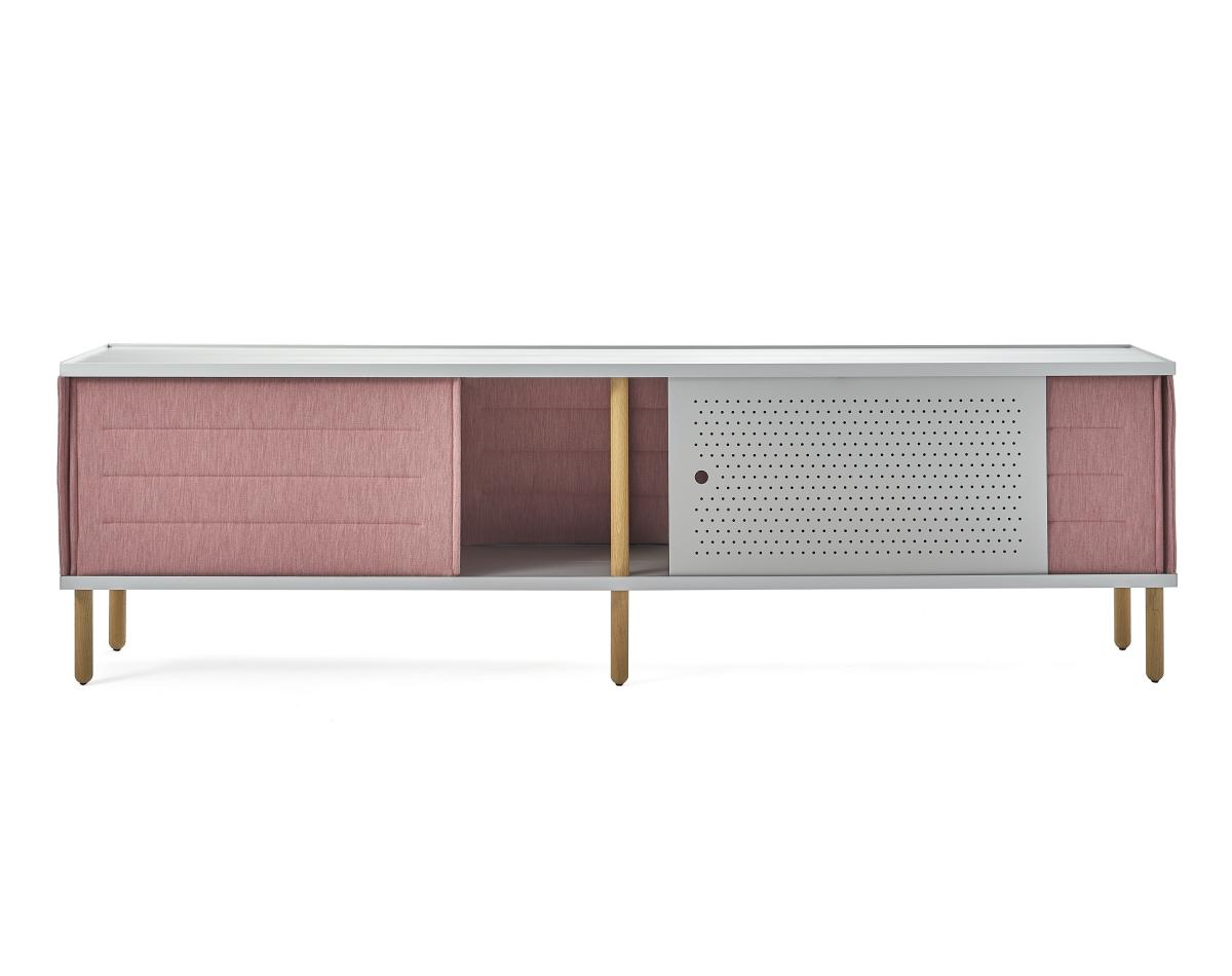 Мягкие модули и дверцы покрывают полки и имеют звукопоглощающий дизайн, что выходит за рамки декоративной функции. Двери способствуют контрасту материалов. Алюминиевые двери были перфорированы, чтобы создать привлекательную текстуру и не препятствовать поглощению звука.