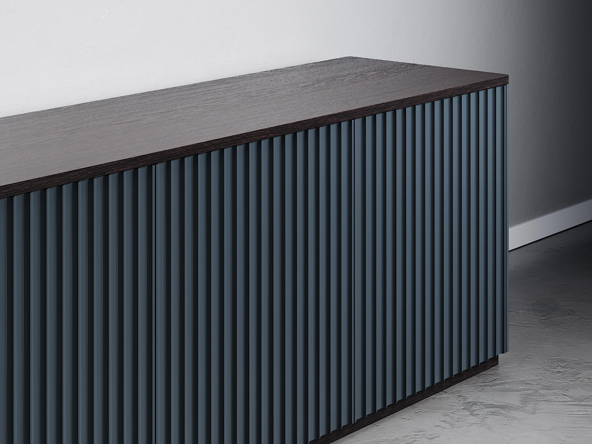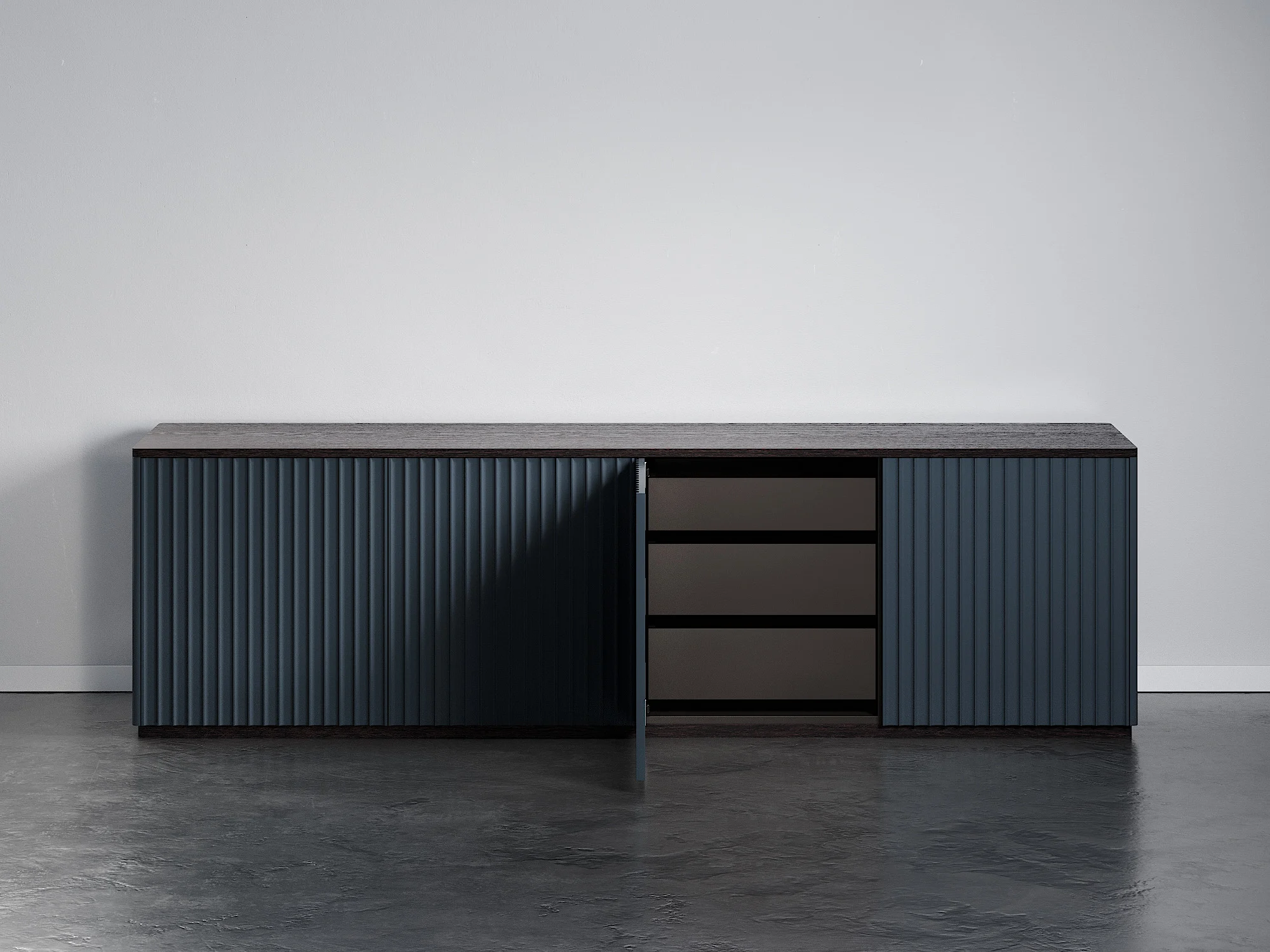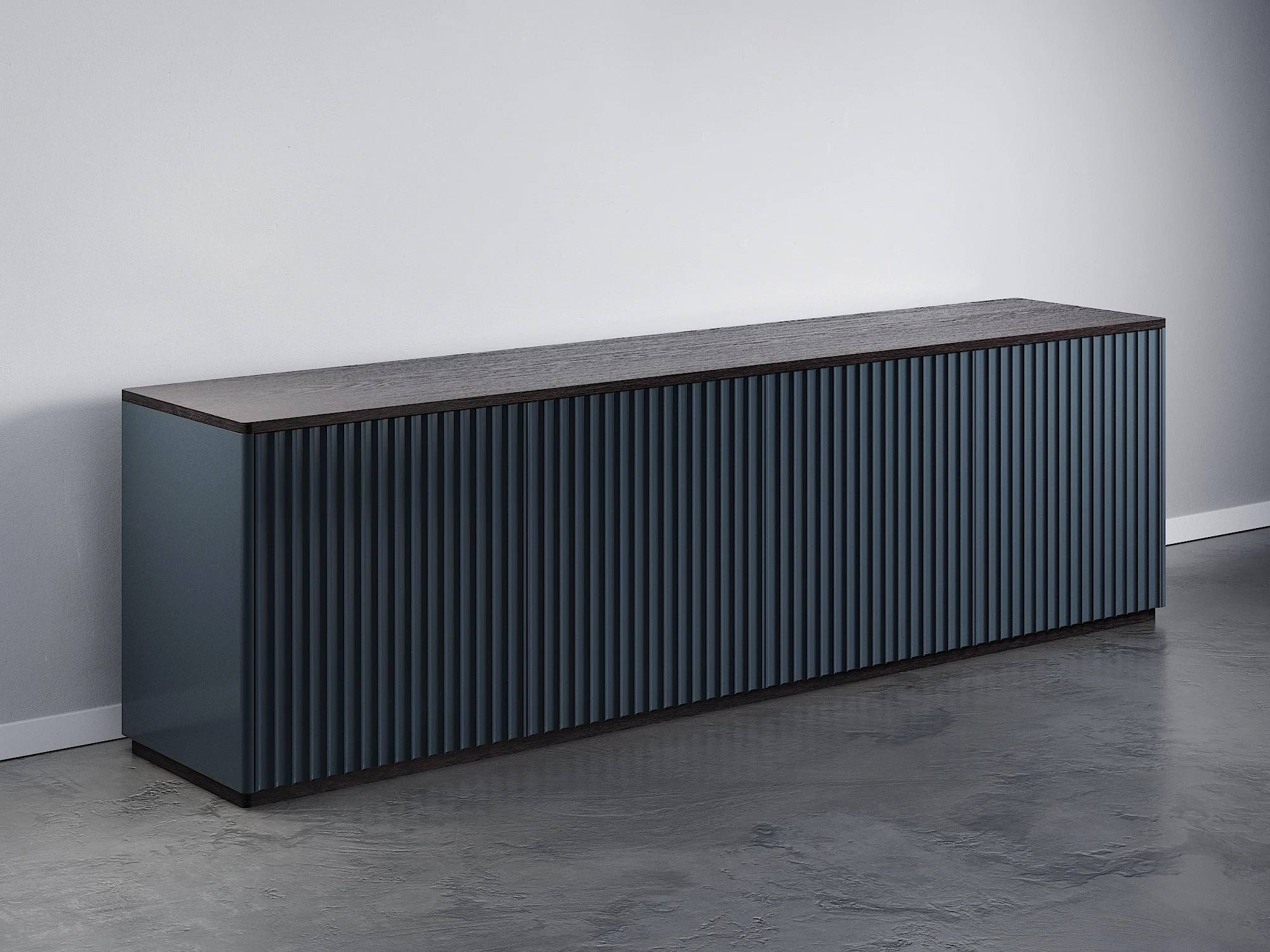 Универсальная тумба из четырех секций с полками и ящиками может использоваться как ТВ тумба в гостиной или в качестве вместительного комода в спальной зоне. Игра теней объемного узора фасадов, скругленные углы и ощутимая фактура дерева создают располагающий и элегантный дизайн. Тумба придется к месту в любом интерьере благодаря простым формам и лаконичному оформлению. Можно выбрать цвет и отделку. Чтобы открыть дверцы, достаточно просто прикоснуться к фасадам. Вы можете использовать тумбу отдельно или объединить несколько изделий в общую систему хранения.