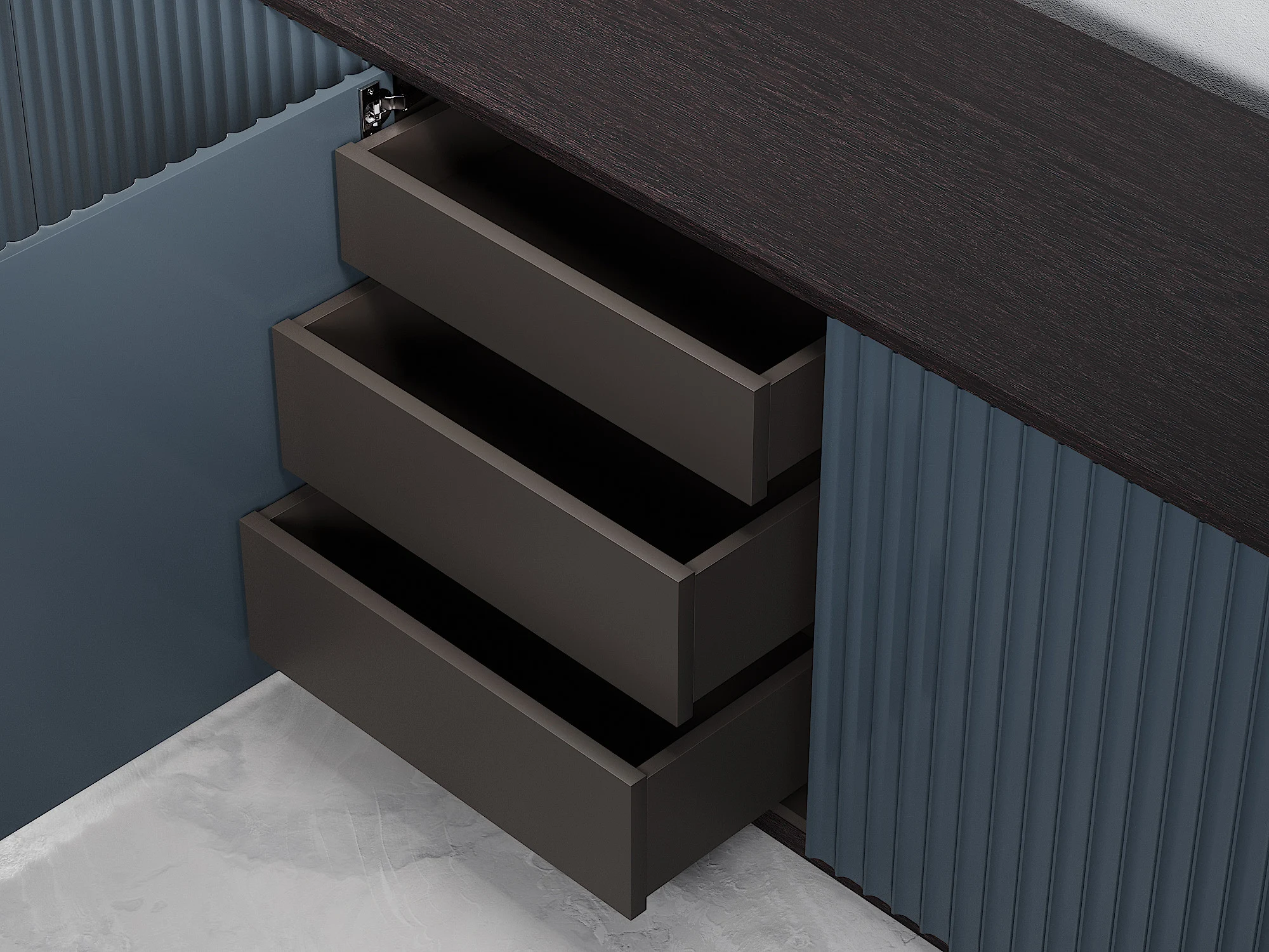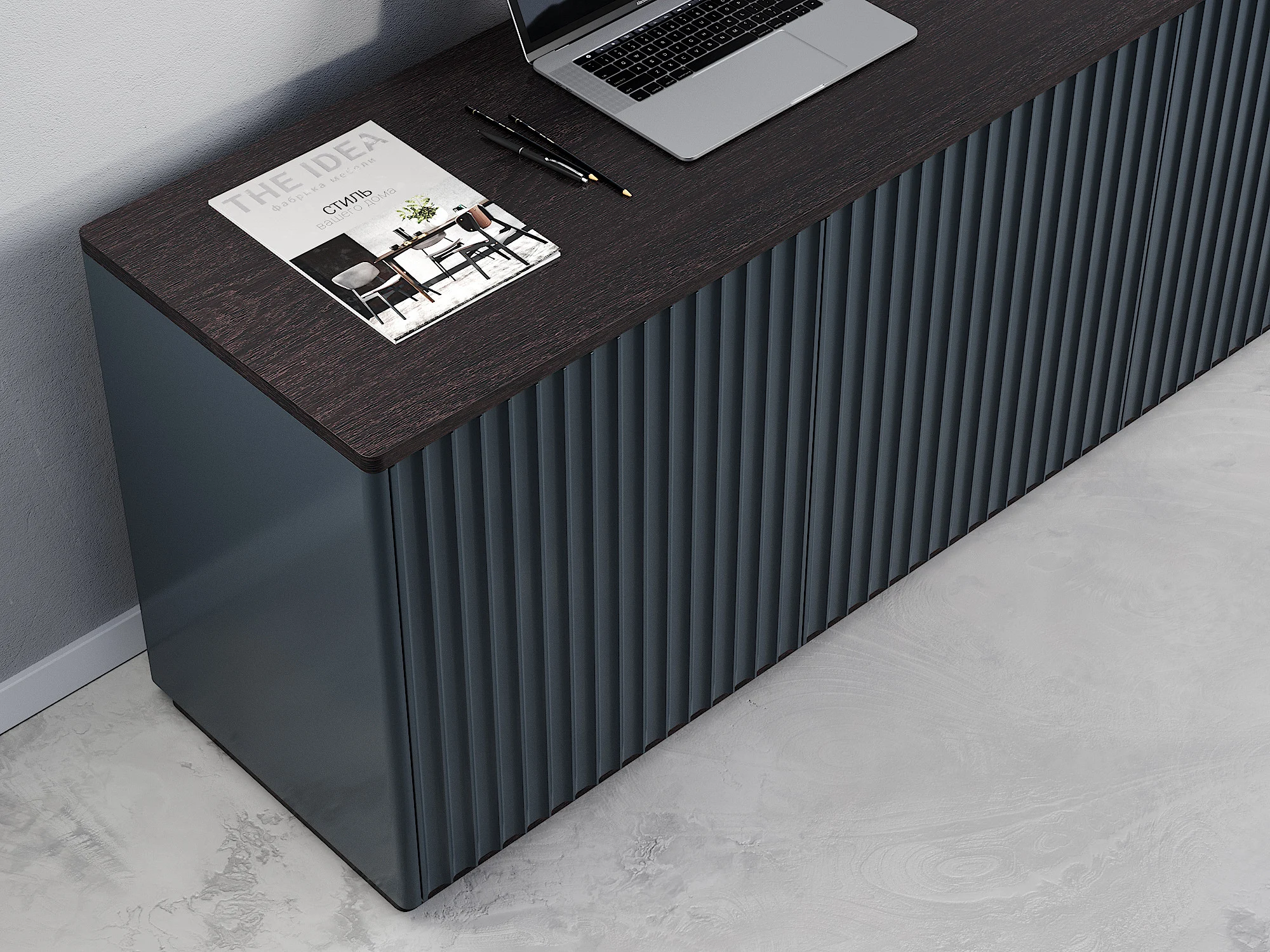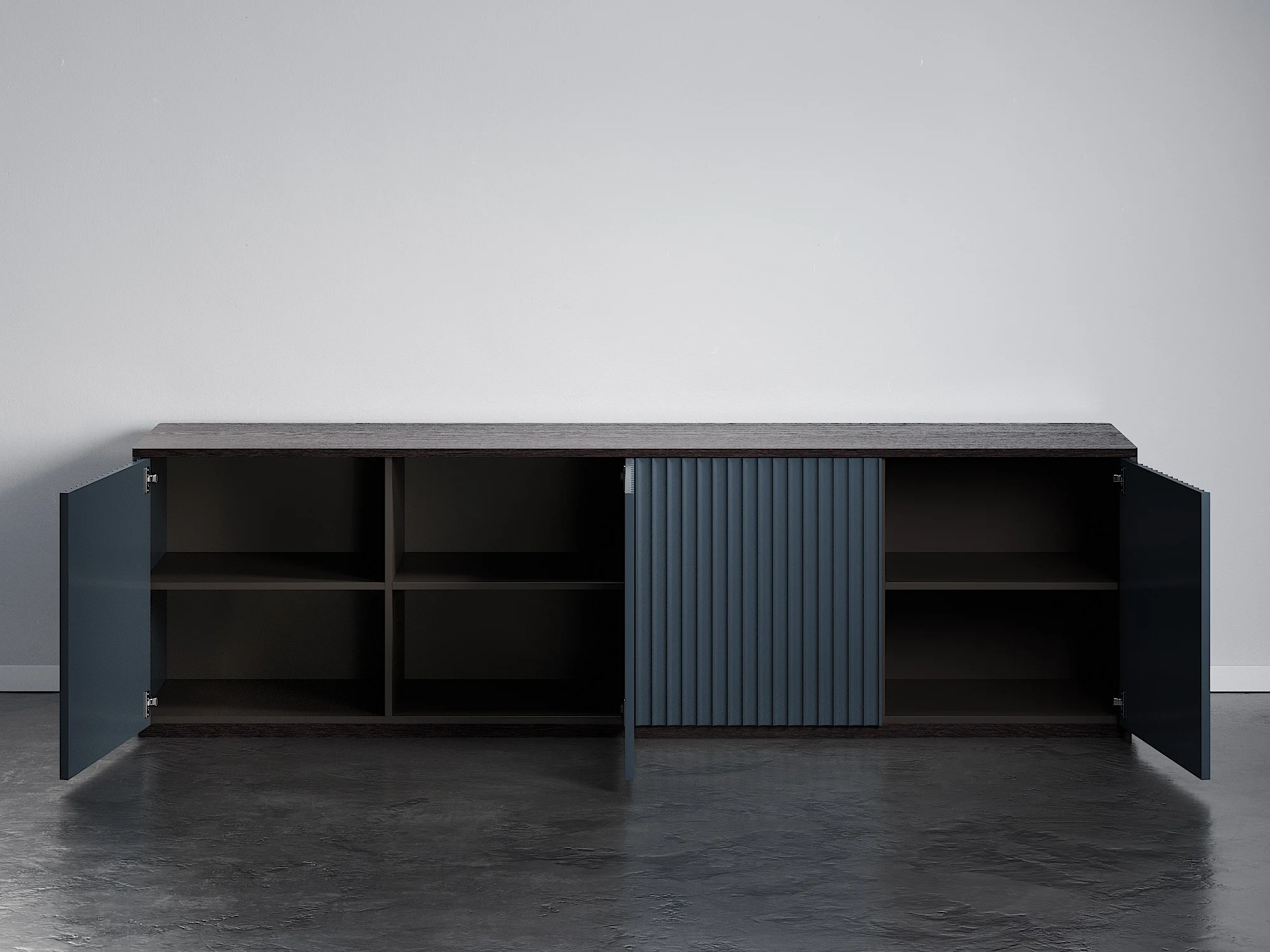 Универсальная тумба из четырех секций с полками и ящиками может использоваться как ТВ тумба в гостиной или в качестве вместительного комода в спальной зоне. Игра теней объемного узора фасадов, скругленные углы и ощутимая фактура дерева создают располагающий и элегантный дизайн. Тумба придется к месту в любом интерьере благодаря простым формам и лаконичному оформлению. Можно выбрать цвет и отделку. Чтобы открыть дверцы, достаточно просто прикоснуться к фасадам. Вы можете использовать тумбу отдельно или объединить несколько изделий в общую систему хранения.