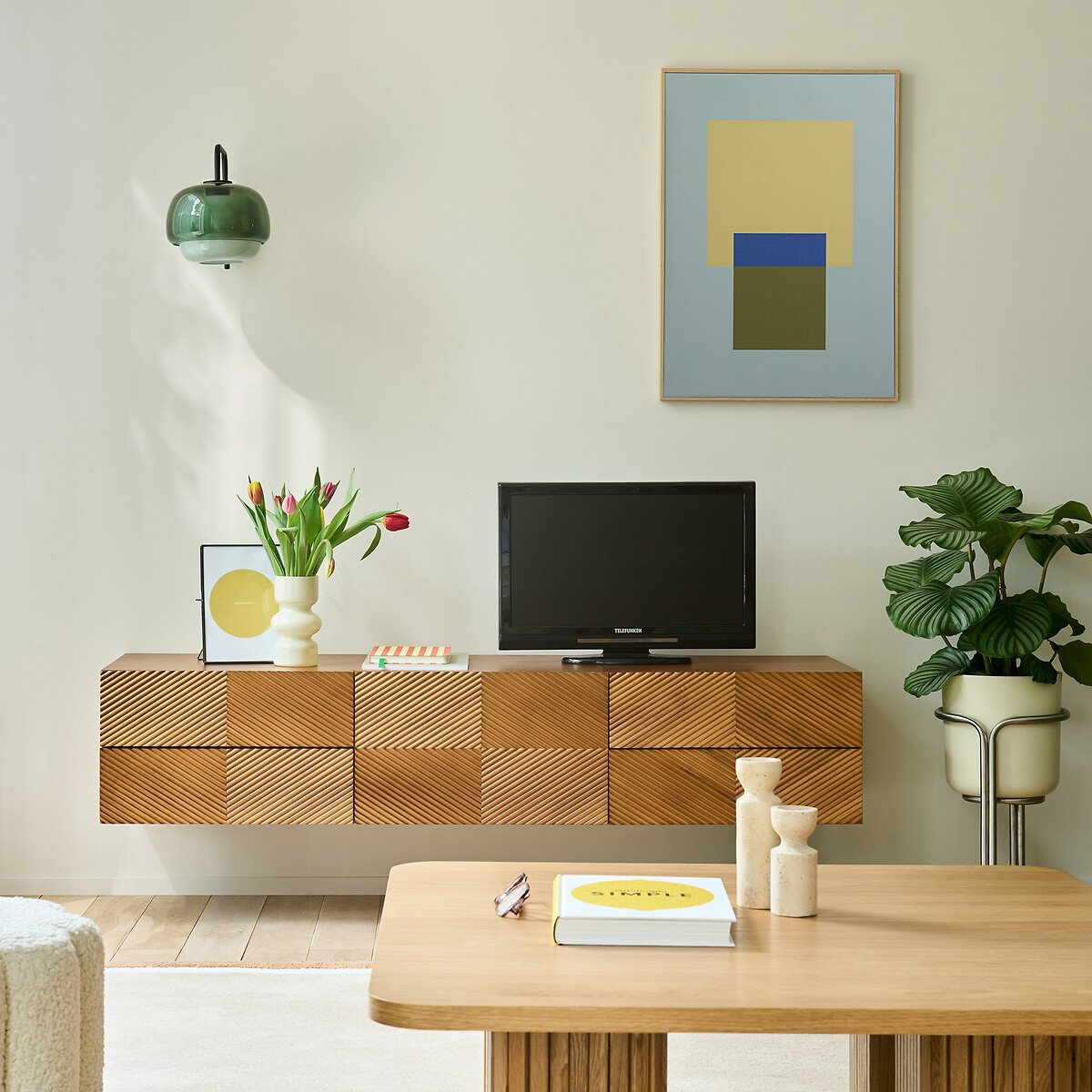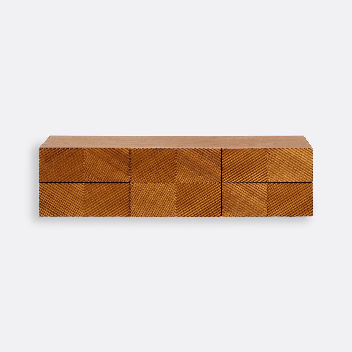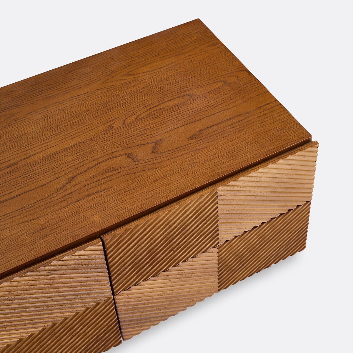 Фасад из рифленого дерева, оформленный в этническом мотиве: Коллекция Jerem / Джерем переосмысливает искусство краснодеревщиков и дух ремесленничества в современном стиле. Ее большой размер обеспечивает достаточное пространство для хранения.Закрепленная на стене, эта тумба для телевизора освобождает пространство пола и придает комнате ощущение легкости. Описание • Короб в сборе из МДФ, шпонированного дубом, морилка под орех, покрытие нитроцеллюлозным лаком • Графические узоры на фасаде, облицованном планками из дерева дуба и мореным орехом • 1 центральная распашная дверца с пневматическими цилиндрами • Одна большая ниша • 4 ящика с системой закрывания soft closing • Скошенный срез в верхней части дверец и ящиков для более простого открывания • Отверстие для кабелей • Количество человек, рекомендованное для сборки: дваКачество • Система soft closing: система плавного и бесшумного закрывания дверец, не позволяющая также прищемить пальцы.РазмерыОбщие размеры • Ширина: 150 см • Высота: 30 см • Глубина: 42 см • Вес: 41,4 кгВнутренние размеры • Большая ниша: Ш50 x В30 x Д38 см • Ящики: Ш50 x В9 x Д26,5 см • Самостоятельная сборка. • ДРЕВЕСИНА ИЗ УСТОЙЧИВО УПРАВЛЯЕМЫХ ЛЕСОВ. Наличие знака FSC® означает, что древесина, из которой изготовлено изделие, добыта с соблюдением международных стандартов: в процессе добычи не были нарушены права коренных народов, местных жителей и работников, и заготовка велась методом устойчивого лесопользования.Размеры и вес упаковкиОдна упаковка • Ш159 x В42,5 x Д51 см, 53 кг