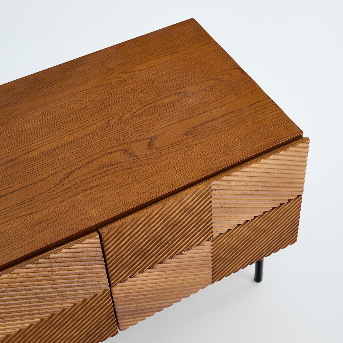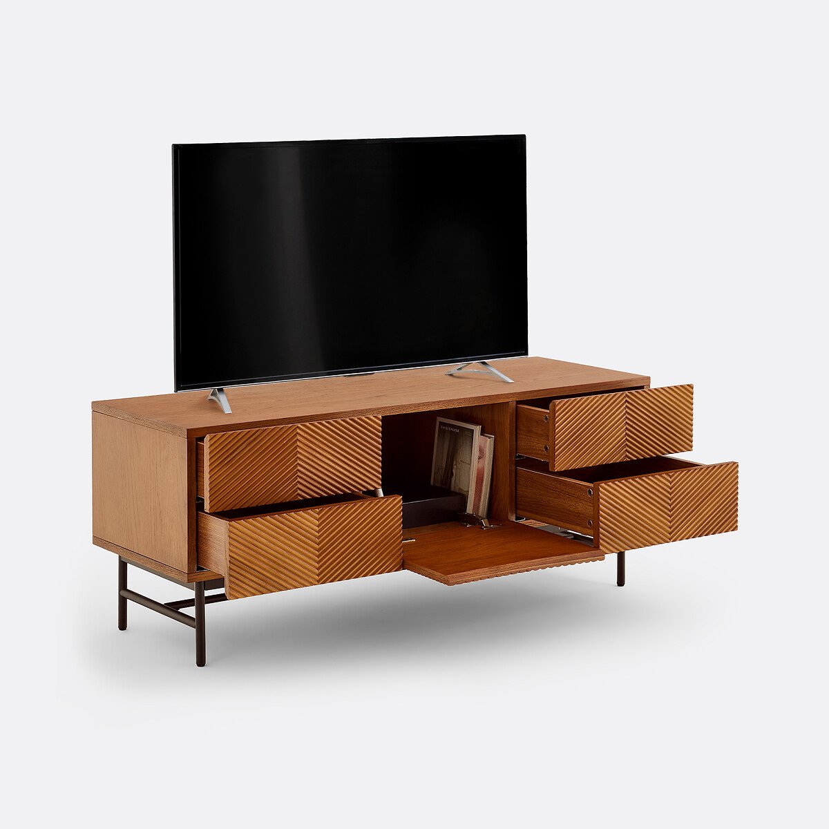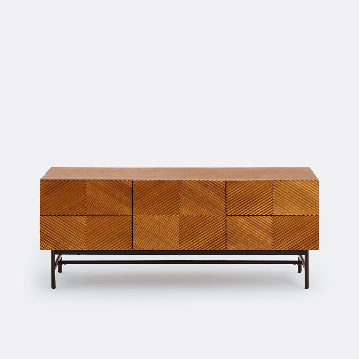 Фасад с этническим узором из рельефного дерева и стальным Н-образным основанием: Коллекция Jerem / Джерем переосмысливает искусство краснодеревщиков и дух ремесленничества в современном стиле. Ее большой размер обеспечивает достаточное пространство для хранения.Описание • Короб в сборе из МДФ, шпонированного дубом, морилка под орех, покрытие нитроцеллюлозным лаком • Графические узоры на фасаде, облицованном планками из дерева дуба и мореным орехом • H-образное основание из стальной трубы, черная краска, эпоксидное покрытие • 1 центральная распашная дверца с пневматическими цилиндрами • Одна большая ниша • 4 ящика с системой закрывания soft closing • Скошенный срез в верхней части дверец и ящиков для более простого открывания • Отверстие для кабелей • Накладки на ножки из полипропилена • Количество человек, рекомендованное для сборки: дваКачество • Система soft closing: система плавного и бесшумного закрывания дверец, не позволяющая также прищемить пальцы.РазмерыОбщие размеры • Ширина: 120 см • Высота: 48 см • Глубина: 42 см • Вес: 37 кгВнутренние размеры • Большая ниша: Ш39 x В30 x Д38 см • Ящики: Ш39 x В15 x Д26 см • Высота ножек: 18 см • Самостоятельная сборка. • ДРЕВЕСИНА ИЗ УСТОЙЧИВО УПРАВЛЯЕМЫХ ЛЕСОВ. Наличие знака FSC® означает, что древесина, из которой изготовлено изделие, добыта с соблюдением международных стандартов: в процессе добычи не были нарушены права коренных народов, местных жителей и работников, и заготовка велась методом устойчивого лесопользования.Размеры и вес упаковкиОдна упаковка • Ш128 x В46 x Д51 см, 46,5 кг