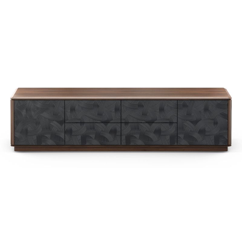 Дизайн восхищает эксклюзивным узором на черных фасадах мебели, выполненным методом тиснения. У тумбы есть четыре ящика и две дверцы, за которыми находятся еще по две полки в каждой секции.