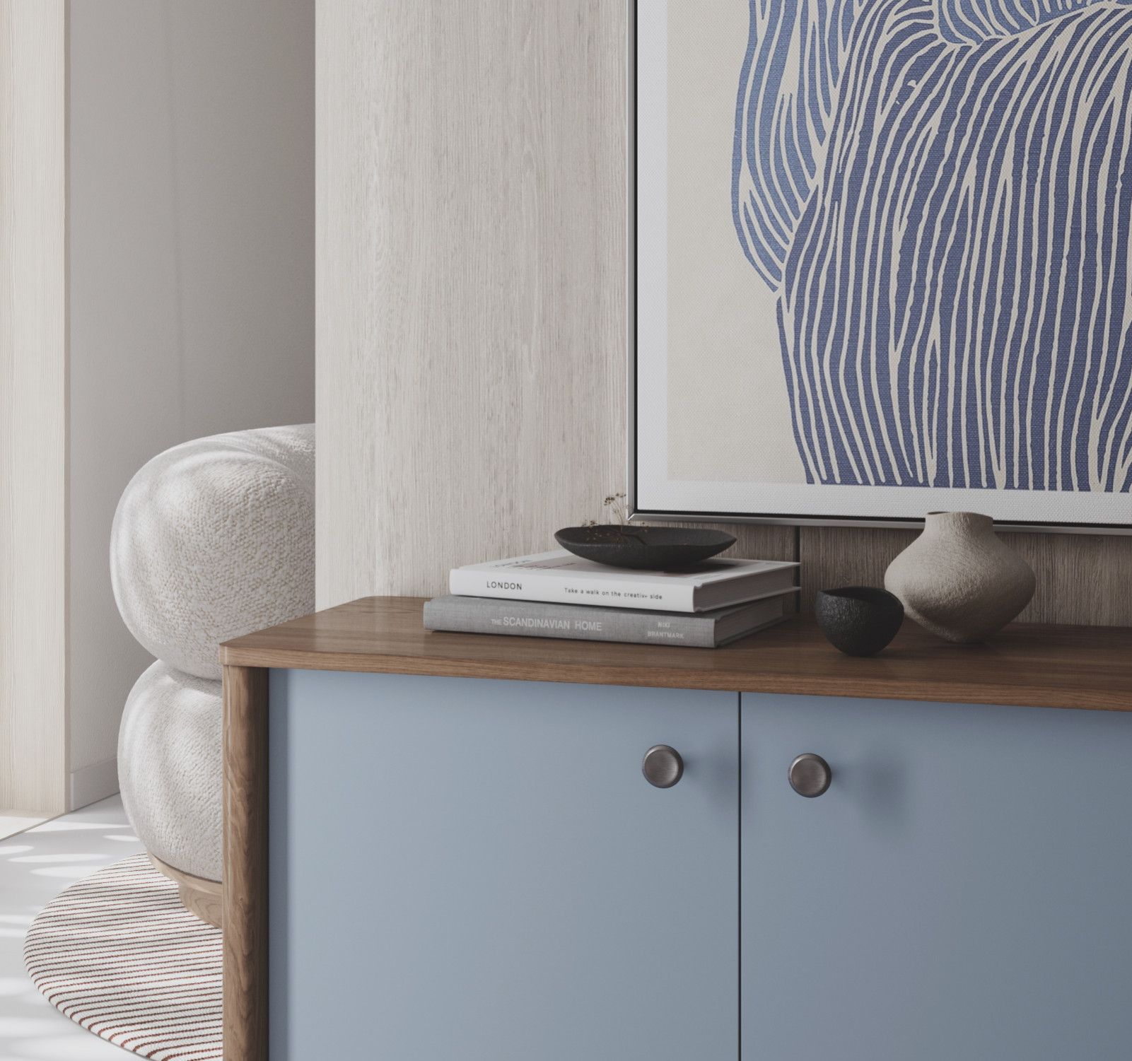 Тумба под ТВ BG074 с полками и ящиками станет украшением просторной гостиной и позволит организовать комфортное хранение вещей.
