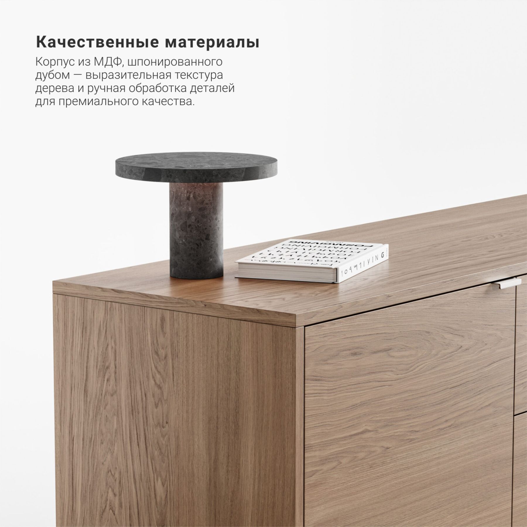 Основание и ножки выполнены из массива дуба, цвет которого вы можете выбрать из 7 вариантов. Корпус тумбы может быть покрыт эмалью или натуральным шпоном дуба. Фасады могут быть покрыты эмалью с / без гравировки или натуральным шпоном дуба.