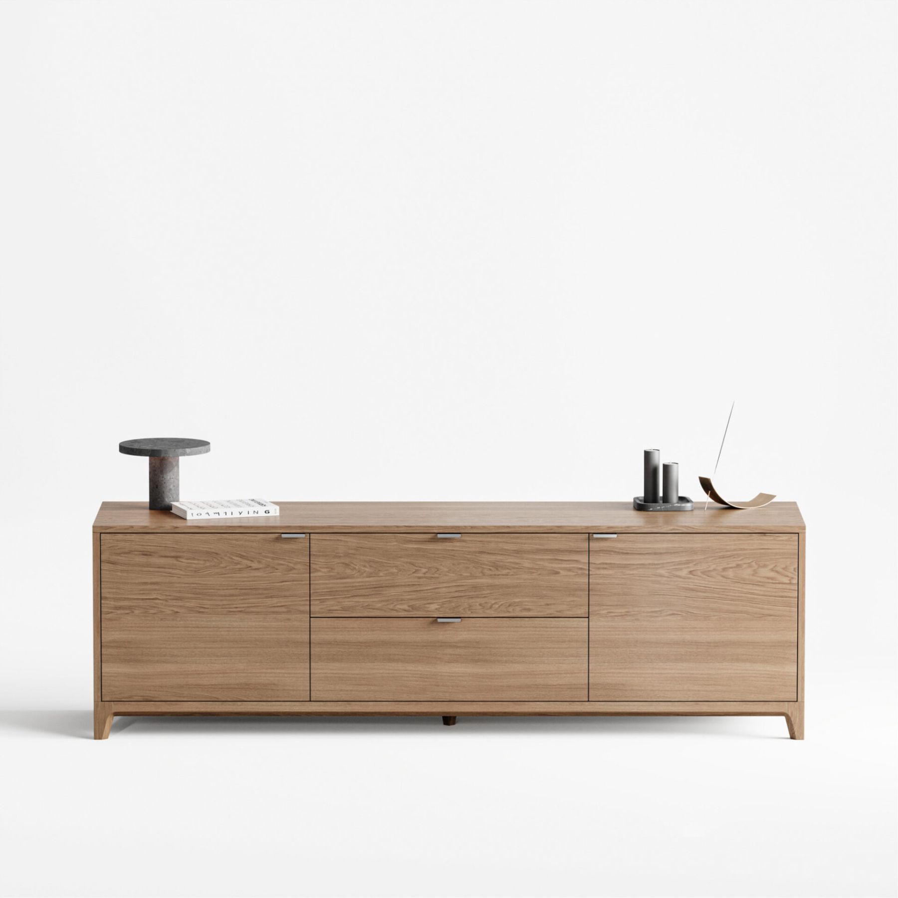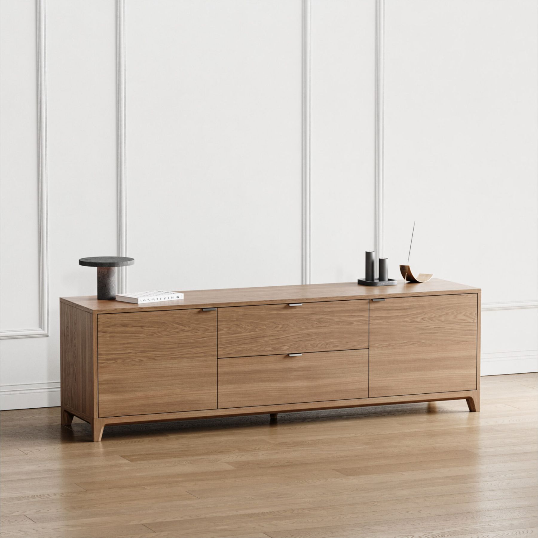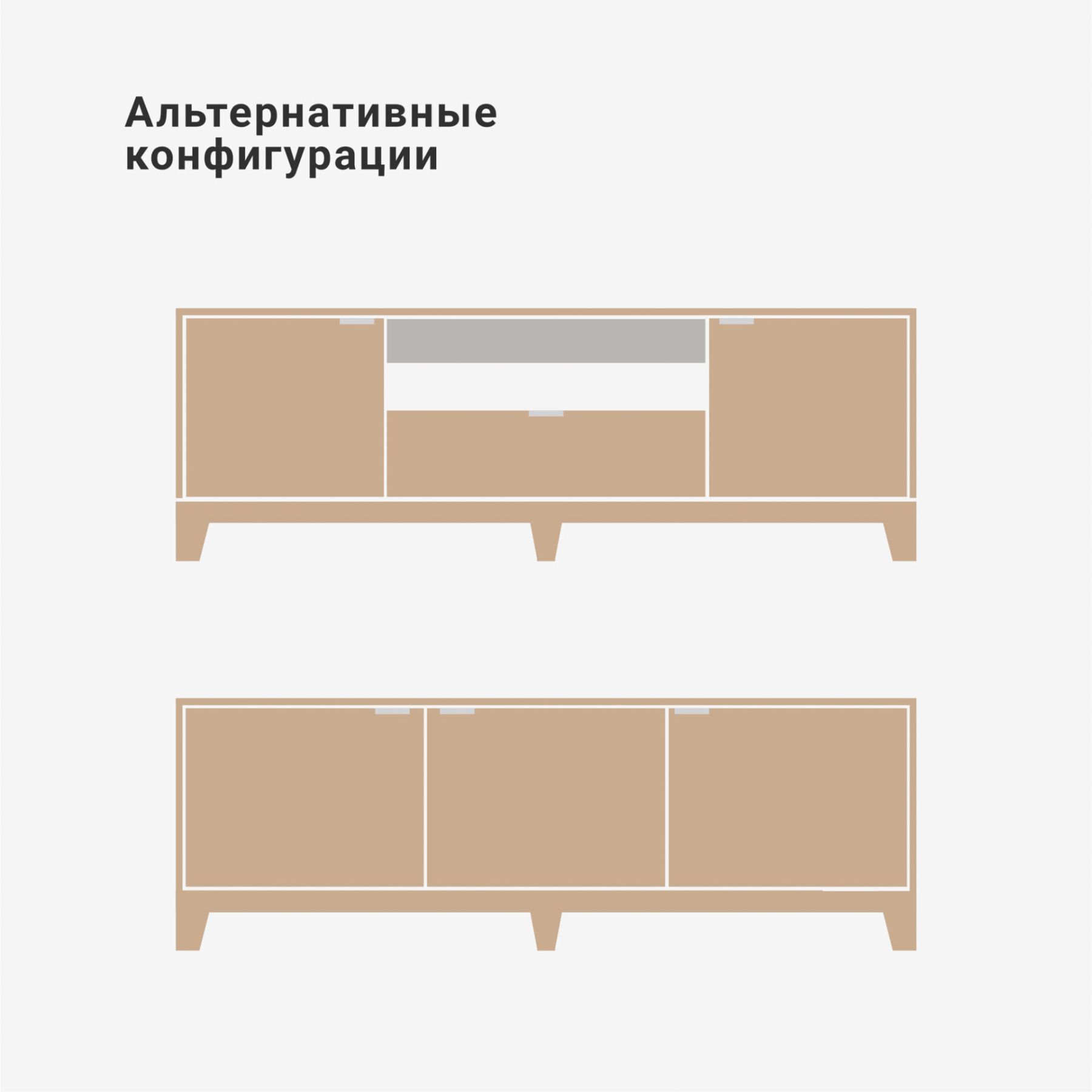 Тумба под ТВ с увеличенной длиной, станет украшением просторной гостиной и позволит организовать комфортное хранение вещей. Внутреннее наполнение тумбы состоит из двух выдвижных ящиков и двух боковых секций с полками, положение которых можно регулировать.