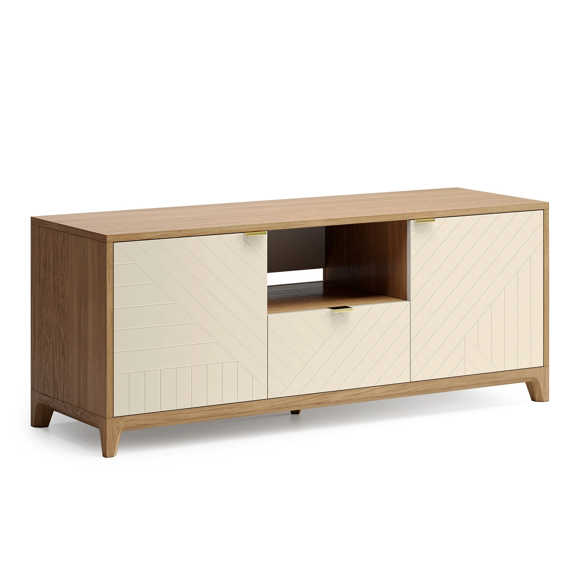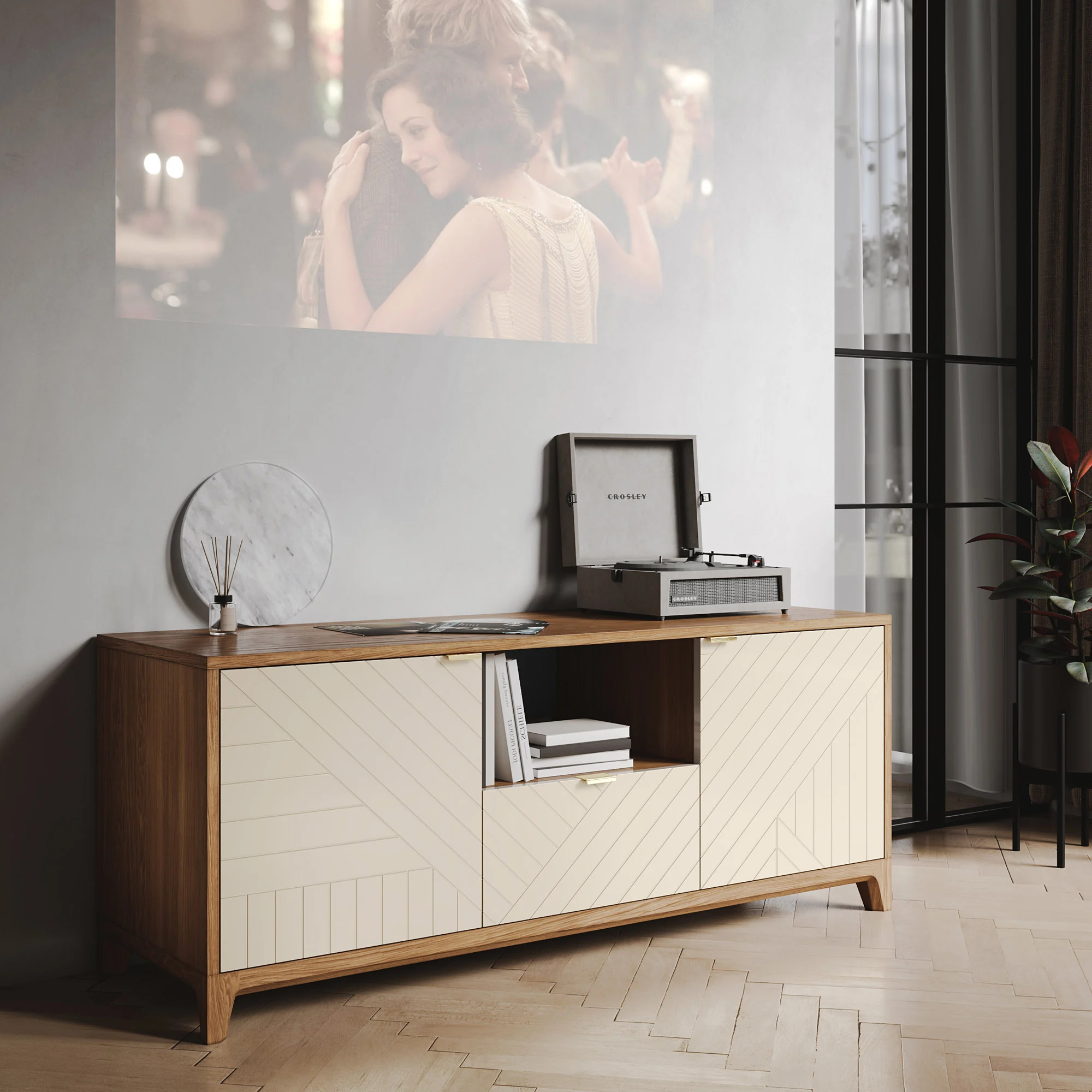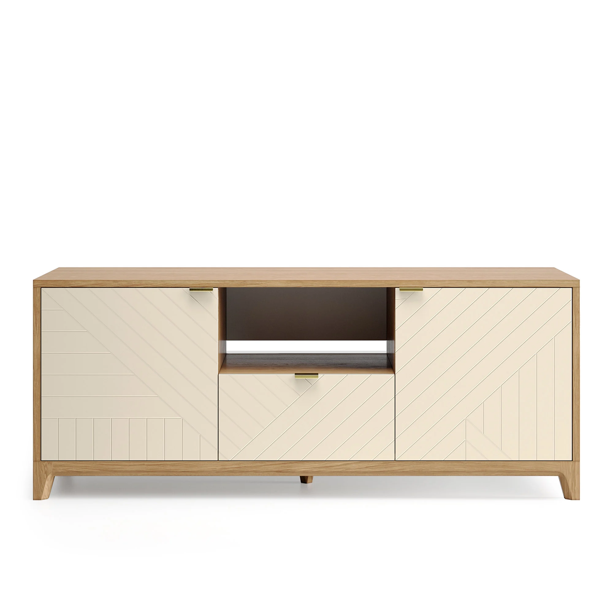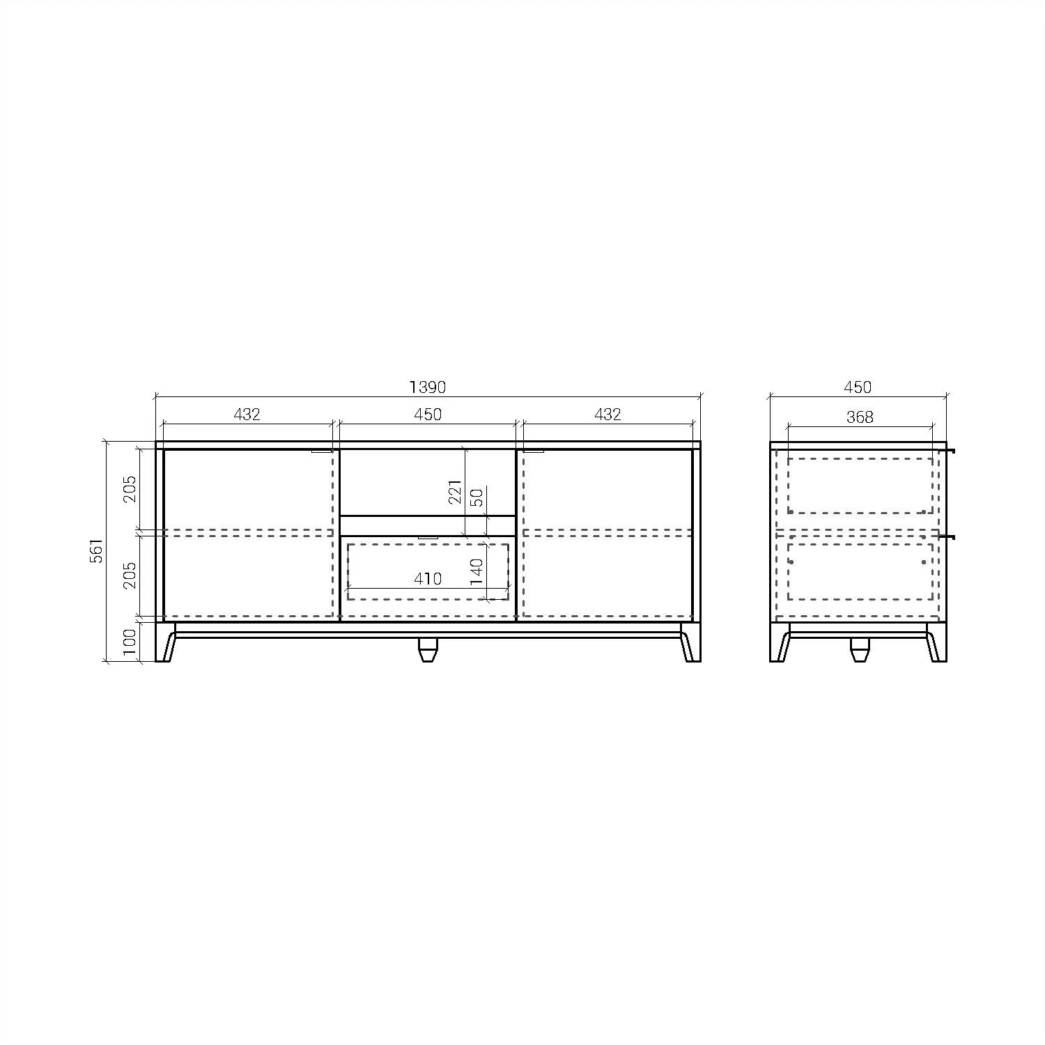 Простой и лаконичный дизайн, гравировка на фасадах, изящные ножки из массива дерева, продуманные габариты гармонично сочетаются в этой тумбе под ТВ. Коллекции книг, журналов и другие приятные мелочи, включая объемные предметы, вы сможете разместить внутри данной ТВ тумбы.