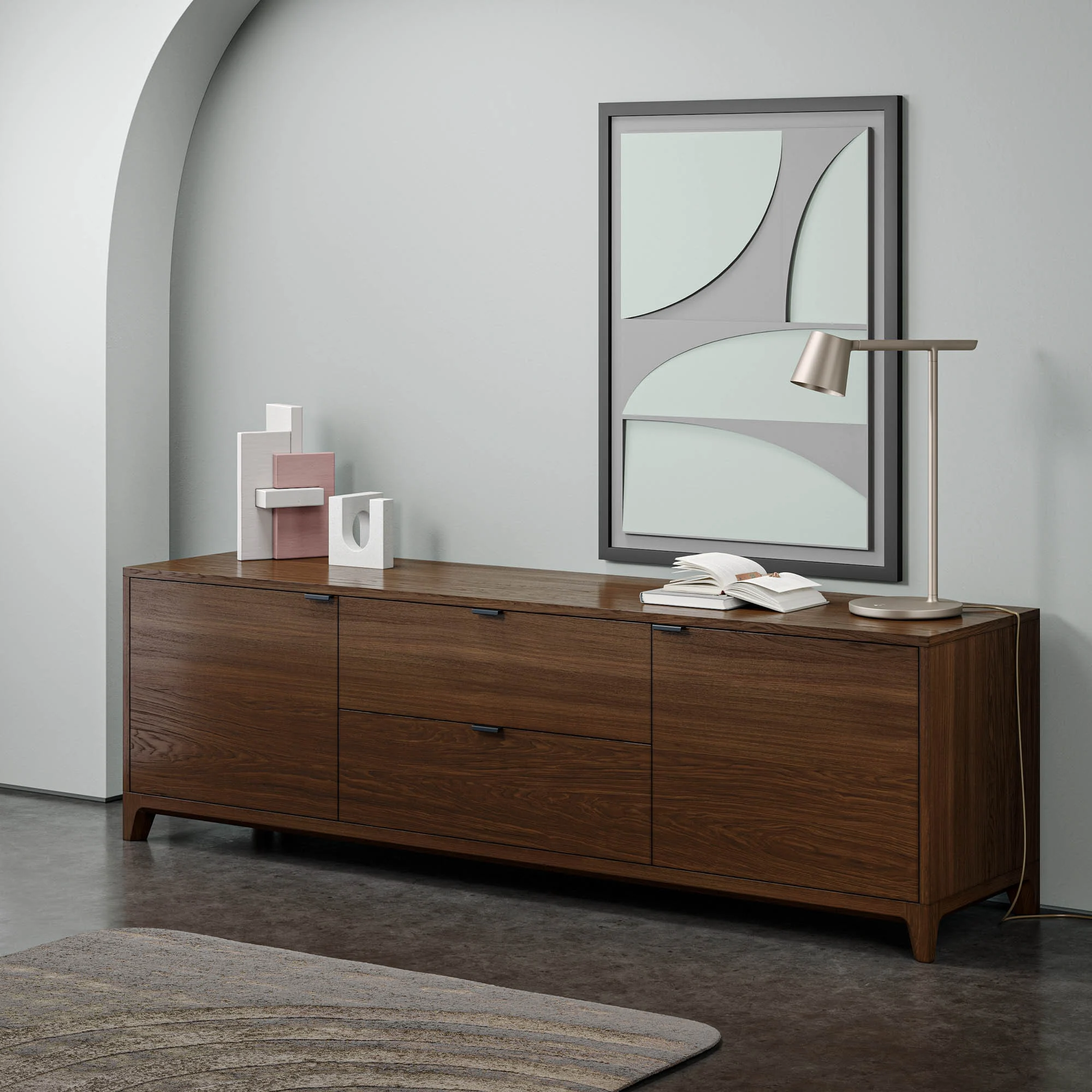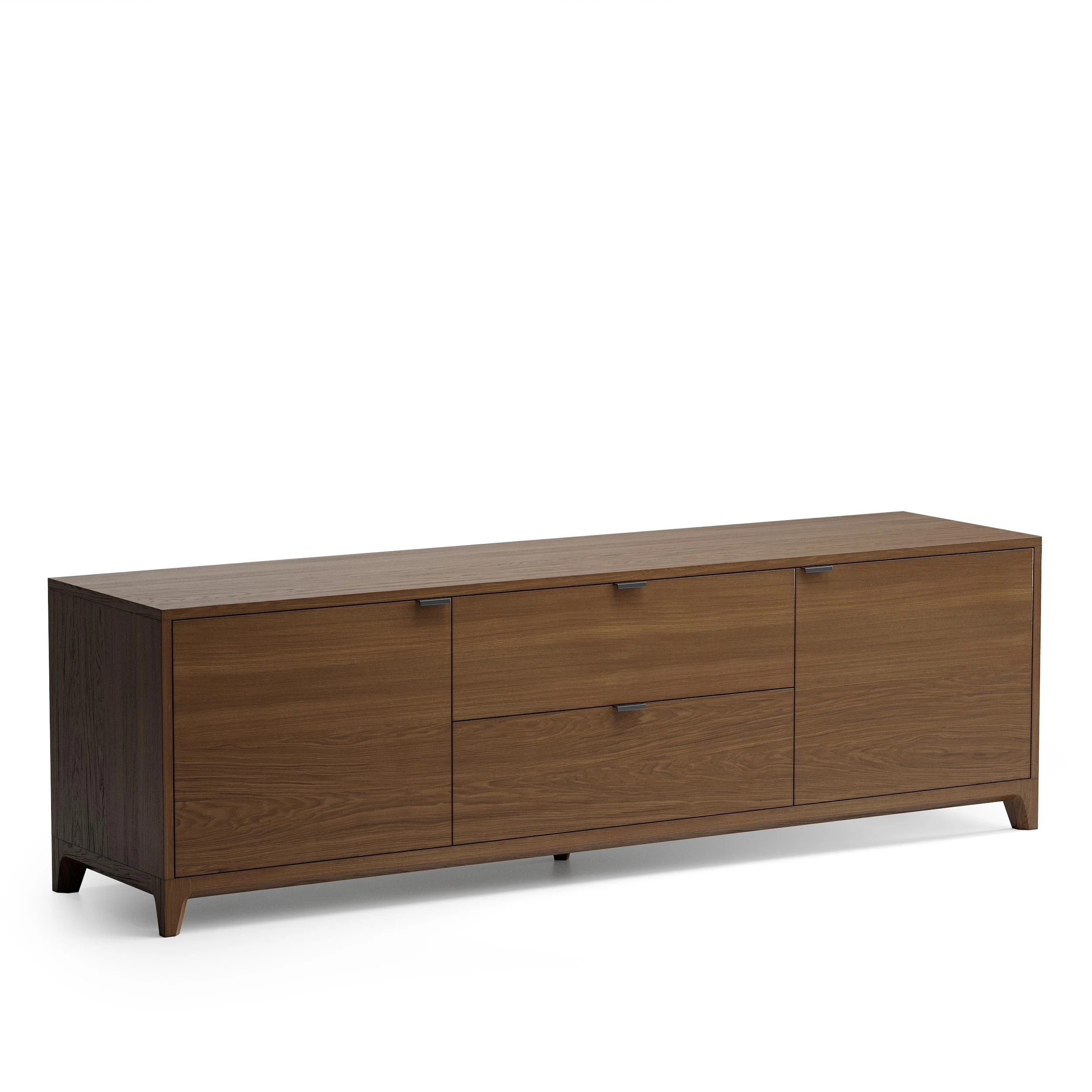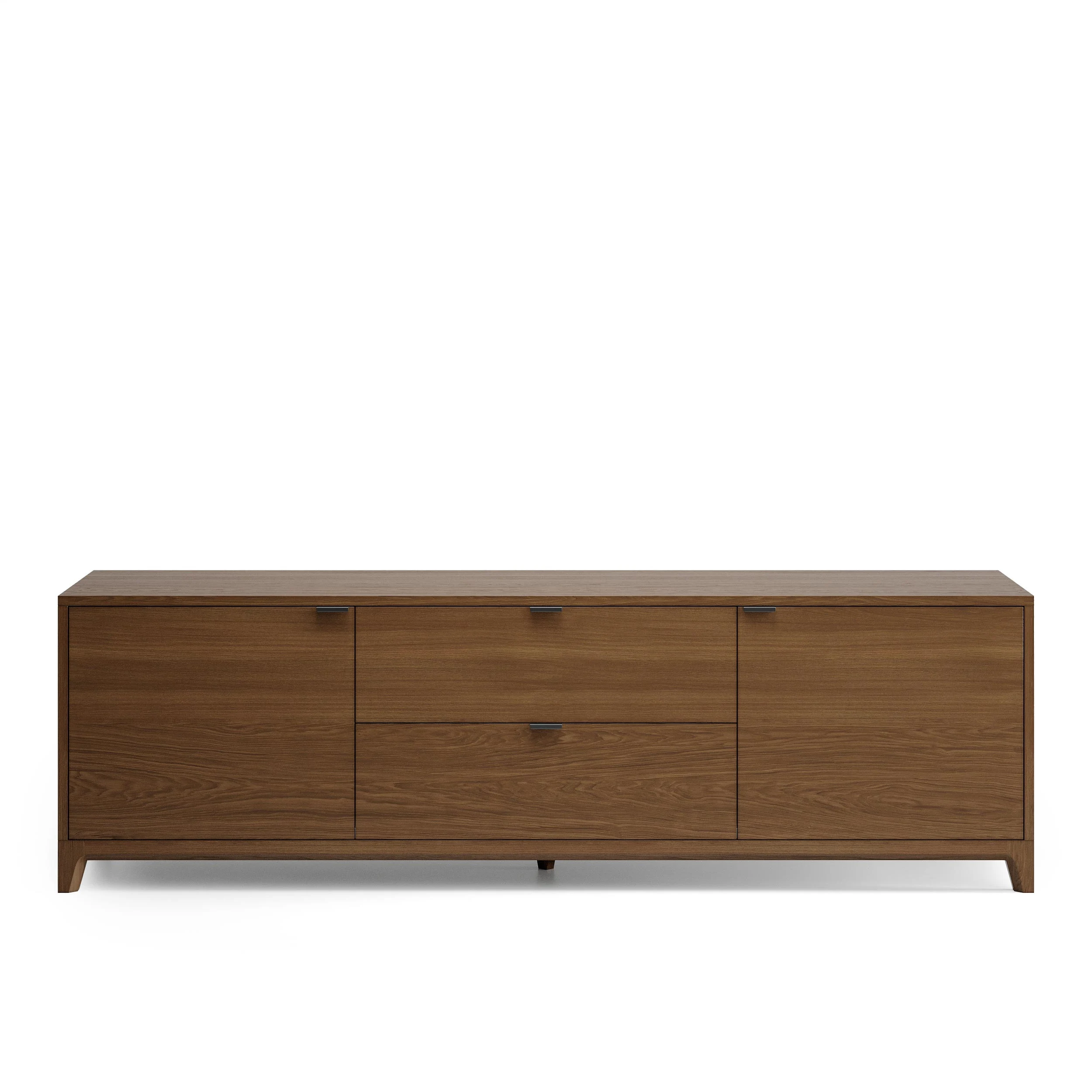 Внутреннее наполнение тумбы состоит из двух выдвижных ящиков и двух боковых секций с полками, положение которых можно регулировать. Отличительной особенностью мебели из серии CASE является вариативность ее исполнения. Выбирайте оттенок эмали, материал корпуса, тонировку основания и ножек, а также дизайн гравировки. Кроме того, вы можете заказать тумбу под ТВ, которая будет полностью покрыта натуральным шпоном дуба.
