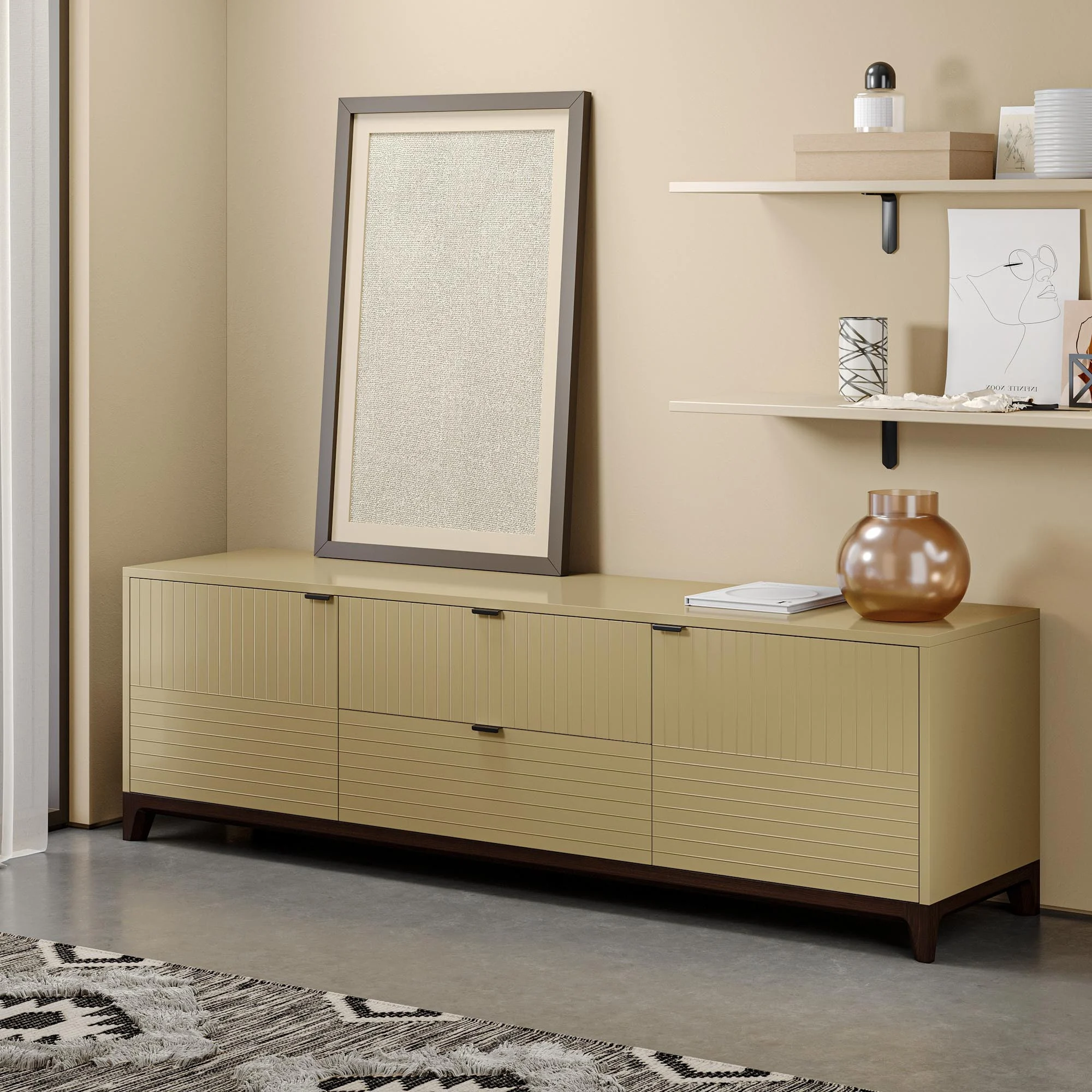 Тумба под ТВ с увеличенной длиной, станет украшением просторной гостиной и позволит организовать комфортное хранение вещей.