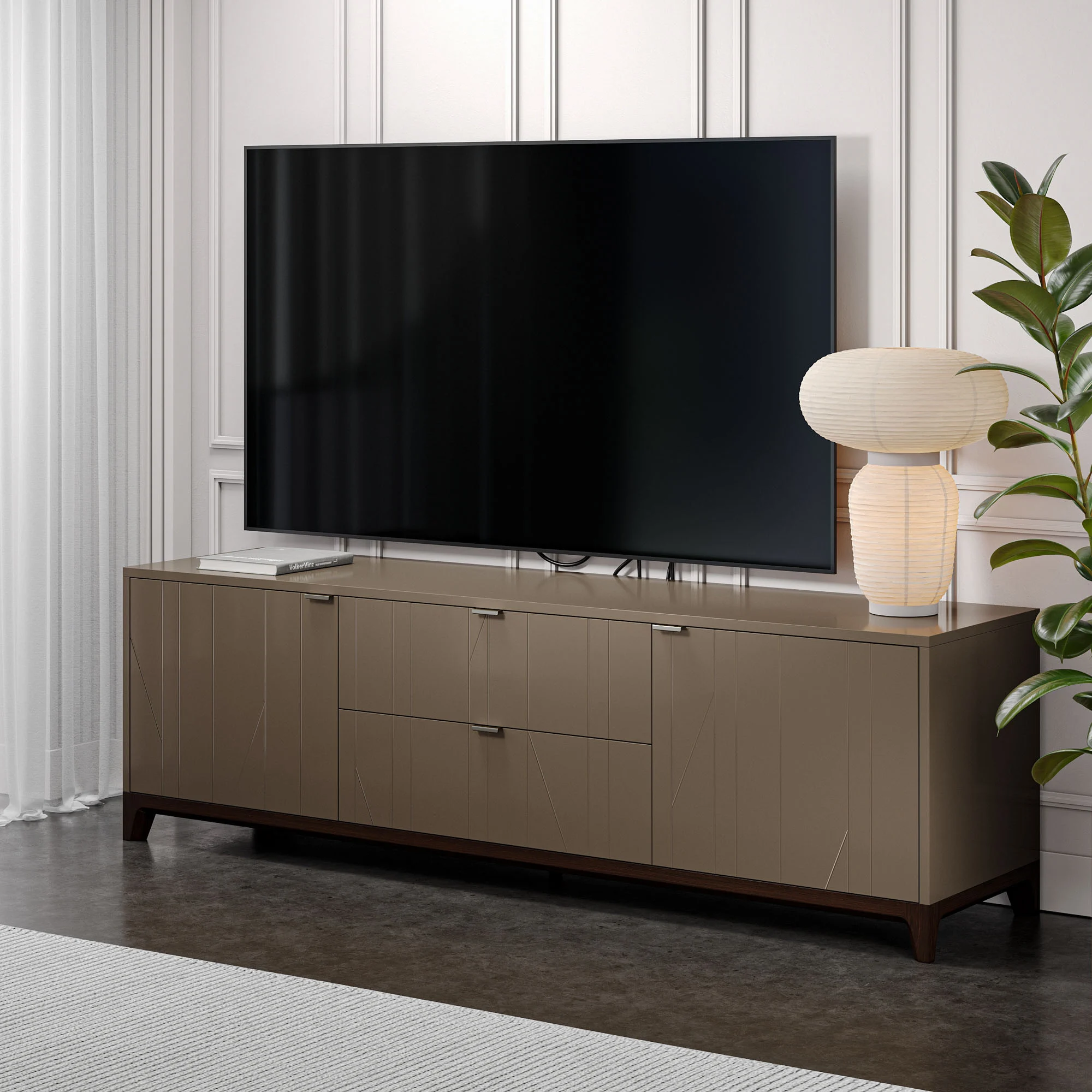 Тумба под ТВ с увеличенной длиной, станет украшением просторной гостиной и позволит организовать комфортное хранение вещей.