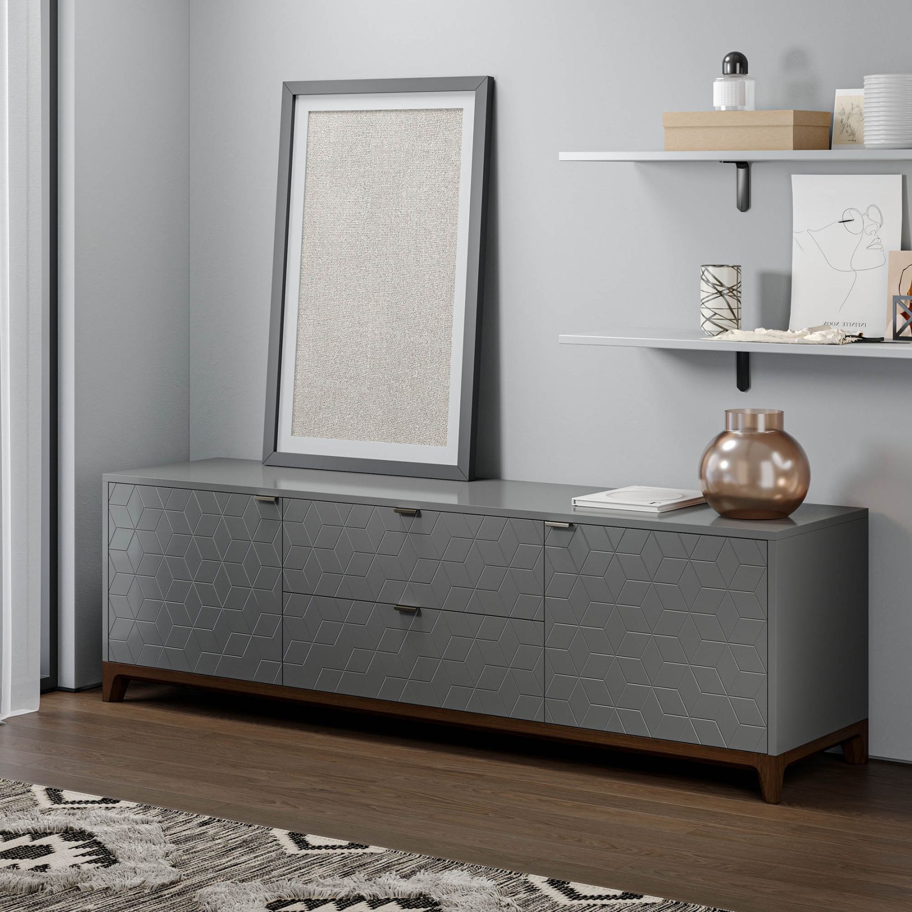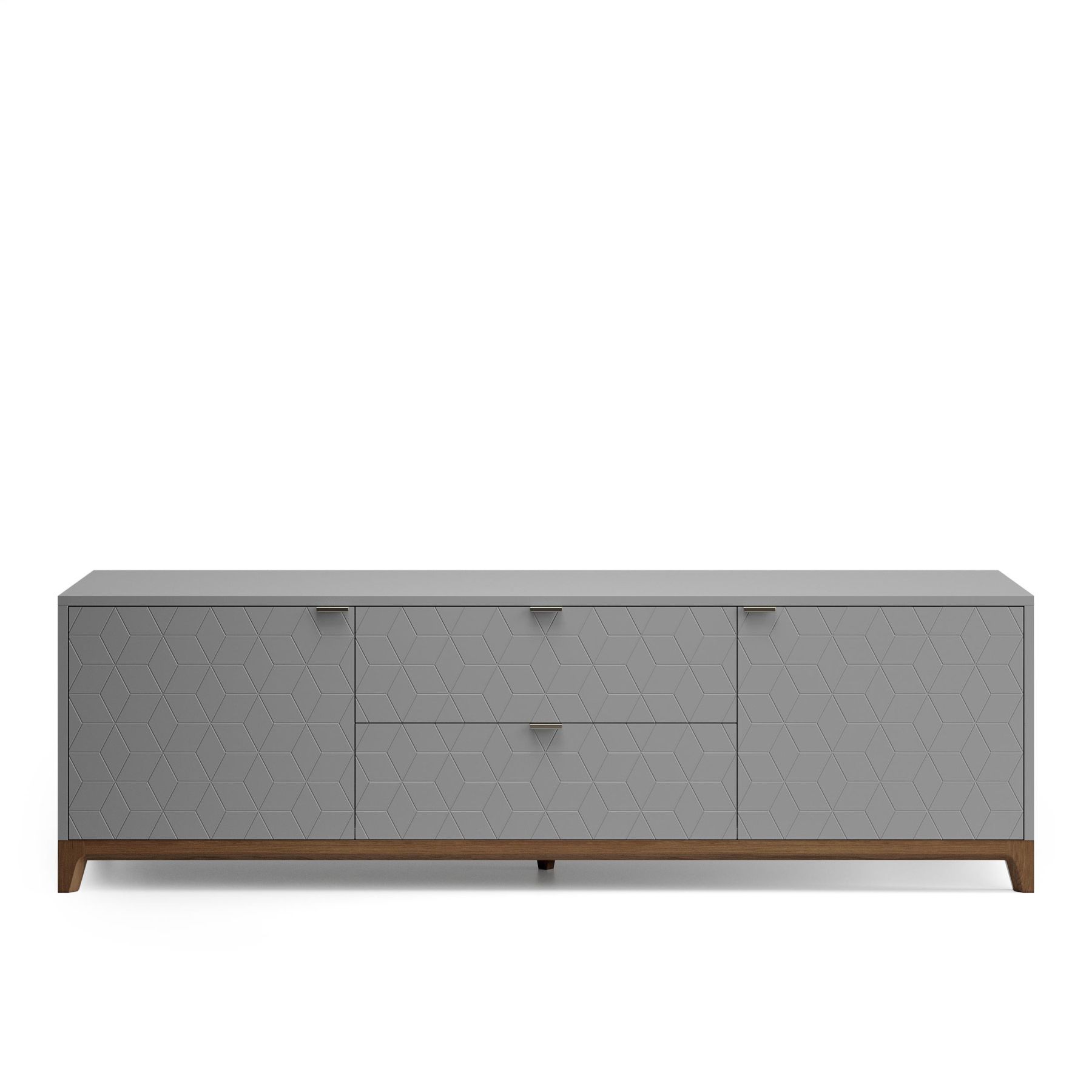 Внутреннее наполнение тумбы состоит из двух выдвижных ящиков и двух боковых секций с полками, положение которых можно регулировать. Отличительной особенностью мебели из серии CASE является вариативность ее исполнения. Выбирайте оттенок эмали, материал корпуса, тонировку основания и ножек, а также дизайн гравировки. Кроме того, вы можете заказать тумбу под ТВ, которая будет полностью покрыта натуральным шпоном дуба.
