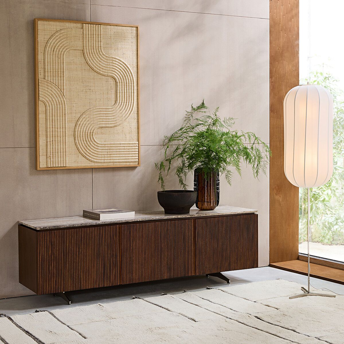 Тумба, дверцы и полка из МДФ, шпонированного ореховым деревом и покрытого нитроцеллюлозным лаком;