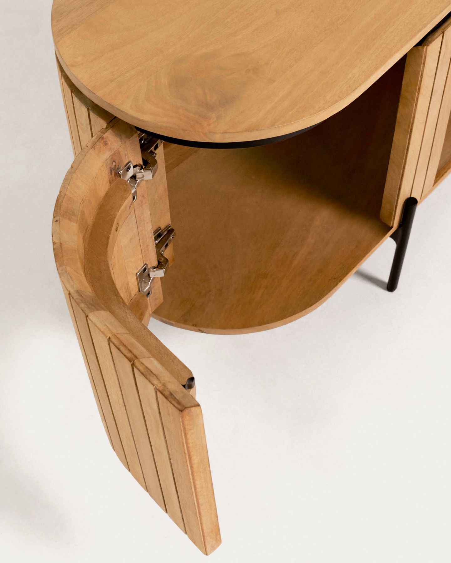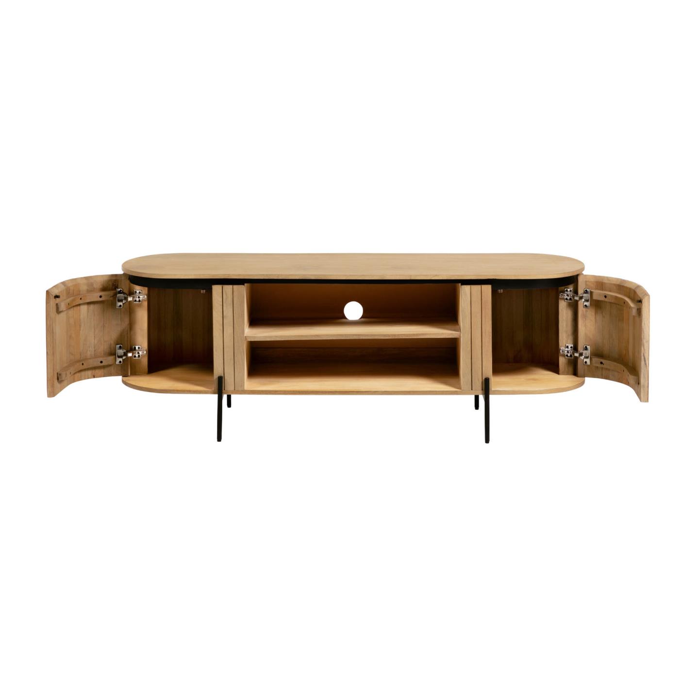 Тумба под ТВ Lucia от фабрики La Forma – необычная конструкция, ценная порода дерева. Тумба под ТВ Lucia – это яркий и впечатляющий предмет интерьера. Дощатая структура, натуральным массив и изогнутые двери – все это уникальные особенности модели. Тумба привнесет в городской интерьер не просто тепло и уют вместе с массивом, но и создаст особый колорит «южной» мебели, с эмоциональным темпераментом. Тумба имеет овальную форму, оснащена двумя ящиками и одной полкой. Она полностью сделана из дерева манго, которое отличается прочностью и долговечностью. Для защиты от негативных внешних воздействий массив покрыт специальной пропиткой. Сзади полки есть отверстие для вывода ТВ кабеля диаметром 6,5 см. Двери имеют дуговую форму и дощатую конструкцию. Они открываются наружу, слева-направо. Внутри каждого отделения предусмотрено по одной полке. Удерживают тумбу две металлические стойки черного цвета с порошковым покрытием. Ножки высотой 12 см имеют войлочные наконечники для защиты напольного покрытия от повреждений и регулировки высоты. Размеры изделия: длина – 160 см, глубина – 43 см, высота – 56 см. Вес – 40 кг. Потребуется сборка, которая займет 10 минут. В коллекции Lucia также есть комод с аналогичным дизайном.