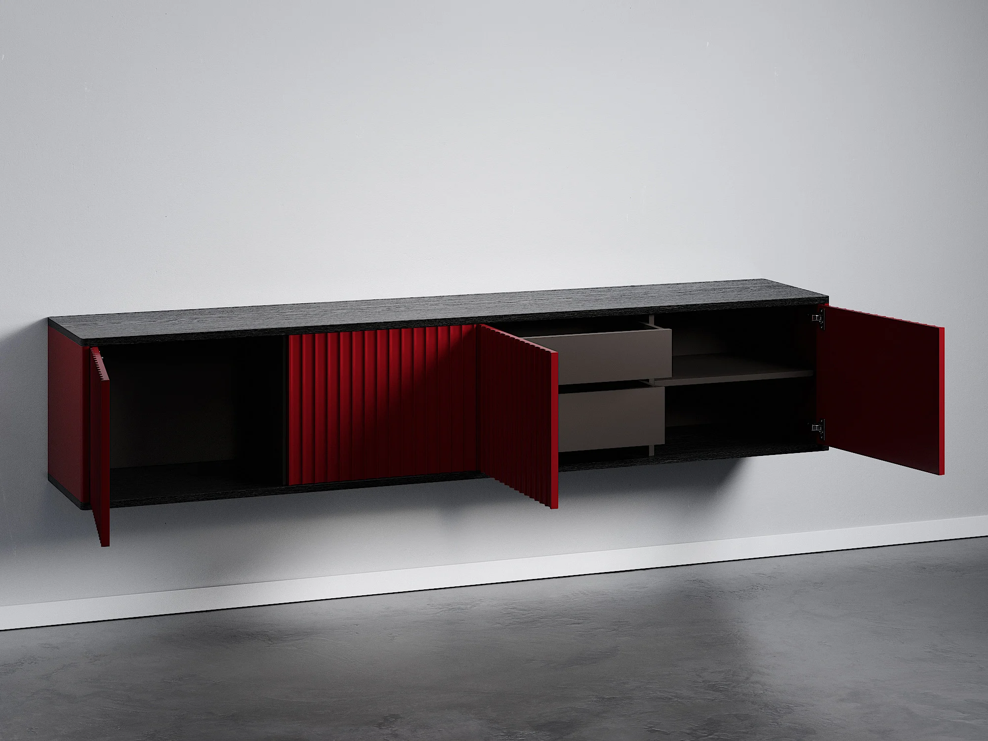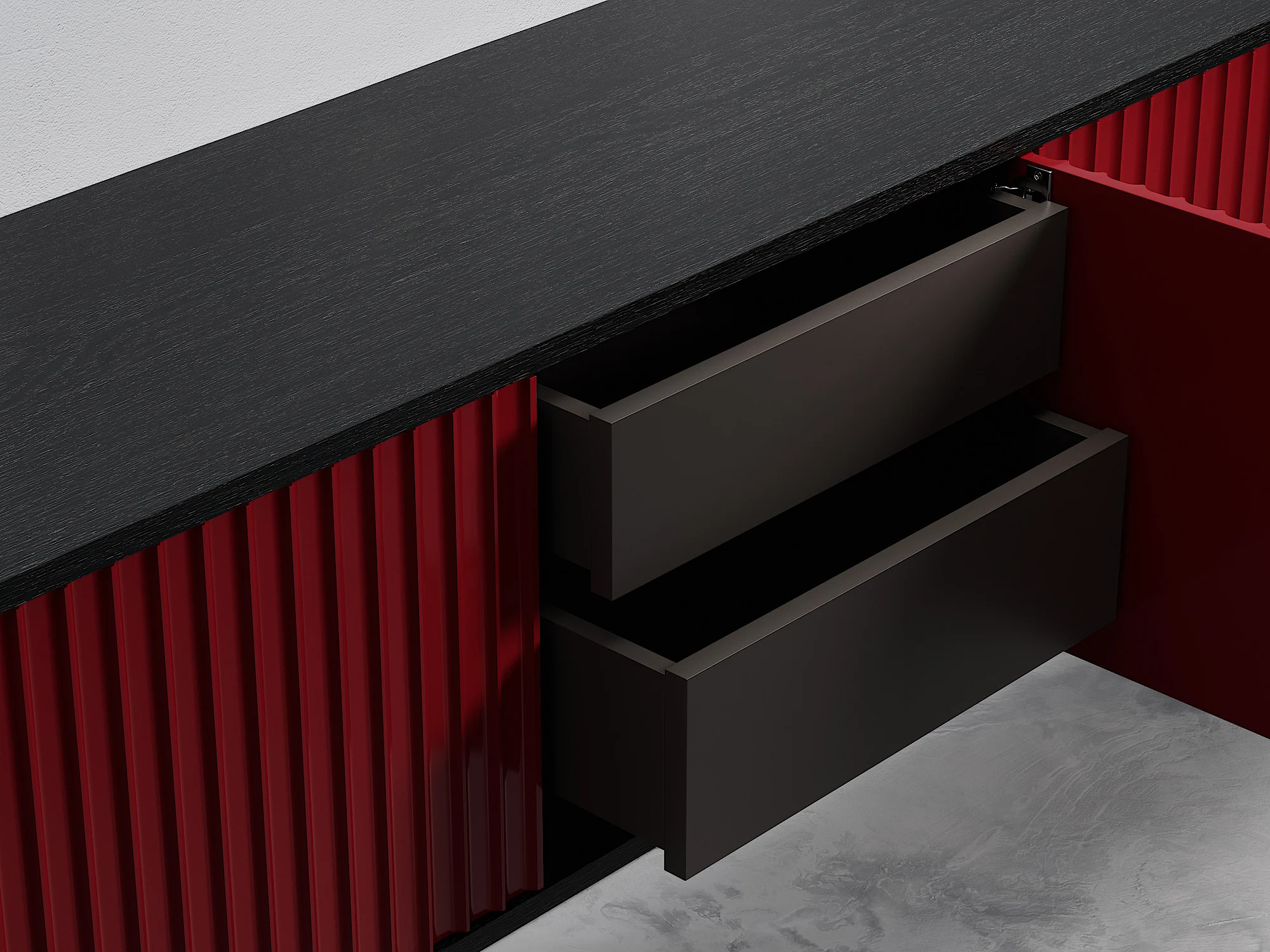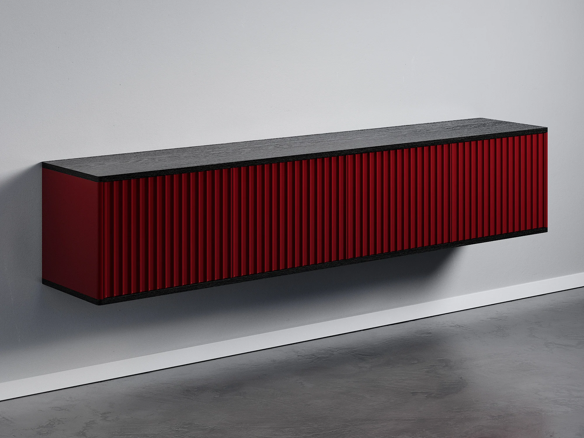Впечатляющий дизайн подвесной тумбы с полками и ящиками….. не оставит никого равнодушным. Игра теней на фасадах, строгие линии объемного узора и закругленные углы придают изделию особую элегантность и уют. Незаметная граница между дверцами обеспечивается аккуратными примыканиями деталей с минимальным зазором. Дверцы тумбы открываются от легкого нажатия на фасады. Ход направляющих ящиков мягкий и бесшумный. Крепеж к стене для подвесных изделий не предусмотрен в стандартной комплектации, поскольку каждый тип перегородок требует своего специфического крепежа.