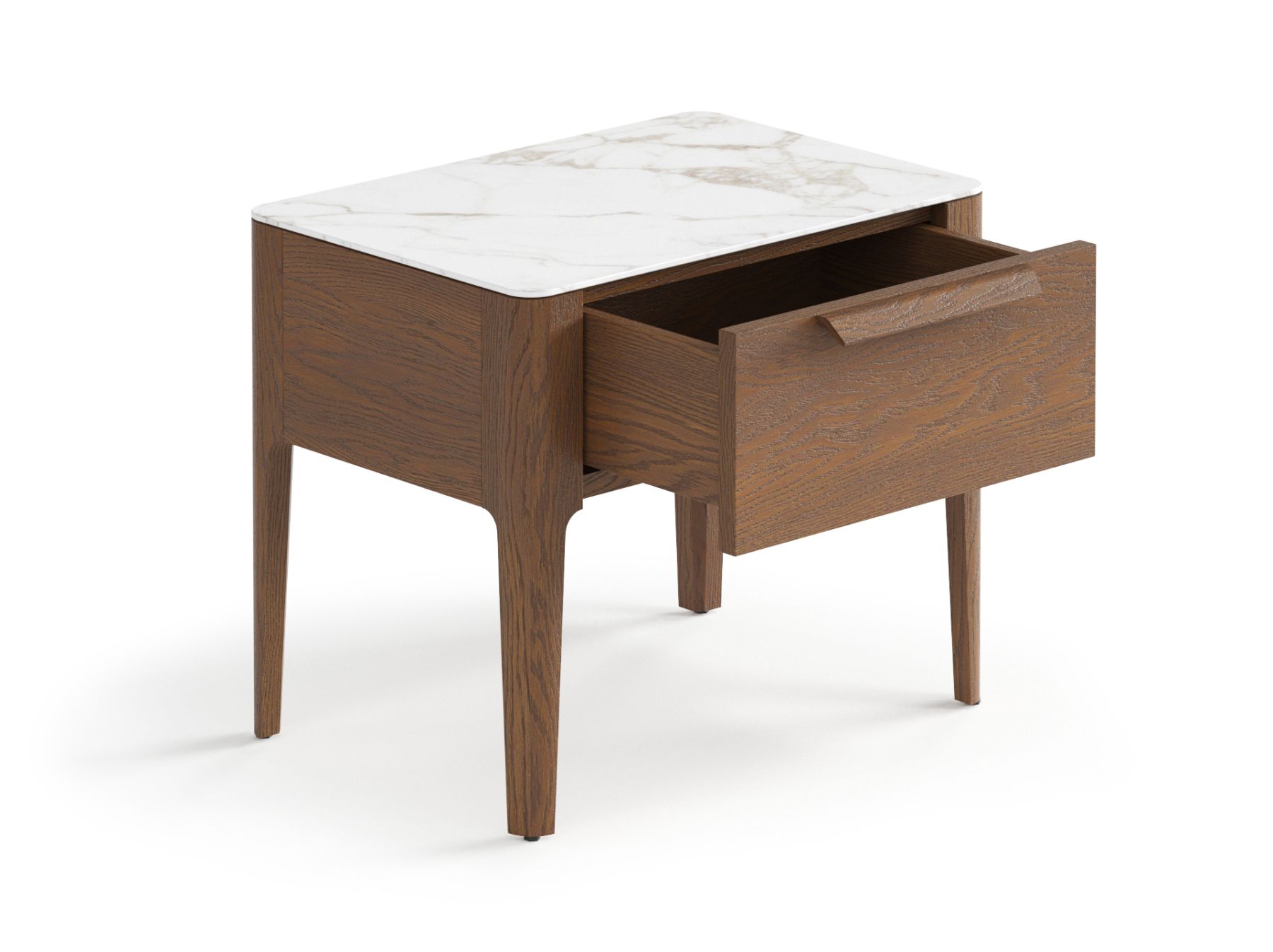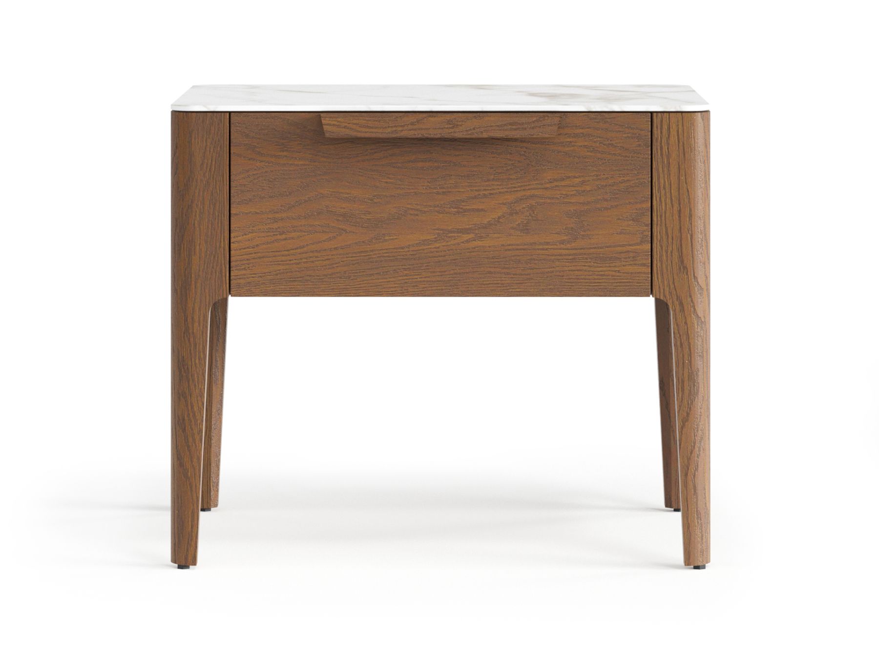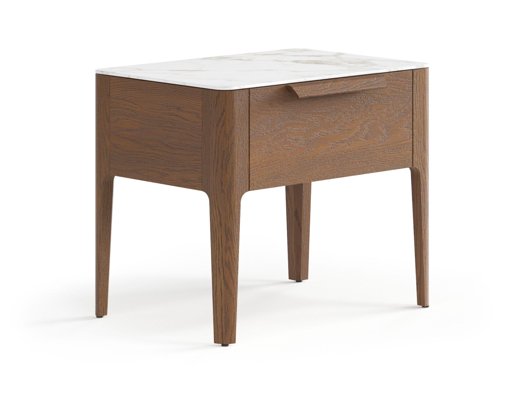 Стильная тумба с одним выдвижным ящиком гармонично впишется в интерьер спальни. Древесные в цвет корпуса опоры из массива лаконичны и надёжны. Сглаженные формы приятны на вид и на ощупь, придают изделию индивидуальность и спокойствие.