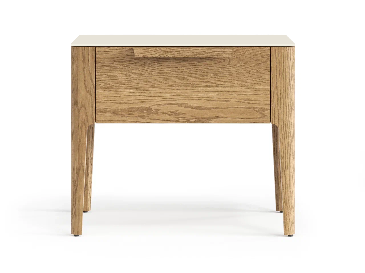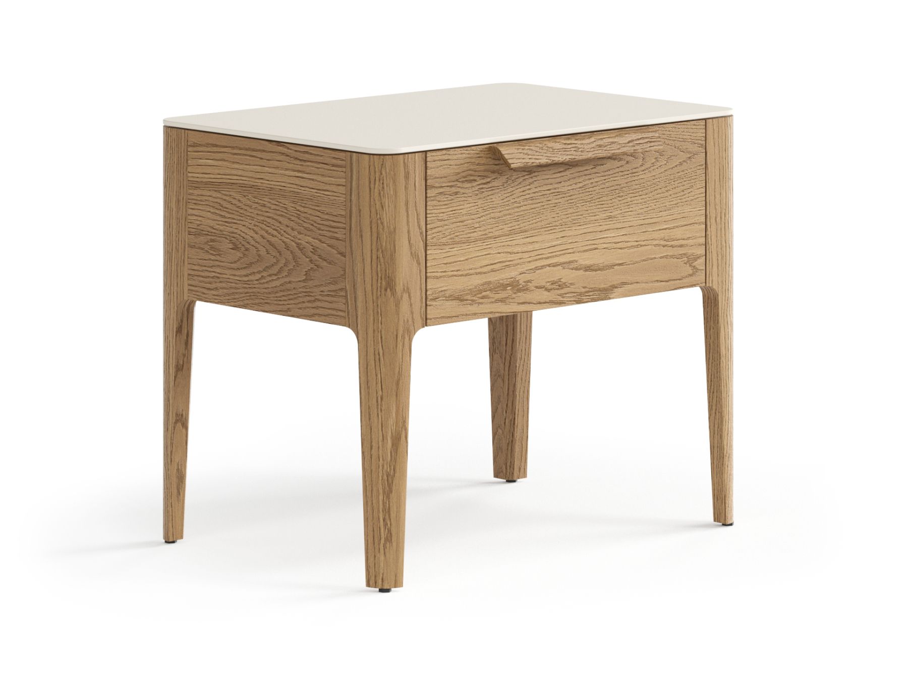 Стильная тумба с одним выдвижным ящиком гармонично впишется в интерьер спальни. Древесные в цвет корпуса опоры из массива лаконичны и надёжны. Сглаженные формы приятны на вид и на ощупь, придают изделию индивидуальность и спокойствие. Аккуратная ручка в форме крыла создана специально для удобного захвата, а механизм продуман до мелочей — тихий и плавный, он делает ежедневное пользование изделием максимально комфортным.