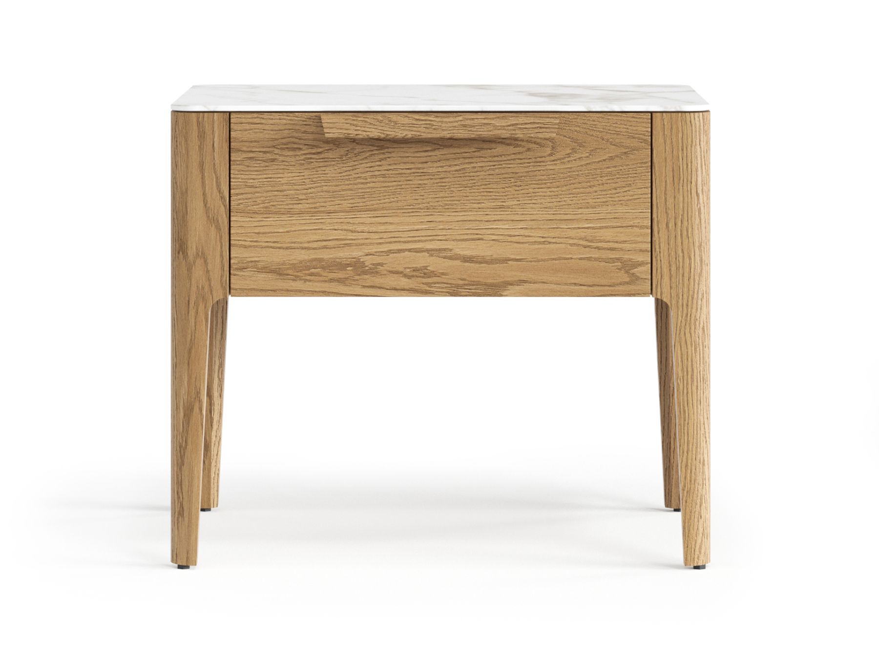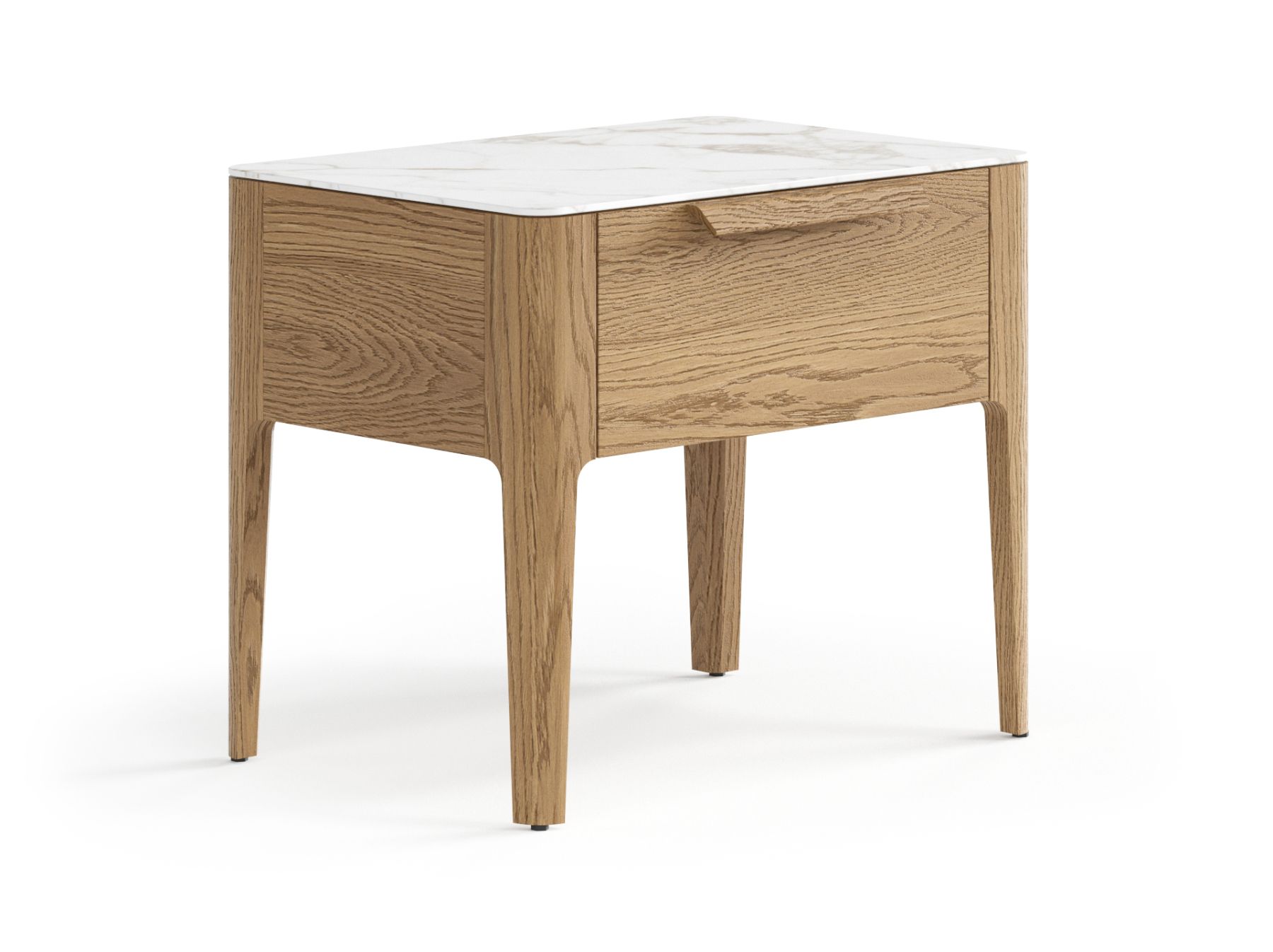 Стильная тумба с одним выдвижным ящиком гармонично впишется в интерьер спальни. Древесные в цвет корпуса опоры из массива лаконичны и надёжны. Сглаженные формы приятны на вид и на ощупь, придают изделию индивидуальность и спокойствие.