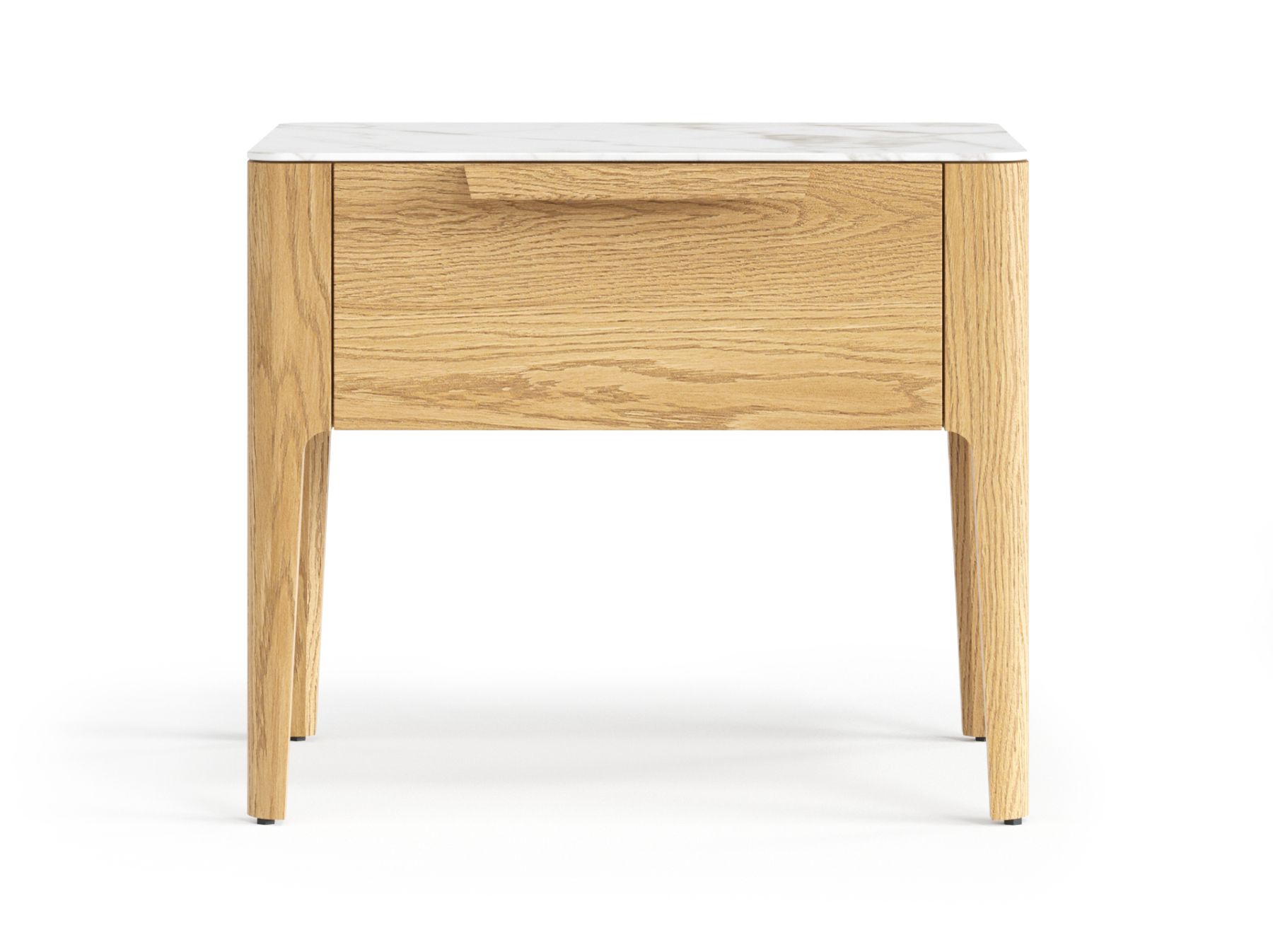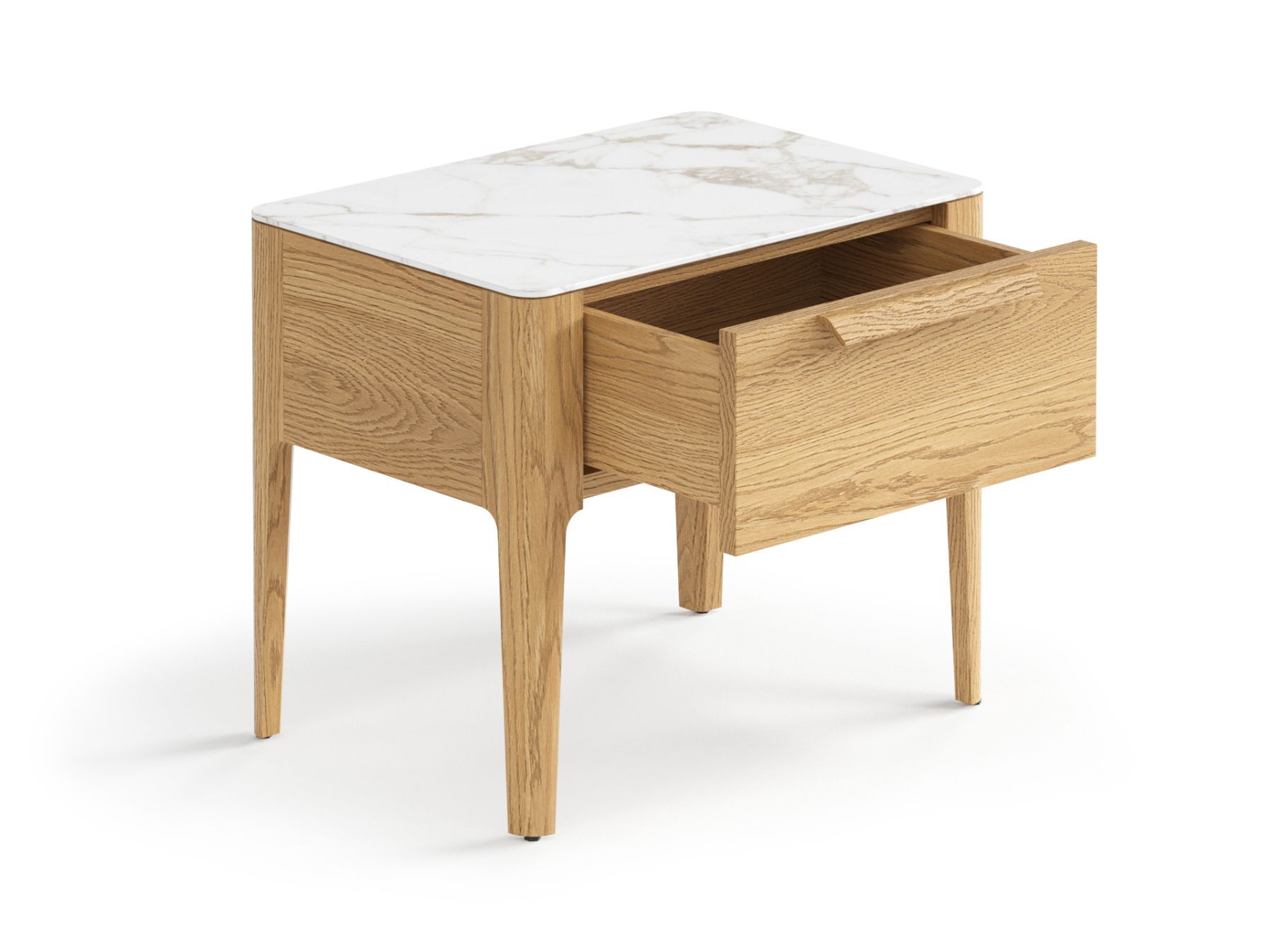 Стильная тумба с одним выдвижным ящиком гармонично впишется в интерьер спальни. Древесные в цвет корпуса опоры из массива лаконичны и надёжны. Сглаженные формы приятны на вид и на ощупь, придают изделию индивидуальность и спокойствие.
